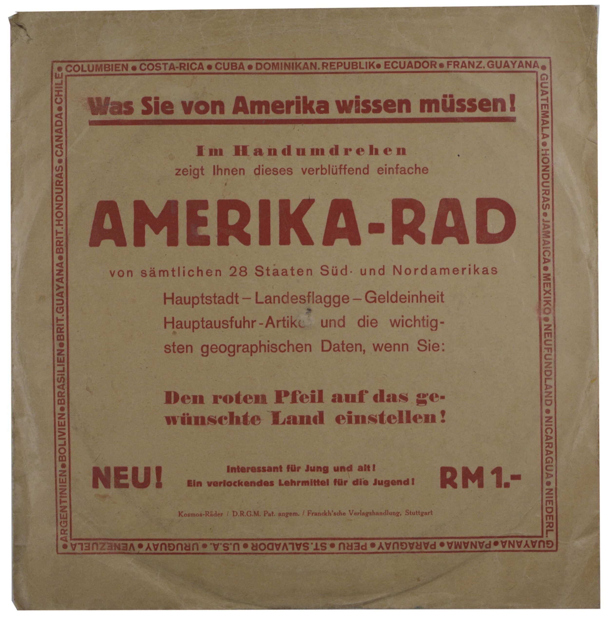 AMERIKA –  Amerika-Rad. Was Sie von Amerika wissen müssen! Im Handumdrehen zeigt Ihnen dieses verblüffend einfache Amerika-Rad von sämtlichen 28 Staaten Süd- und Nordamerikas Hauptstadt – Landesflagge – Geldeinheit… Stuttgart, Franck’sche Verlagshandlung, O.J. (um 1930). 4°. Zwei übereinander montierte farbige Scheiben. Originalumschlag mit Titel, (Umschlag etwas angestaubt und leicht knittrig).
