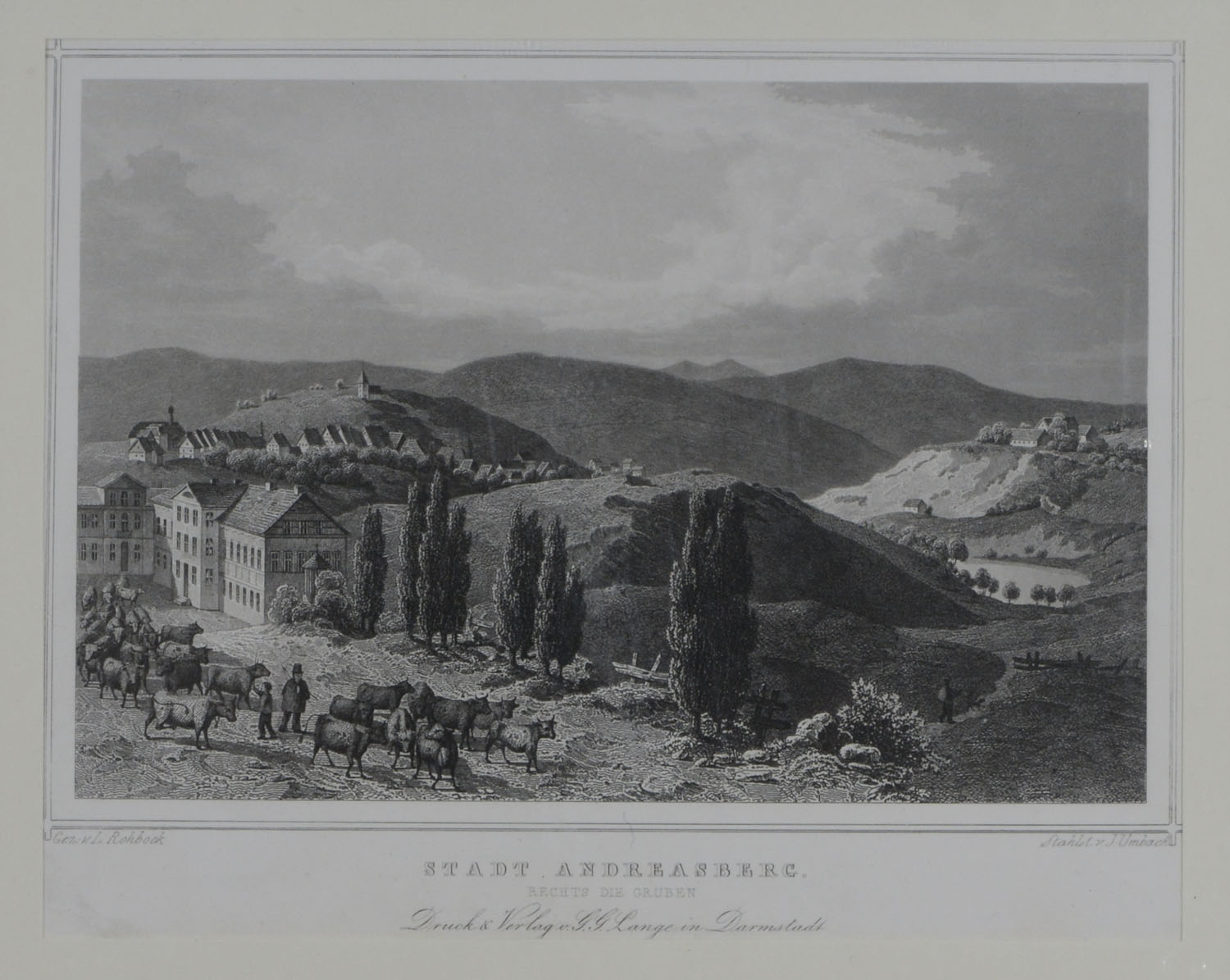 ANDREASBERG/Harz. Gesamtansicht von Andreasberg bei Goslar mit den Gruben. 1858. Stahlstich von Umbach nach Rohbock, 12,3×17,7, Sauberes Blatt.