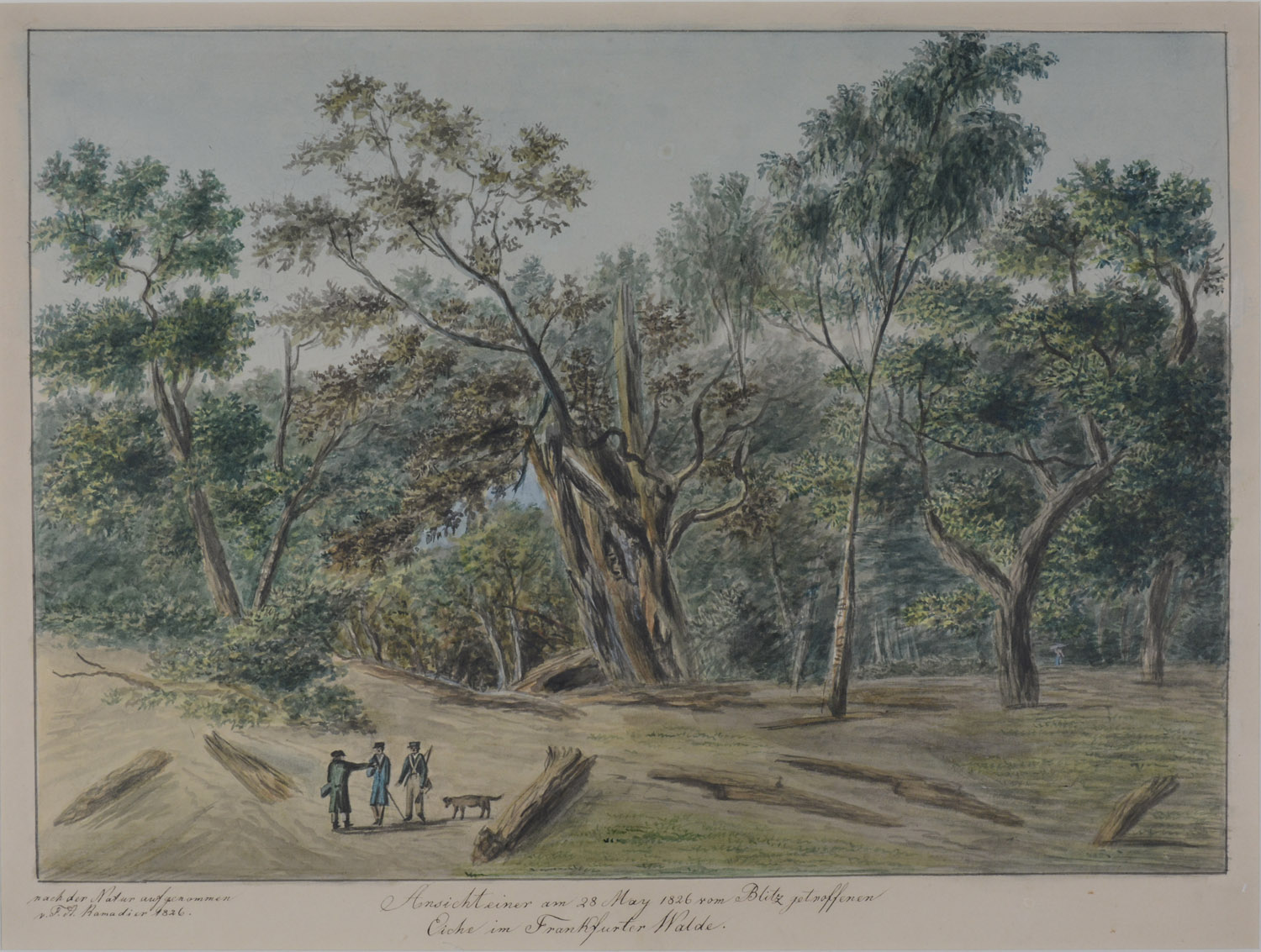 FRANKFURT – STADTWALD Ansicht einer am 28 May 1826 vom Blitz getroffenen Eiche im Frankfurter Walde. Frankfurt, 1826. Originalaquarell von August Friedrich Ramadier, am Bildrand unten links signiert und datiert. 29 x 38.