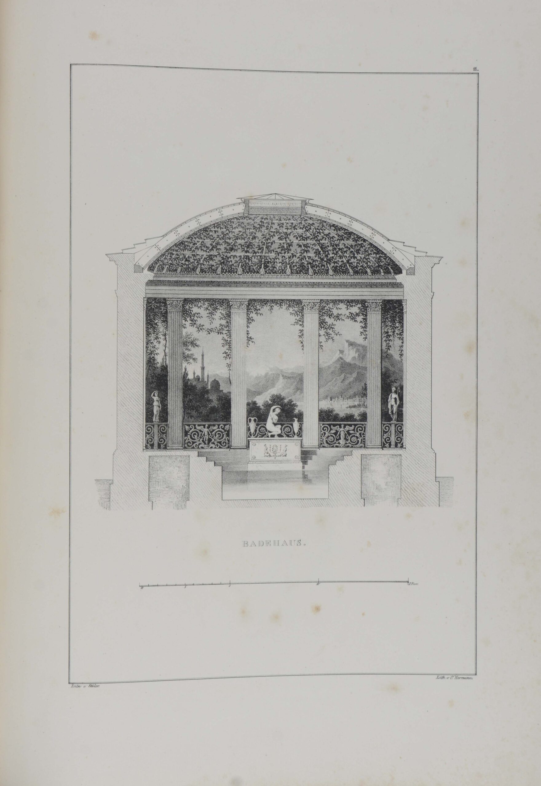 Zweite erweiterte Auflage. – Nicht im Katalog der Ornamentstichsammlung Berlin. – In insgesamt 4 Heften erschienene Publikation, dadurch der Sprung in den Seitenzahlen. Die Hefte 1 und 2 wurden erstmals 1832 und 1833 im Selbstverlag des Architektenvereins herausgegeben. – Enthält ganz vom Stil Friedrich Schinkels geprägte klassizistische Entwürfe von Friedrich August Stüler, Eduard Knoblauch, Johann Heinrich Häberlin, Friedrich Hitzig, Heinrich Strack, August Dieckhoff, Karl Wilhelm Drewitz, Carl Scheppig, u.a. Dargestellt sind u.a. Wohnhäuser, Börse, Schweizerhaus, Weinberghaus, Vogelhaus, Badehaus, Dampfmaschinenhäuser, Museum, Rathaus, Gymnasium und Kirche. Die farbige Tafel ist als Frontispiz eingebunden und zeigt eine klassizistische Wanddekoration von Stüler. – Der Text ist in der angegebenen Nummerierung komplett. Es fehlen wohl die ebenfalls nummerierten Hefttitelblätter. – Durchgehend stock- bzw. braunfleckig, Ecken leicht geknickt.