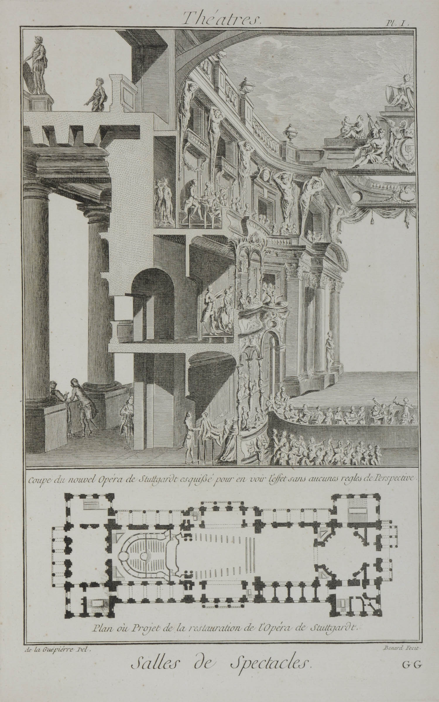 Die Tafeln zeigen Grundrisse, Pläne, Innen- und Aussenansichten von: Theater in Turin, Lyon, dem Theatre d’Argentine in Rome, dem königlichen Theater in Neapel, der Comedie Francoise, der Oper in Stuttgart, u.a. Komplette Folge.