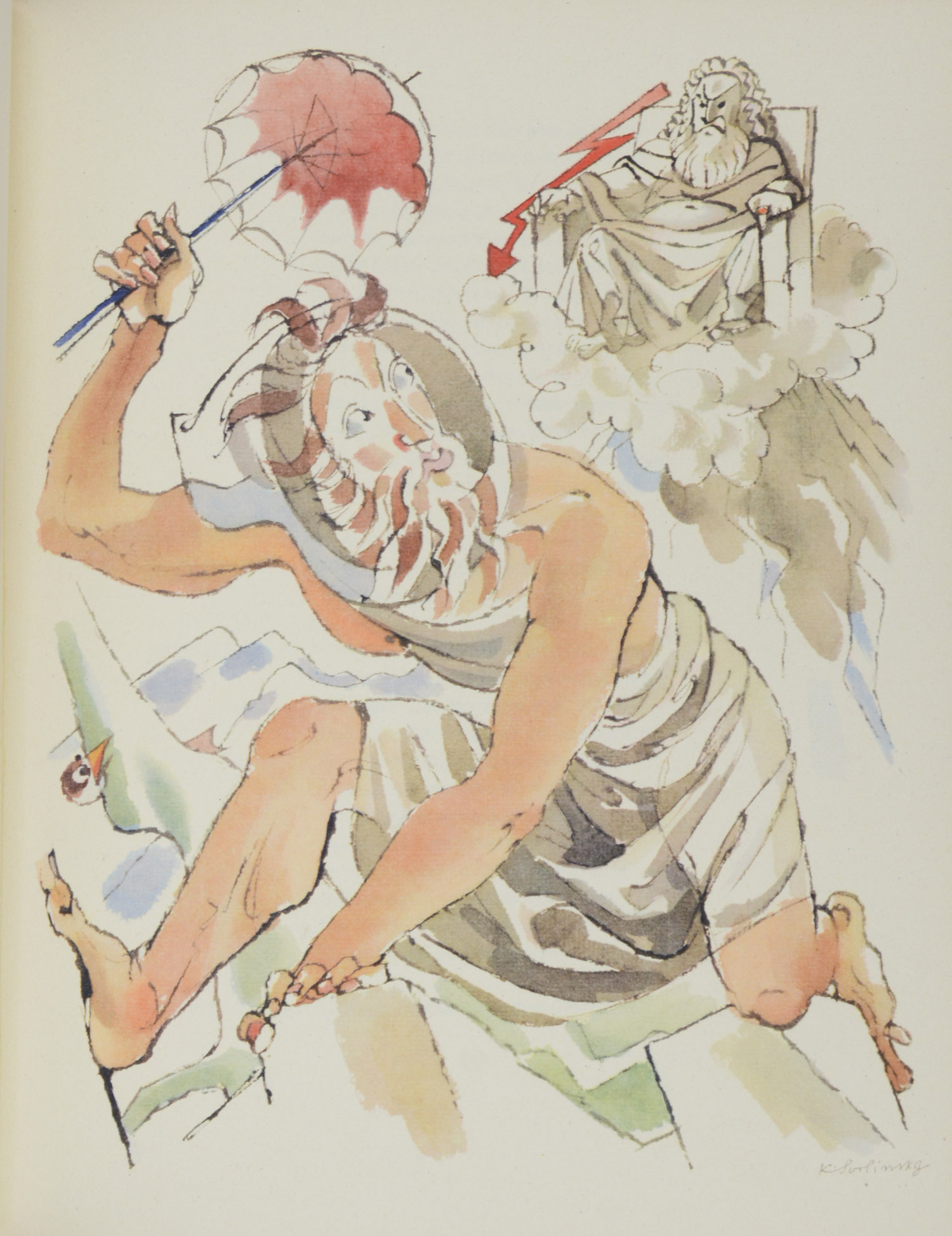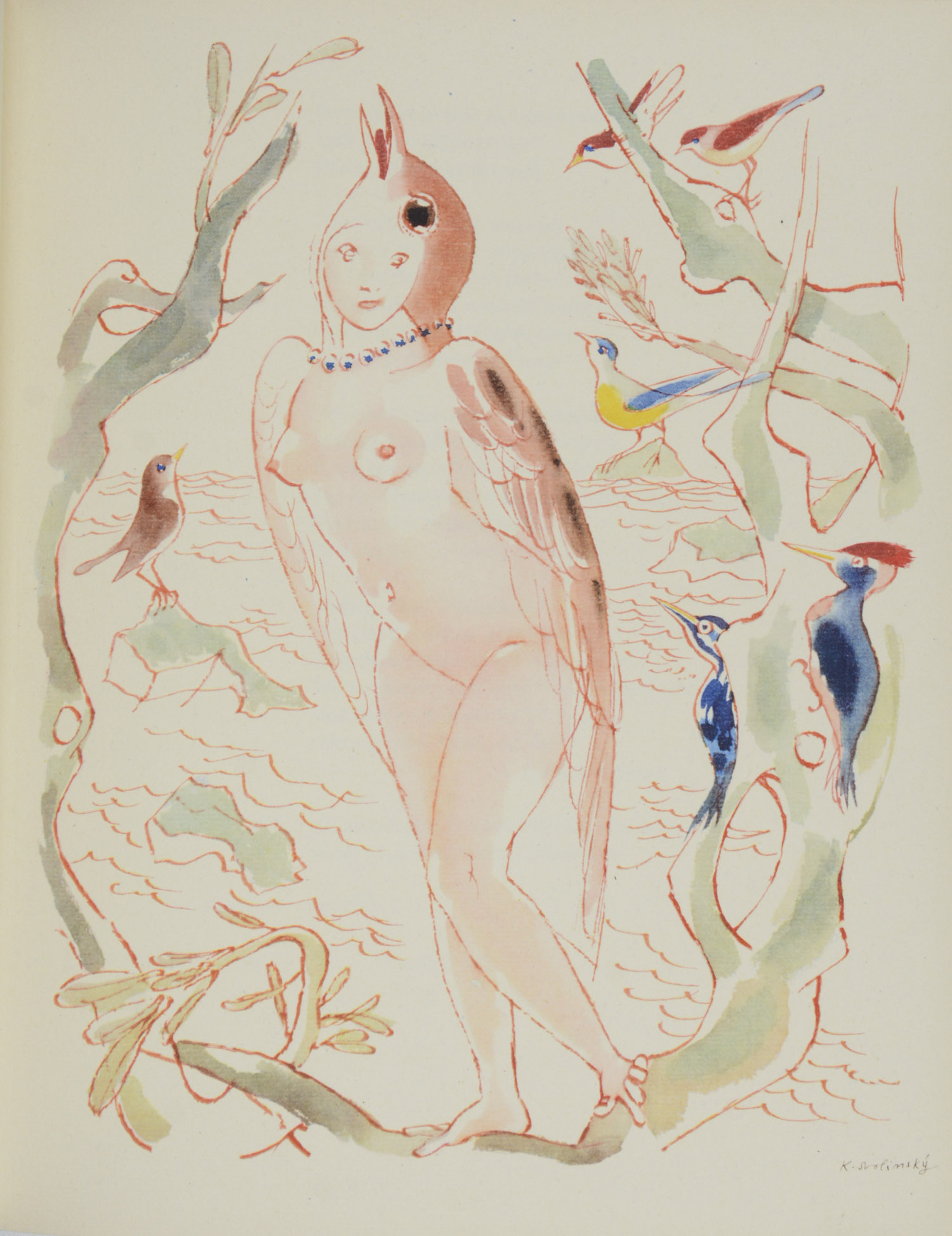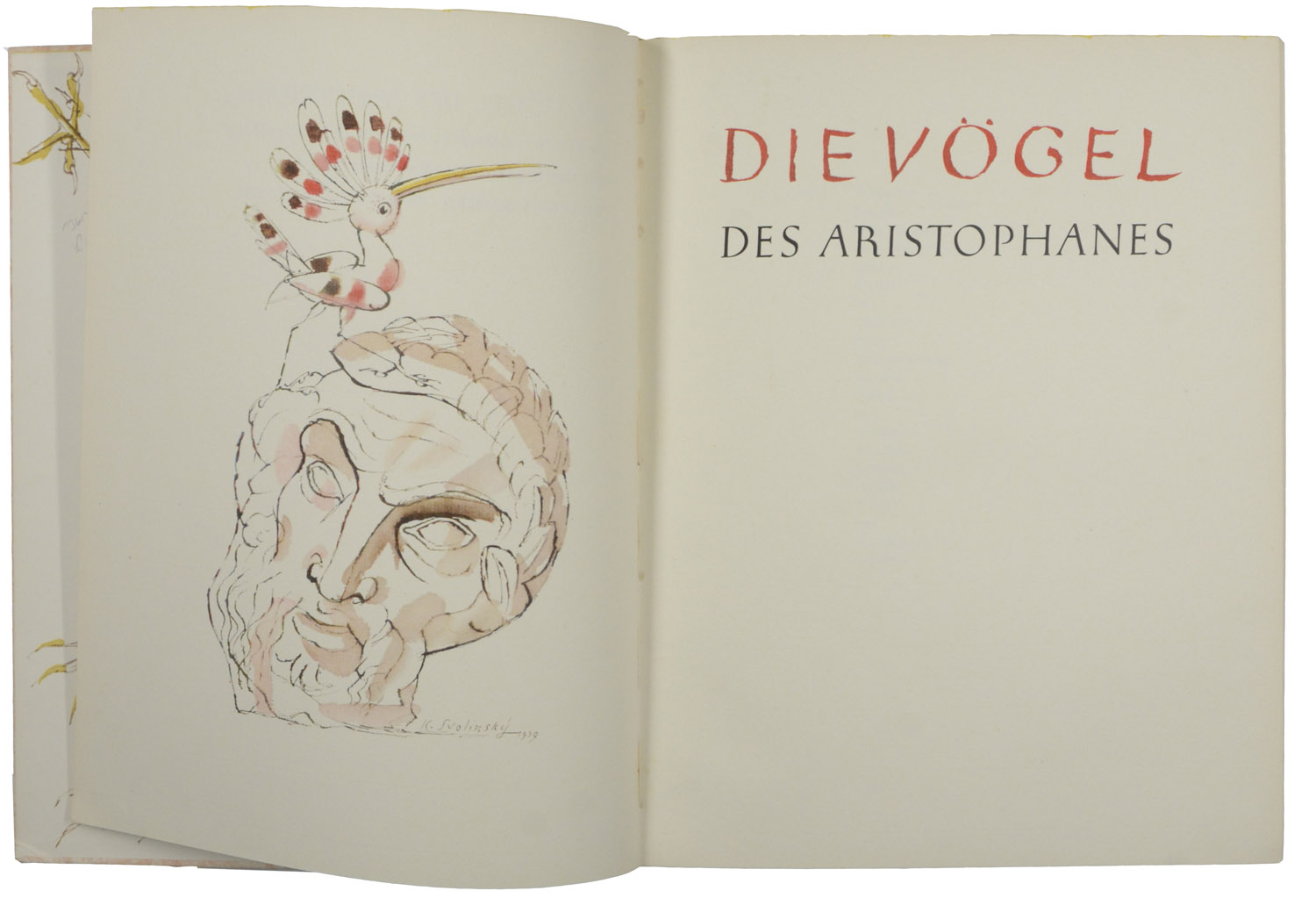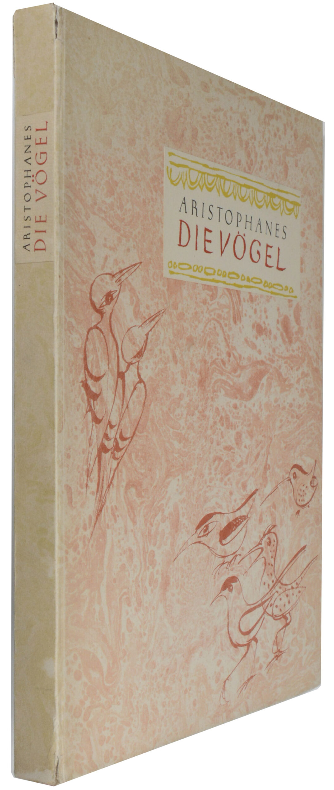 ARISTOPHANES.  Die Vögel. In der Nachdichtung von Fritz Diettrich. Frankfurt, Bauersche Giesserei, 1940. Folio. 1 nn. Bl., 119 S., 1 nn. Bl., mit 12 farbigen ganzseitigen Illustrationen von Karel Svolinsky. Illustrierter Originalpappband mit montiertem Deckel- und Rückenschild, (etwas beschabt, Rücken an den Kapitalen eingerissen, Ecken leicht gestaucht).