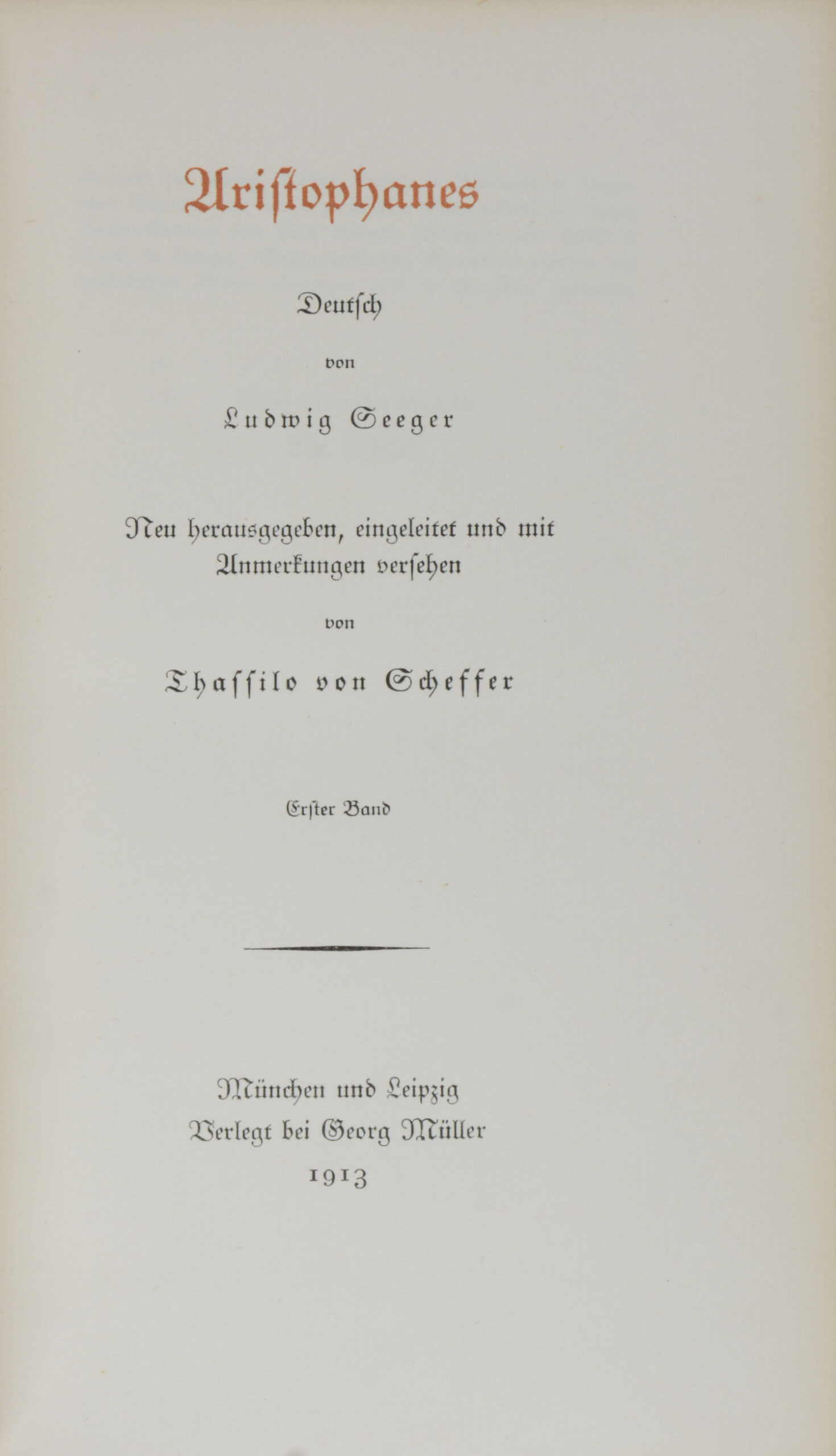 ARISTOPHANES. Komödien. Deutsch von Ludwig Seeger. Neu herausgegeben, eingeleitet und mit Anmerkungenversehen von Thassilo von Scheffer. München, Leipzig, Georg Müller, 1913. 2 Bände. 8°. 4 nn. Bl., 429 S.; 4 nn. Bl., 509 S. Originalleder mit Rücken- und Deckelvergoldung, Innenkantenfileten, goldgeprägtem Rückentitel und Kopfgoldschnitt, (minimal beschabt). (Klassiker des Altertums, 2. Reihe, Bd. 7/8).