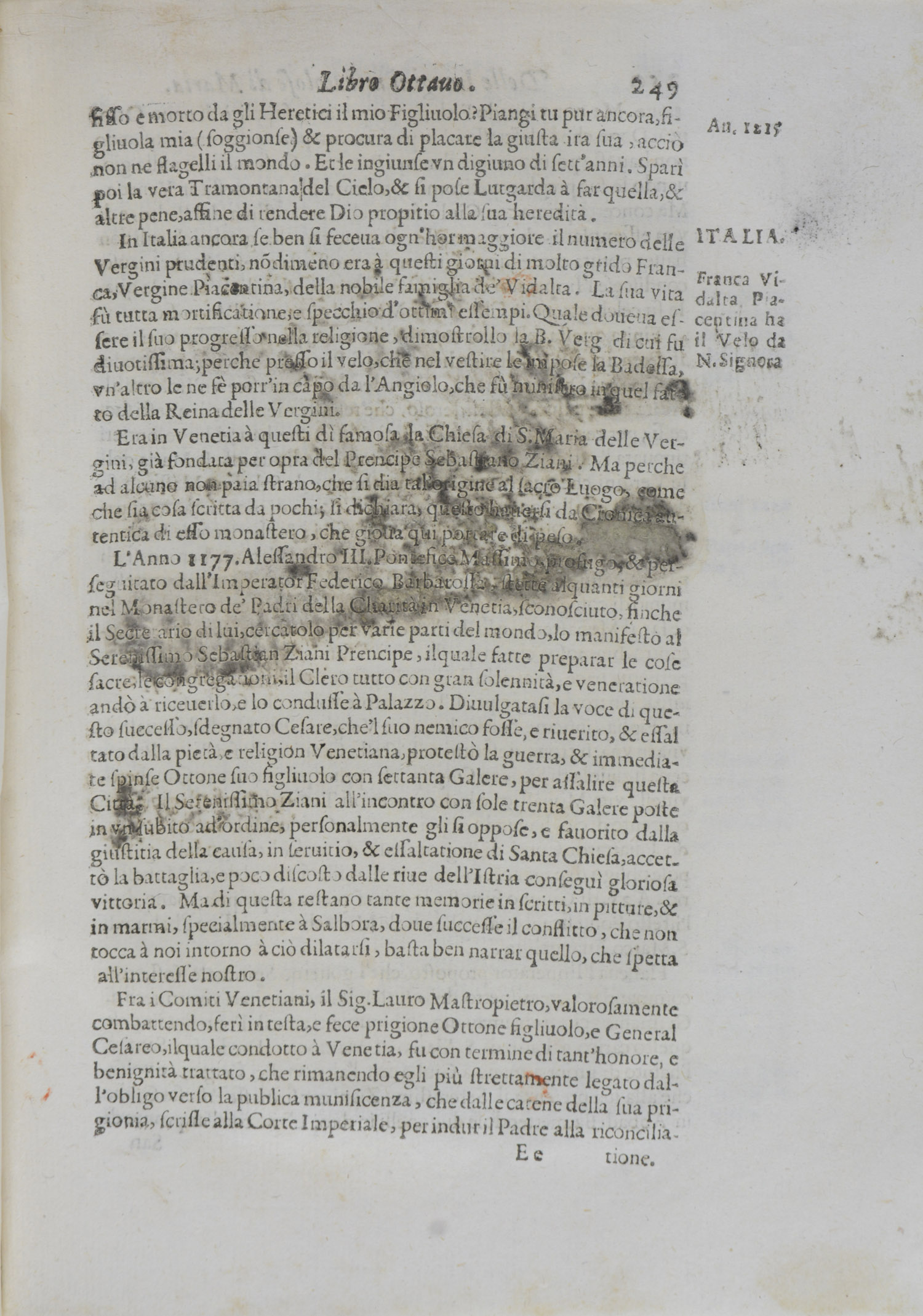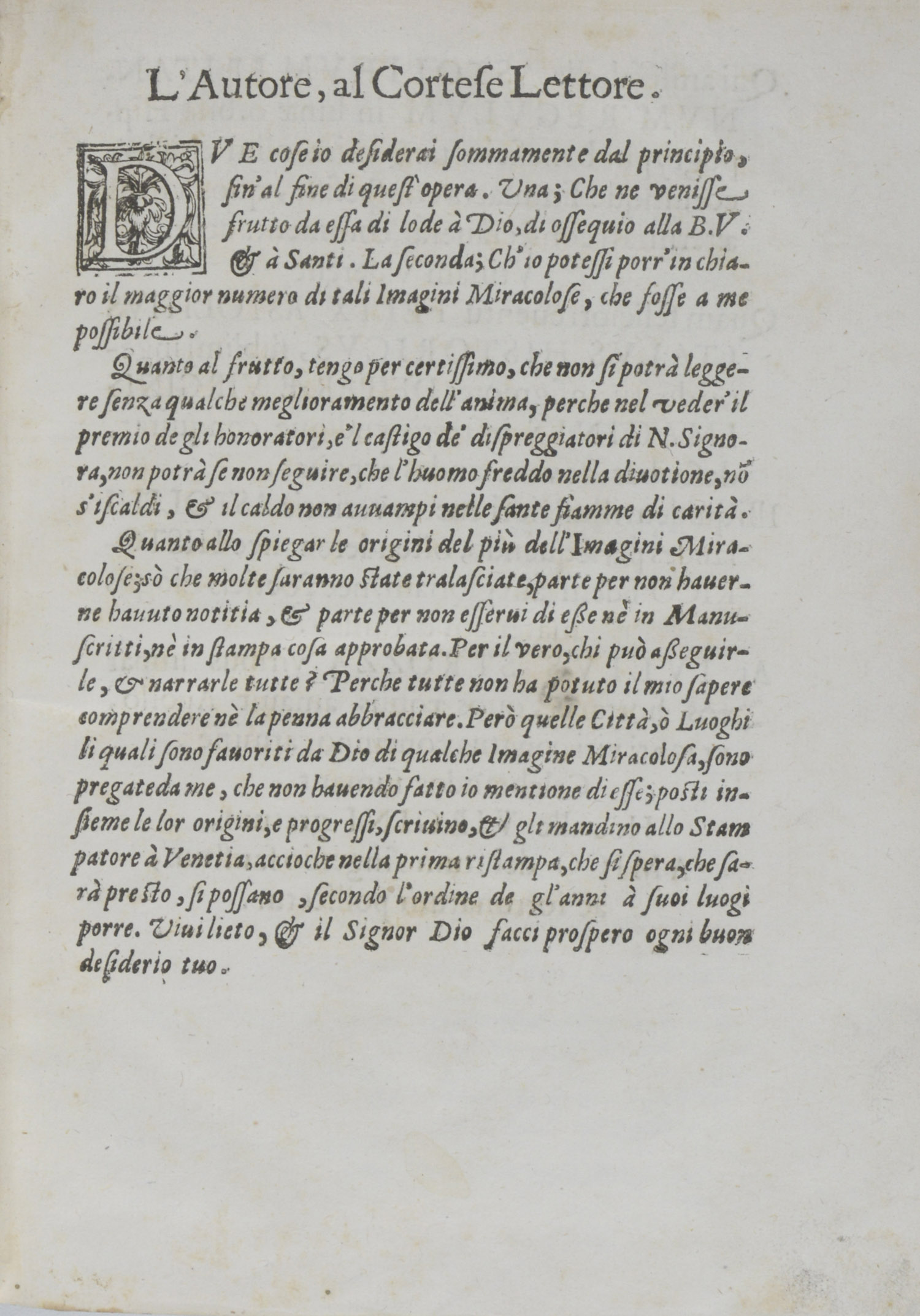 Erste Ausgabe. – Dieser Titel von uns bibliographisch nicht nachweisbar. – Der Autor, Giovanni Felice Astolfi war ein italienischer Historiker und Übersetzer in der ersten Hälfte des 17. Jahrhunderts. – Vgl. Jöcher I, 601. – Frühes systematisches Werk über den Marienkult, das in den einschlägigen Bibliographien nicht verzeichnet ist. – Der Autor versucht in der „Historia universale“ umfassend Wunder und die Verehrung der Jungfrau Maria in der neuen und alten Welt, sowie im Orient, anhand von zahlreichen Texten aus Reiseberichten und Briefen der Jesuiten darzustellen. – Der Autor beginnt mit einer Lebensgeschichte Marias, sowie einer Auflistung der Reliquien, als Einleitung. Die folgenden Bücher behandeln chronologisch die Beschreibungen der Marienklöster- und -kirchen, sowie Berichte über die Kraft heiliger Bilder und Wunder in Italien und Europa und ab dem 10. Buch zusätzlich auch Berichte über Wunder in Afrika, Asien und Amerika. So z.B. ein Bericht über ein von Dämonen heimgesuchtes Schiff, das in der Karibik von der Jungfrau von Guadalupe gerettet wird. – Leicht fleckig, Seite 249 und 250 mit alter verwischter Tinte, Vor- und Nachsatz stärker wurmstichig, die ersten und letzten Blatt ebenfalls leicht betroffen. – Zeitgenössischer Besitzeintrag auf Titel (? Schilleri), sowie von 1967 auf fliegendem Vorsatz.