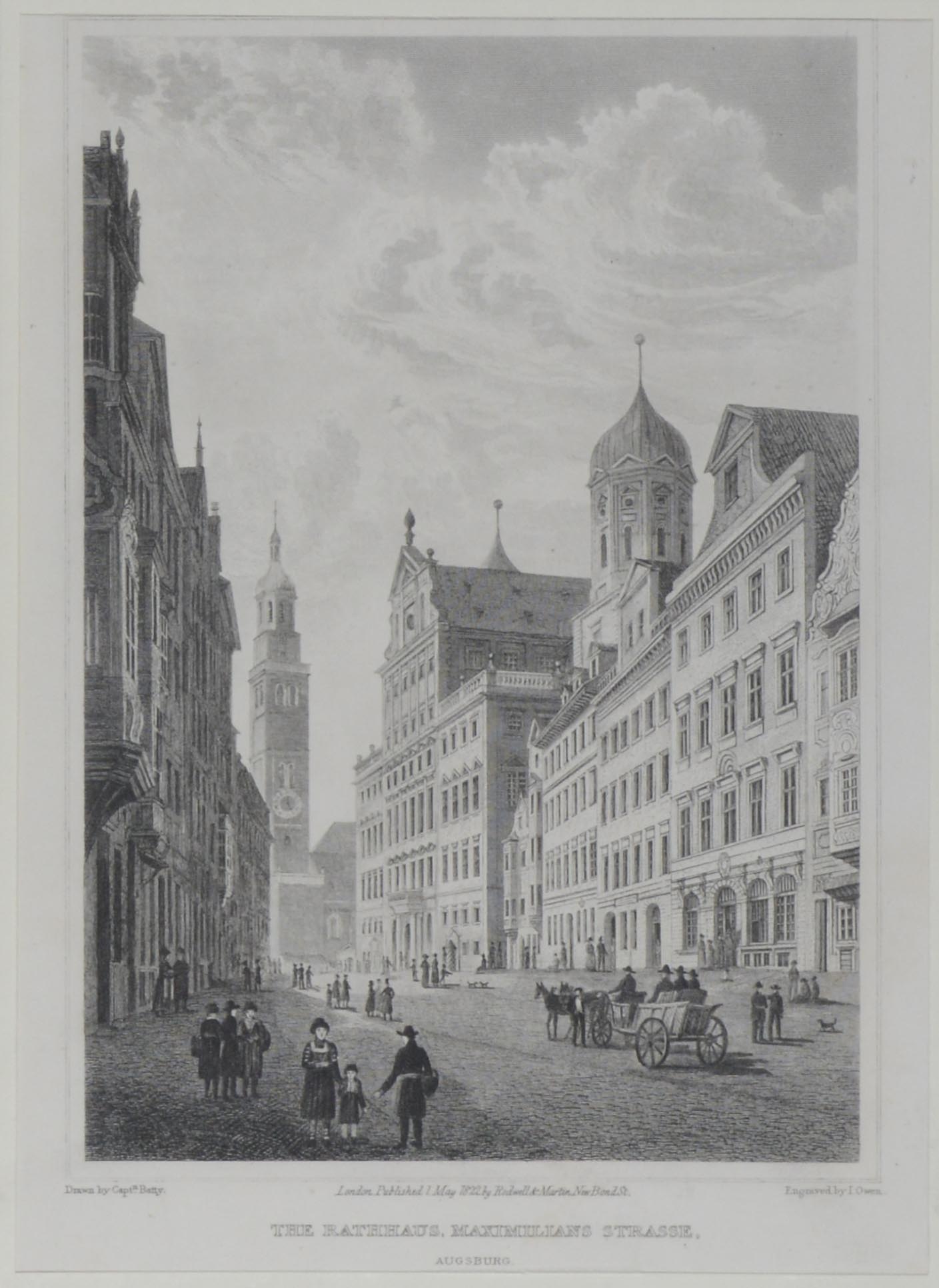 AUGSBURG. The Rathaus, Maximilians Strasse. 1822. Stahlstich von Owen nach Robert Batty, 22,5×14 cm.