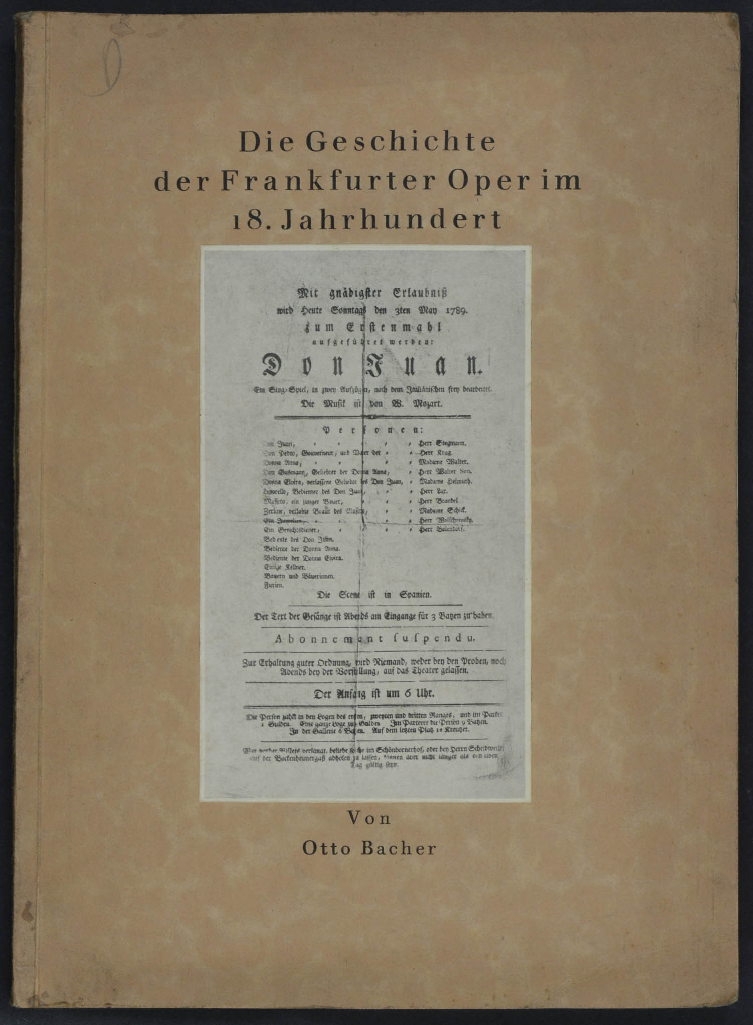 BACHER, Otto. Die Geschichte der Frankfurter Oper im achtzehnten Jahrhundert. Frankfurt am Main, Englert und Schlosser, 1926. 4°. 112 S. Mit 2 farbigen Tafeln und zahlreinen Textabbildungen. Originalbroschur mit montierter Deckelillustration und Deckeltitel, (etwas angestaubt) (Veröffentlichungen der Deutschen Musikgesellschaft, Ortsgruppe Frankfurt, Bd.I).