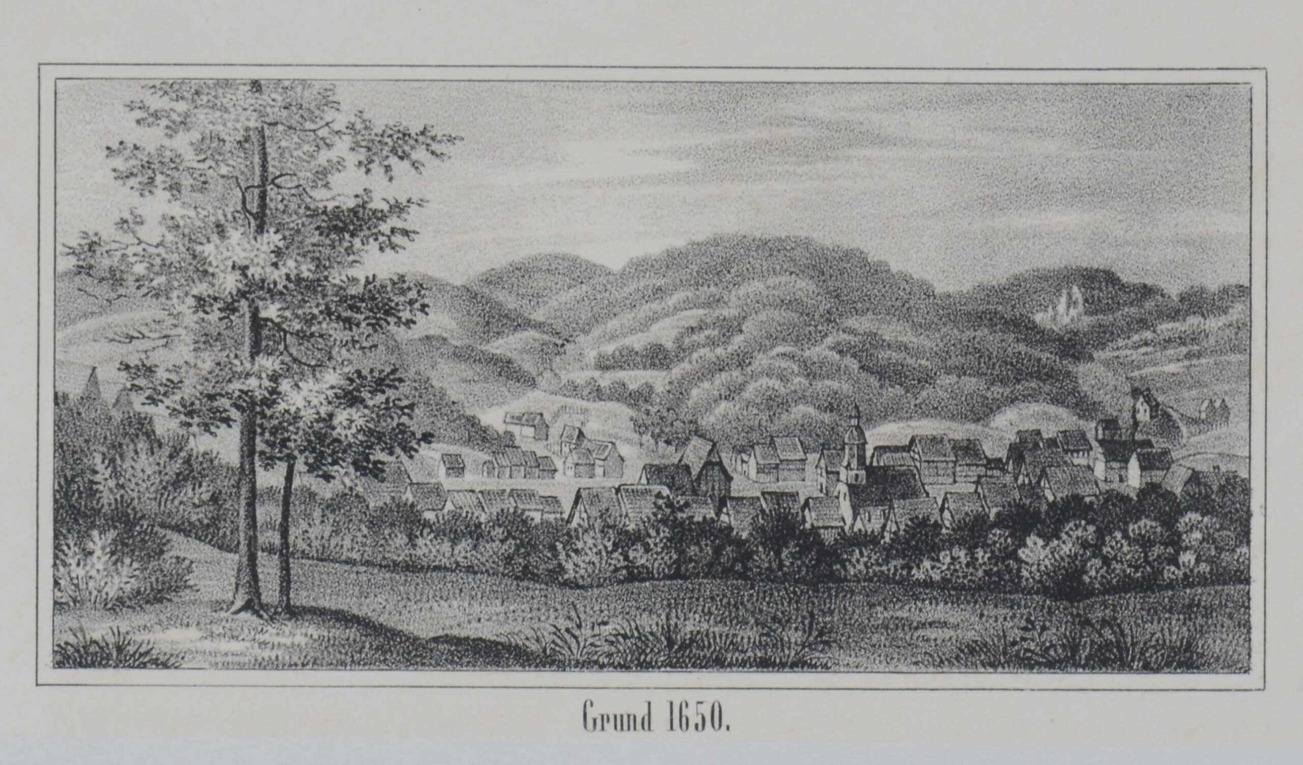 BAD GRUND/Harz. Gesamtansicht. 1845. Lithographie aus Görges, 6×12. Knapp unterhalb der Schrift beschnitten.