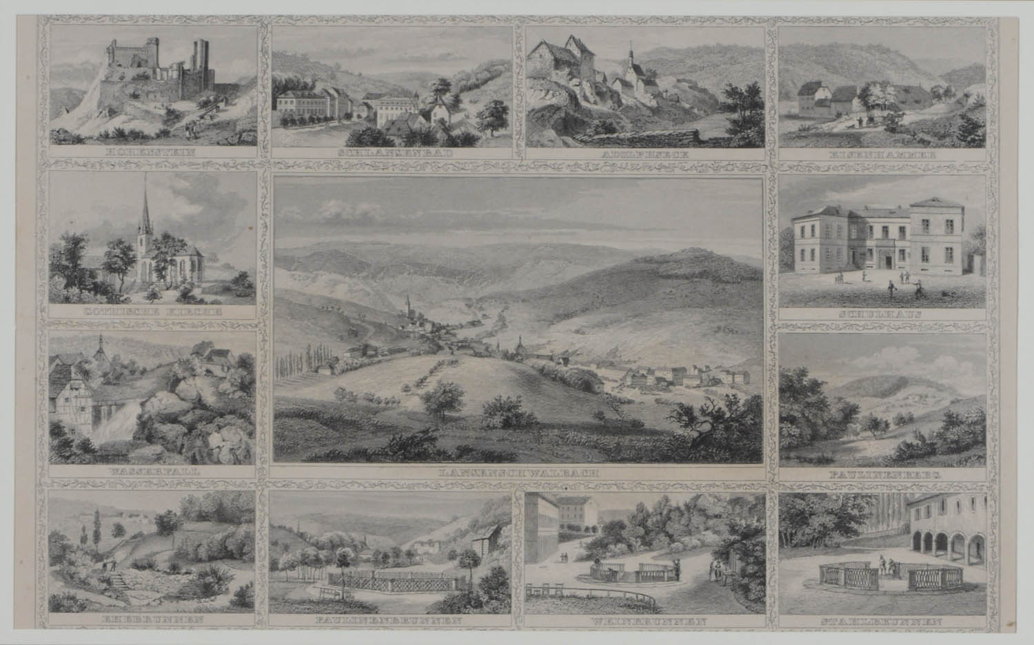 BAD SCHWALBACH. Souvenirblatt. Gesamtansicht mit 12 Teilansichten um 1850. Stahlstich bei Lange, 13×20.