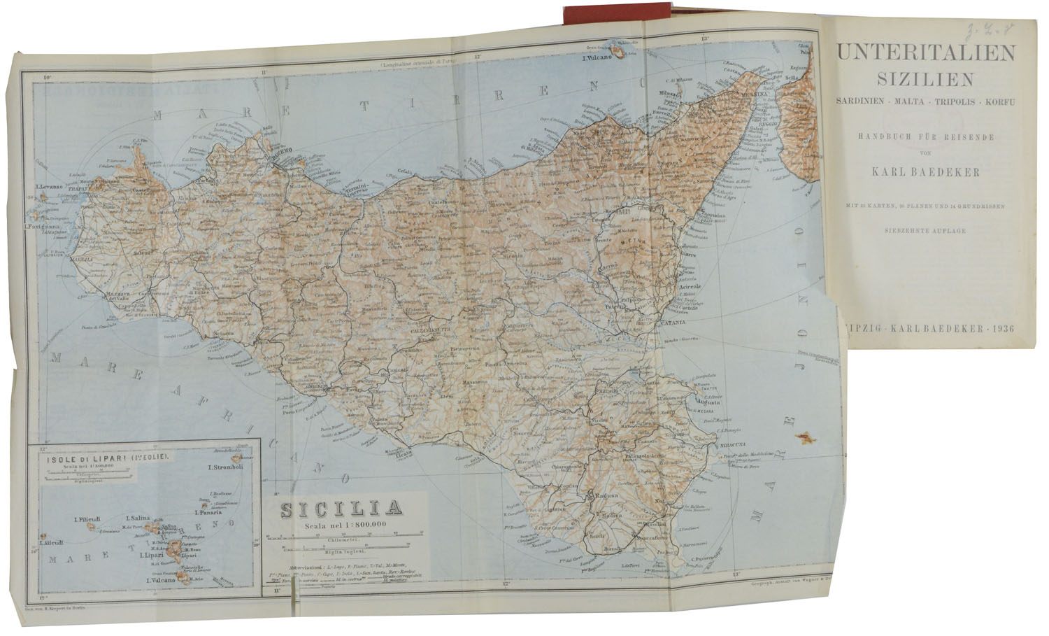 BAEDEKER, Karl. Unteritalien, Sizilien, Sardinien, Malta, Tripolis, Korfu. Leipzig, Baedeker, 1936. 17. Auflage. Kl.-8°. XXLVIII, 530 S., mit 33 Karten, 30 Plänen und 14 Grundrissen. Originalleinen mit Rücken- und Deckeltitel, Originalschutzumschlag, (Umschlag berieben und mit Randeinrissen, Einband mit alter Bibliothekssignatur).