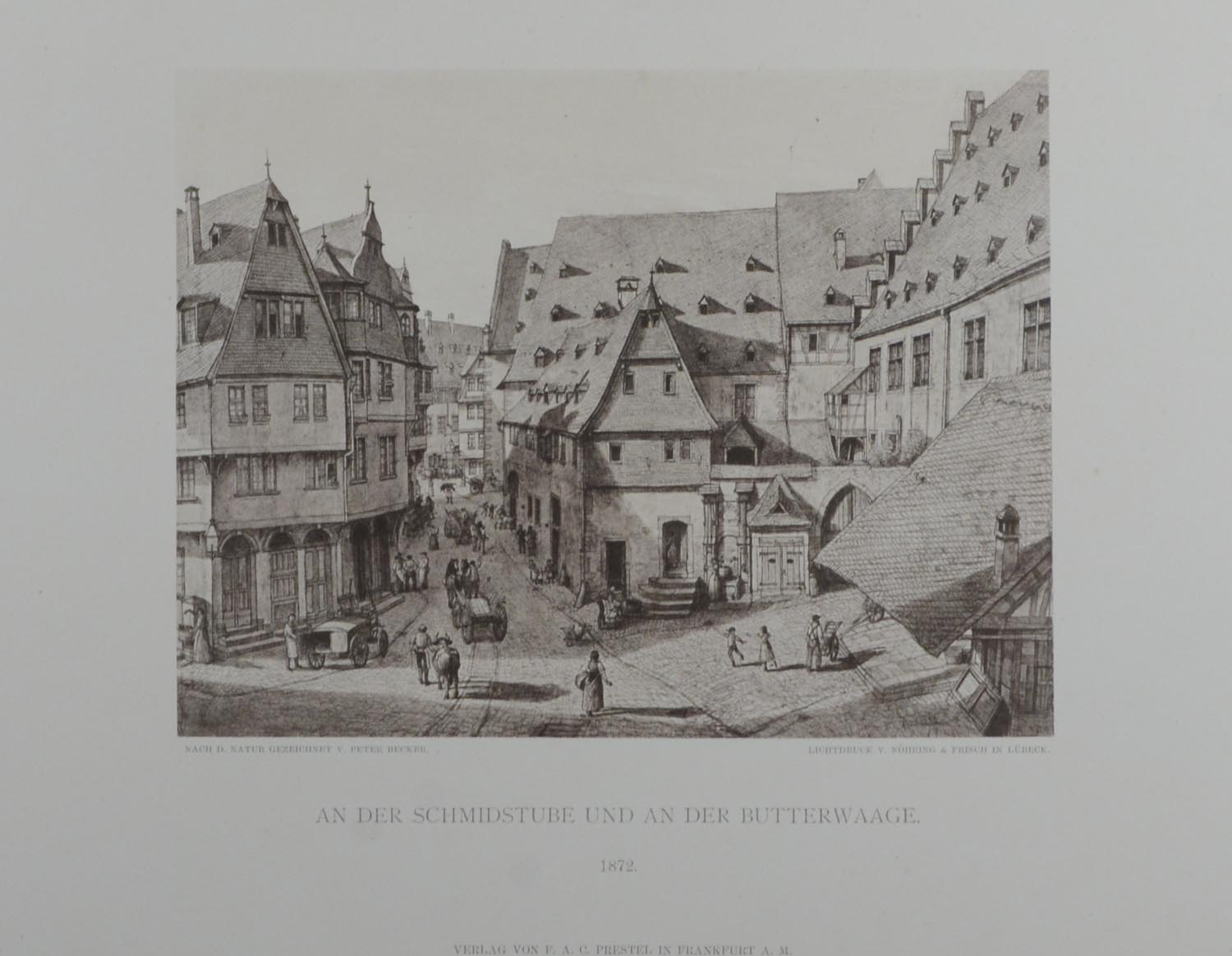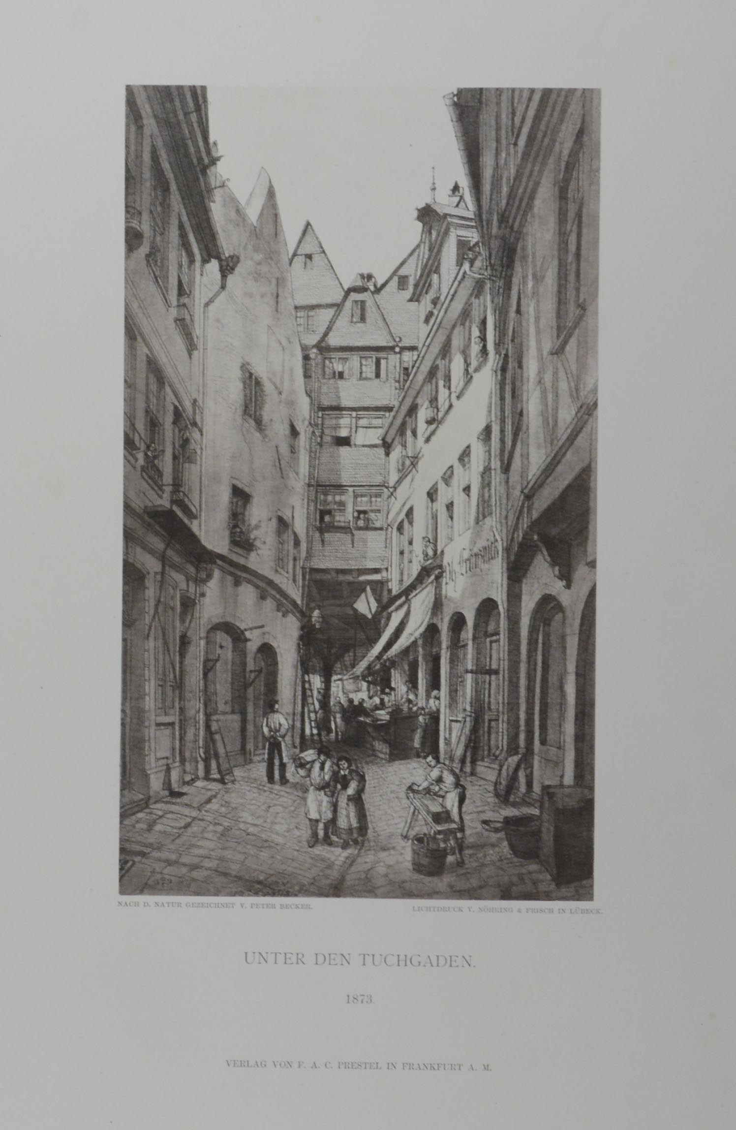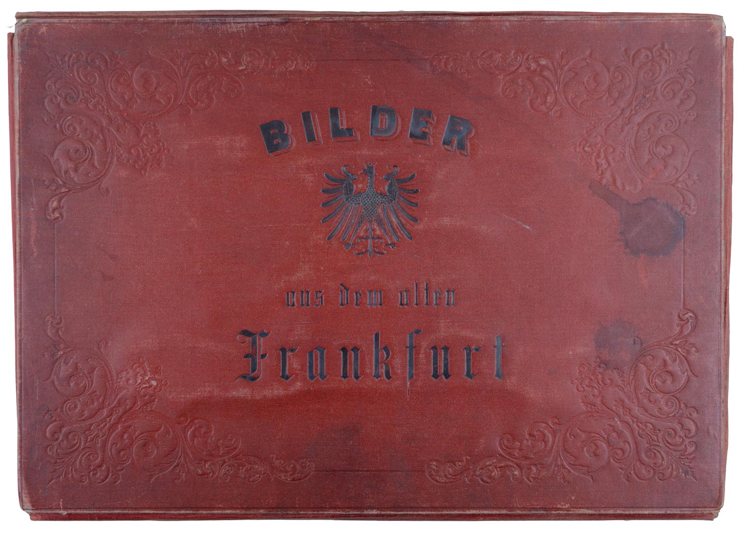 Erste Ausgabe, komplett selten. – Weizsäcker/Desoff II, 10ff; Sauer 244; Slg. Cornill 499. – „Diese vortrefflichen Altfrankfurter Ansichten sind so vollendet in ihrer Art, daß es Besseres nicht gibt!“ (Sauer). – Unter den Tafeln Darstellungen von der Butterwaage, vom Taubenhof, Arnsburger Hof, Kuhhornshof, Kettenhof usw. – Leicht fleckig, Innengelenke der Flügel etwas gelockert.