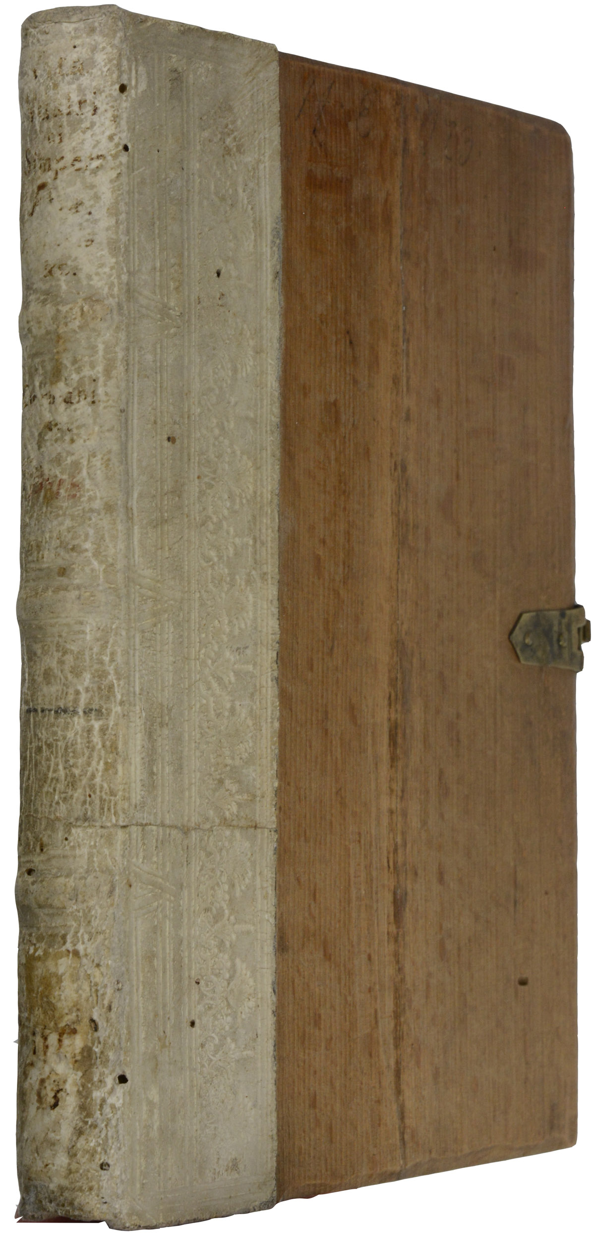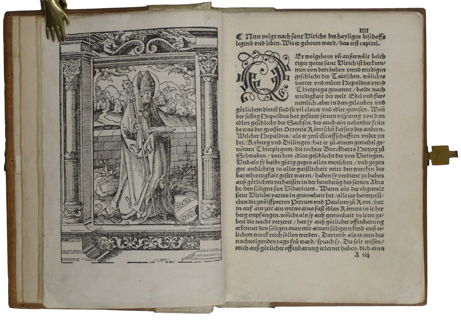 AUGSBURG – BERNO VON REICHENAU bzw. BERNO AUGIENSIS. Das leben: verdienen: und wunderwerck der hailigen, Augspurger Bistumbs bischoffen, sant Ulrichs, und Symprechts, auch der säligen martrerin sant Apfre, irer müter Hilarie geschlecht und gesellschaft, in unserm daselbst loblichen gotshauß rastend. (Augsburg, Silvan Otmar, 1516). Klein-4°. 87 num, 1 nn. Bl., mit Holzschnitt-Titelbordüre und 5 ganzseitigen Holzschnitten von Leonhard Beck. Holzdeckelband der Zeit mit blindgeprägtem Schweinslederrücken und Schließe, (minimal fleckig, Vorderdeckel mit restauriertem Bruch, Schließe ergänzt).