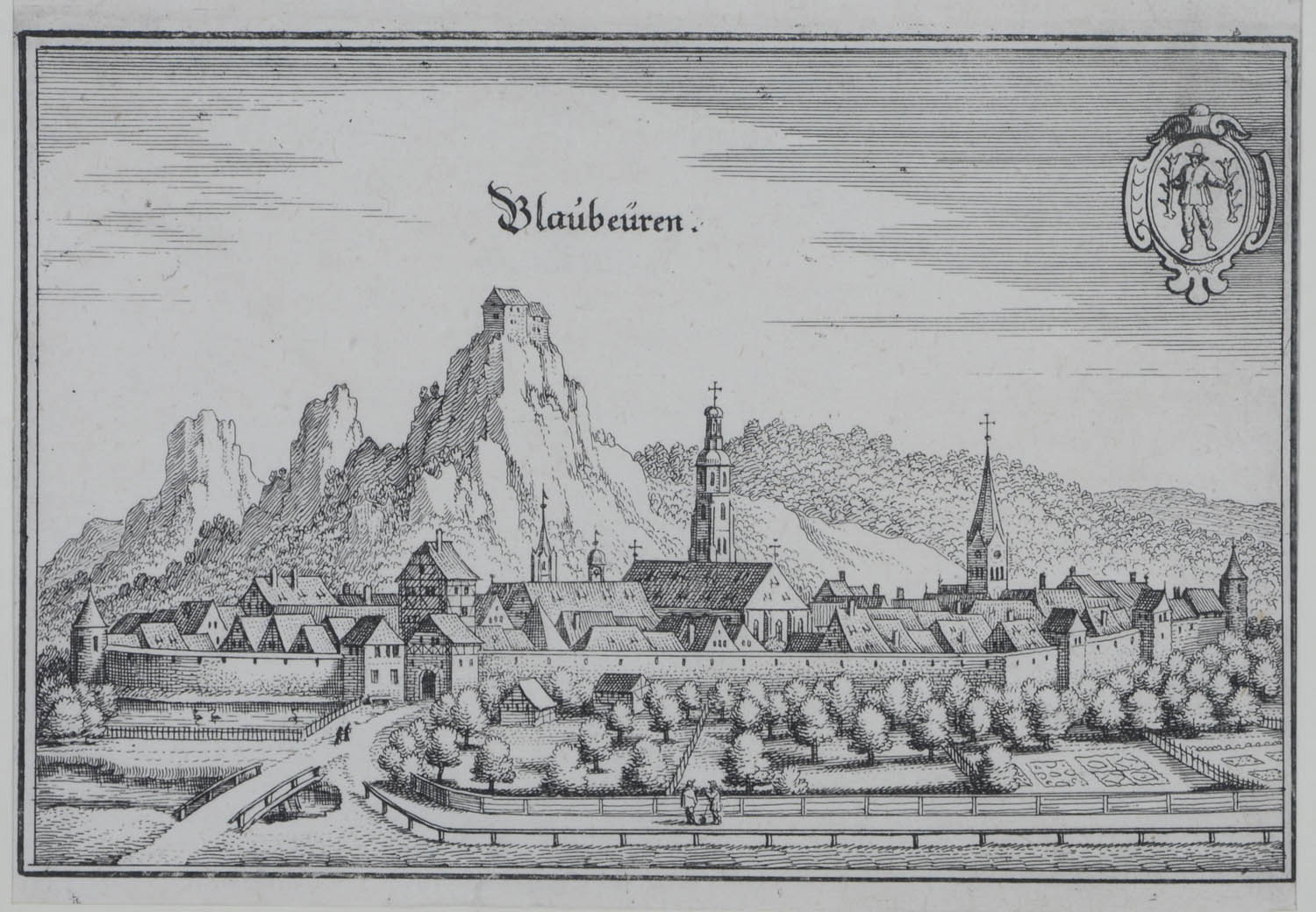 BLAUBEUREN. Gesamtansicht. um 1650. Kupferstich von Merian, 10,5×16.