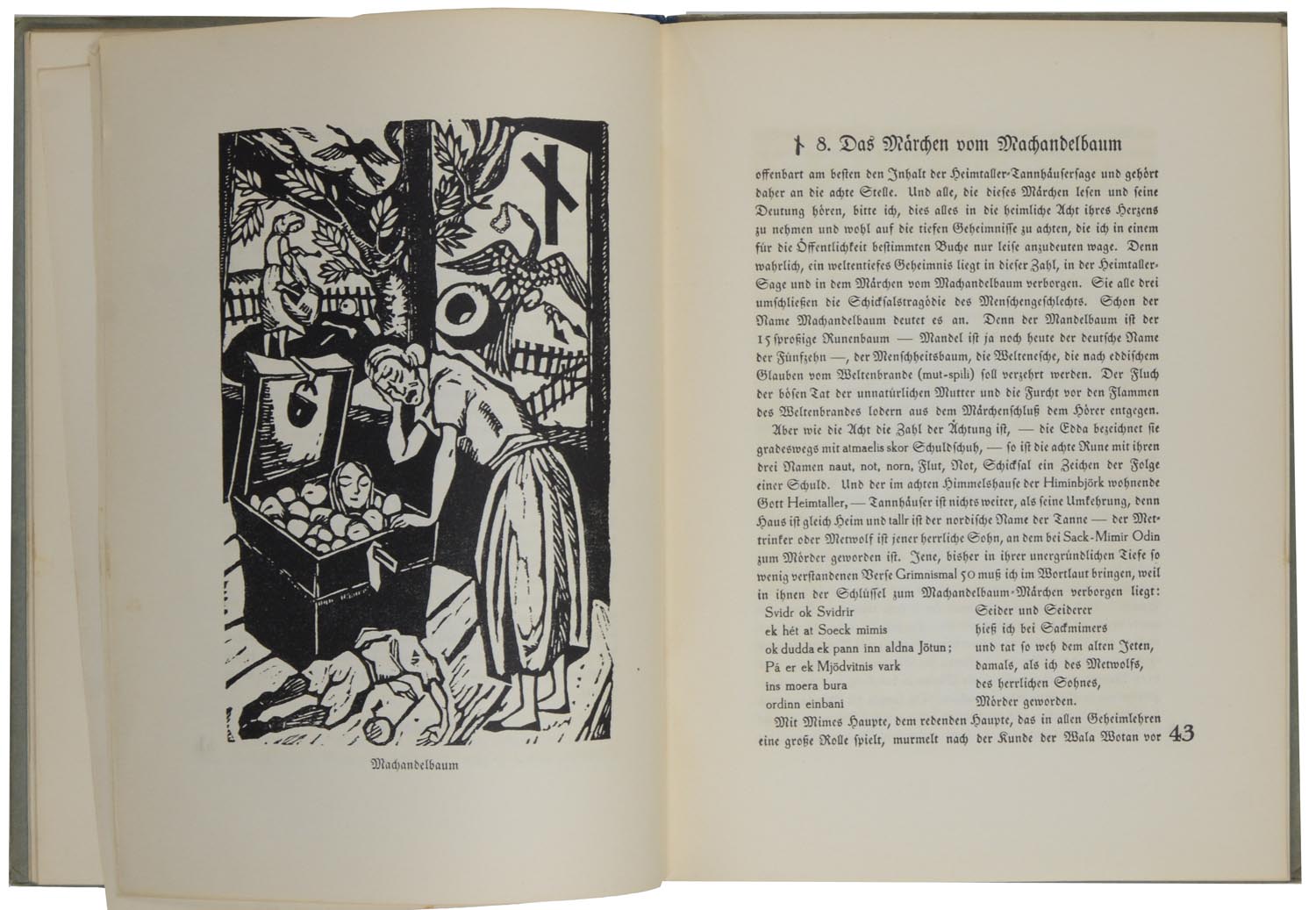 Erste Ausgabe. – 16 Märchen werden hier 16 entsprechende Runen zugeordnet und der Autor versucht, ganz im Sinne einer nationalkonservativen Volkskundetradition, einen Zusammenhang zwischen den klassischen Märchen und nordischer Mystik und Religion herzustellen. „Bei der Deutung der einzelnen Märchen habe ich mich bemüht, gleichsam als Schlüssel- und Stichwort die Rune gleichzeitig mit zu erläutern, durch die ihr tieferer Sinn sich offenbart.“ (S. 96). – Leicht fleckig.