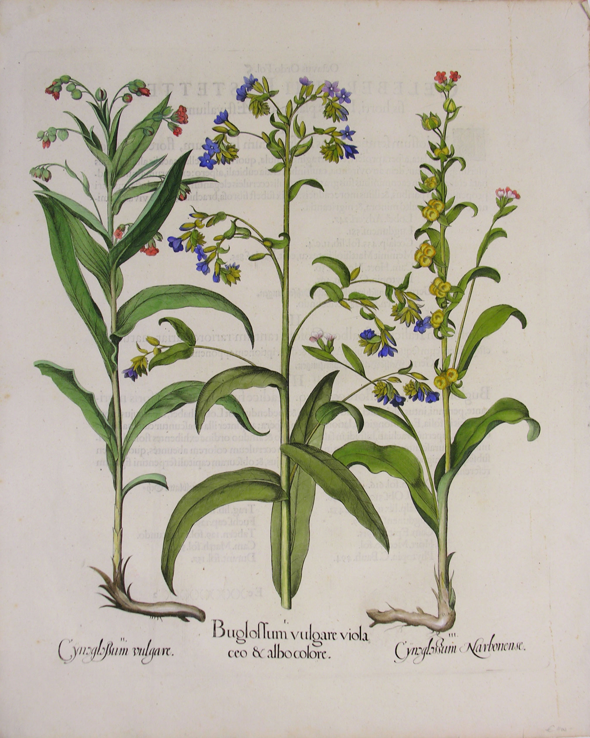 Hortus Eystettensis – Buglossum vulgare violaceo et albo colore; Cynoglossum vulgare; Cynoglossum Narbonense. 3 Pflanzendarstellungen auf einem Blatt. Nürnberg, 1613. Kolorierter Kupferstich mit rückseitigem Text aus B. Besler: Hortus Eystettensis. 48×40.