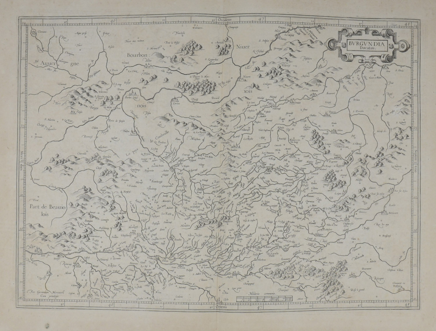 BURGUND – „Burgundia Ducatus“. Ca. 1610. Kupferstichkarte von G. Mercator. 46×33. Bugfalte. Im sehr breiten Rand stellenweise hell gebräunt.