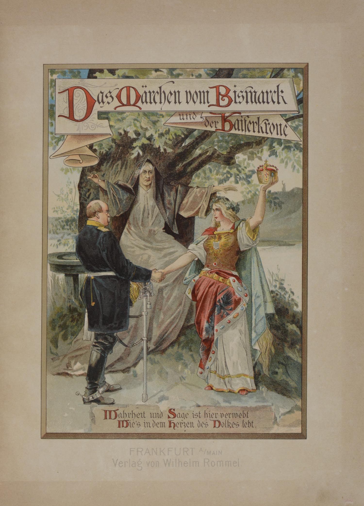 BISMARCK – Das Märchen vom Bismarck und der Kaiserkrone. Wahrheit und Sage ist hier verwebt. Wie’s in dem Herzen des Volkes lebt. Frankfurt a. Main, Wilhelm Rommel, o.J. (1891). 4°. Chromolithographischer Titel, 1 nn. Bl., 13 S., mit 6 chromolithographischen Tafeln und tels ganzseitigen Textillustrationen. Originalhalbleinen mit montierter farbiger Deckelillustration, (etwas fleckig und beschabt).