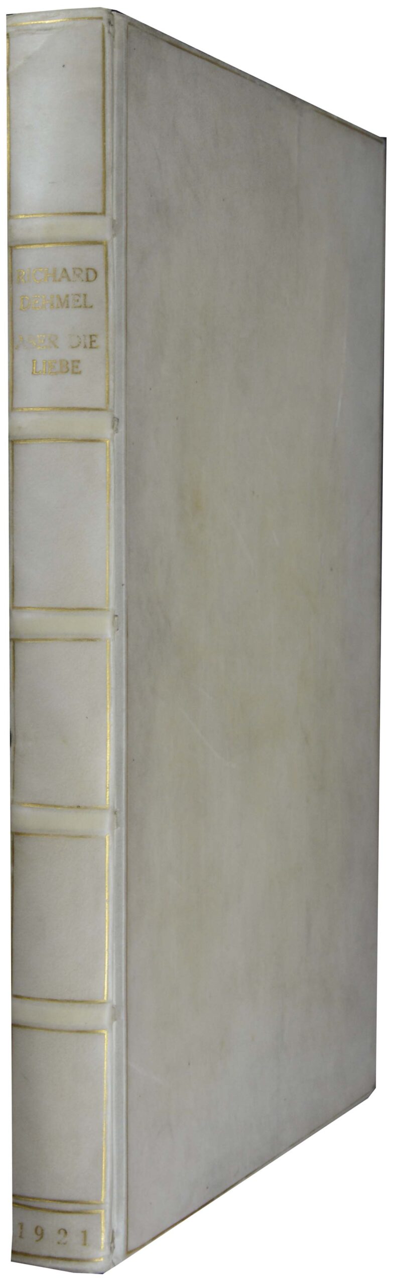 JAECKEL – DEHMEL, Richard.  Aber die Liebe. Zwei Folgen Gedichte. Berlin, Erich Steinthal, 1921. 4°. Radierte Titelvignette, radierter Titel, 143 S., 3 nn. Bl., mit 15 Originalradierungen auf Tafeln und 14 im Text von Willy Jaeckel. Pergamentband der Zeit mit goldgeprägten Deckelfileten, Rückentitel und Rückenfileten, Kopfgoldschnitt, (Ecken leicht gestaucht, minimal fleckig).