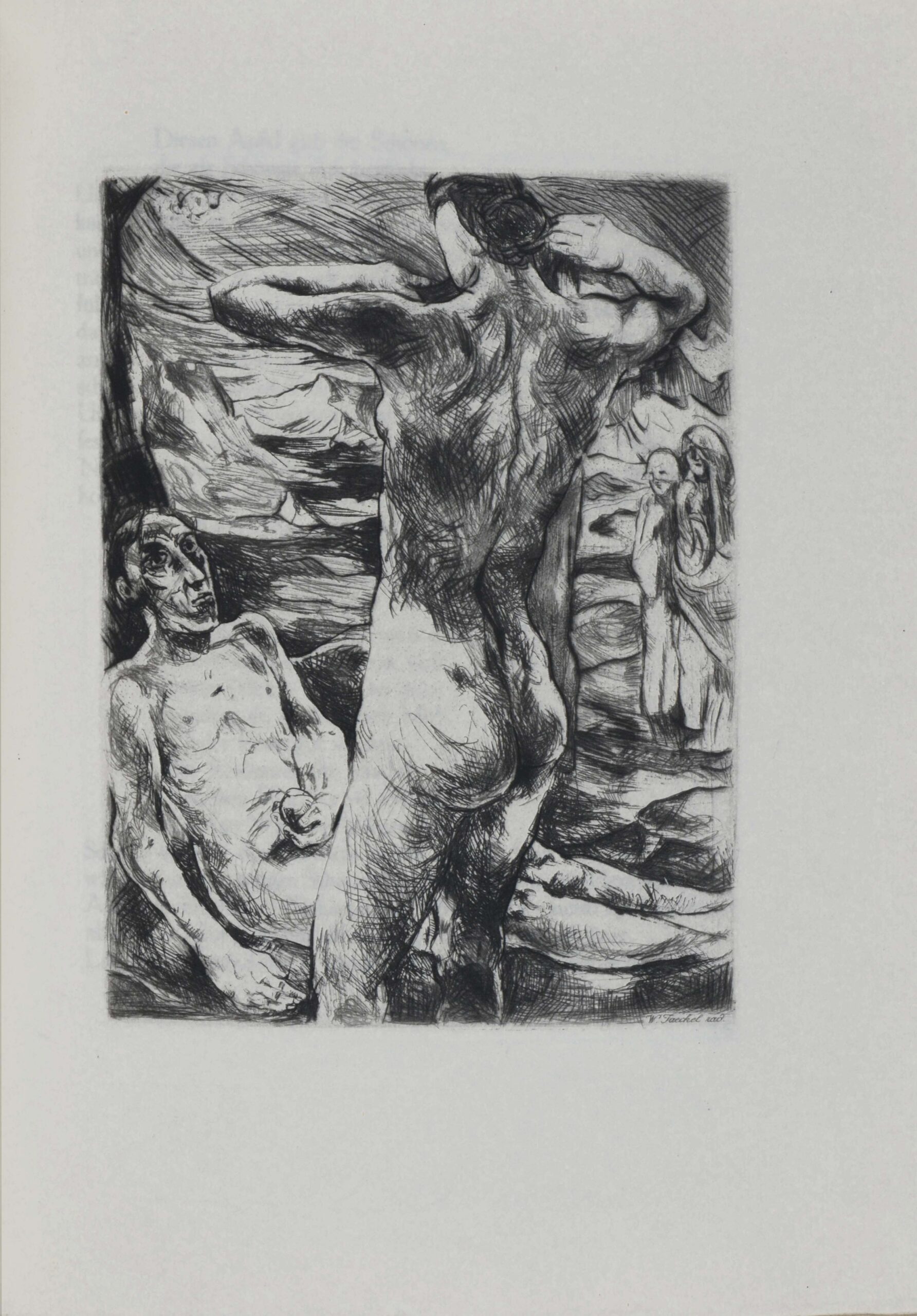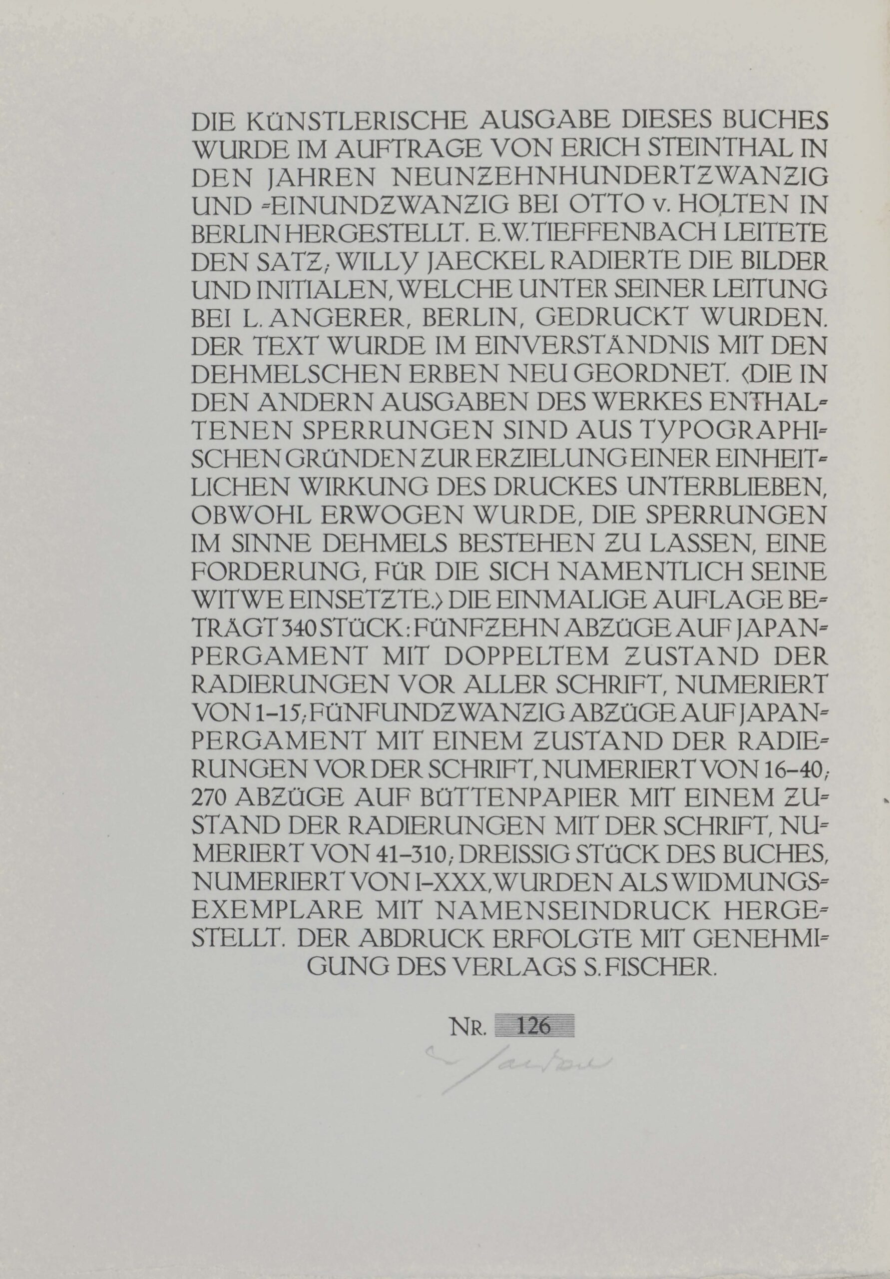 Erste Ausgabe mit den Illustrationen. – Hayn-G. IX 122; Lang 136. – Eins von 270 nummerierten Exemplaren (Nr. 126), insgesamt 340 Exemplare. – Die Radierungen alle in der Platte signiert. – Der Text wurde im Einverständnis mit den Dehmelschen Erben neu geordnet. Die 1893 erschienene erste Ausgabe der Dichtungen wurde vom königlichen Amtsgericht in München konfisziert. – Schöne Ausgabe mit den ausdrucksstarken Radierungen Willy Jaeckels (1888-1944). – Vor- und Nachsatz sind wohl fachmännisch erneuert worden, die letzten Blatt am oberen Rand minimal tuschfleckig. – Gutes Exemplar.