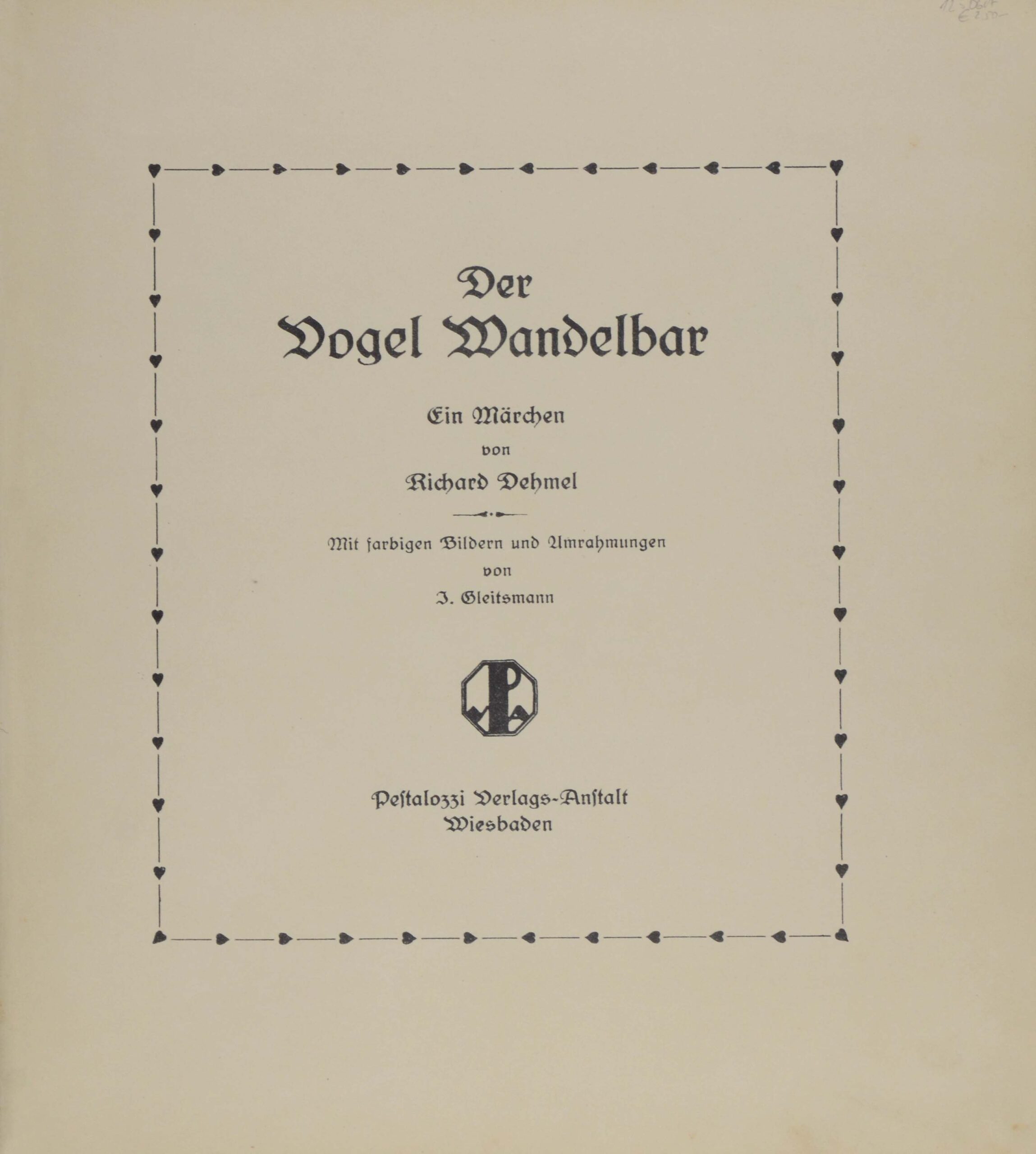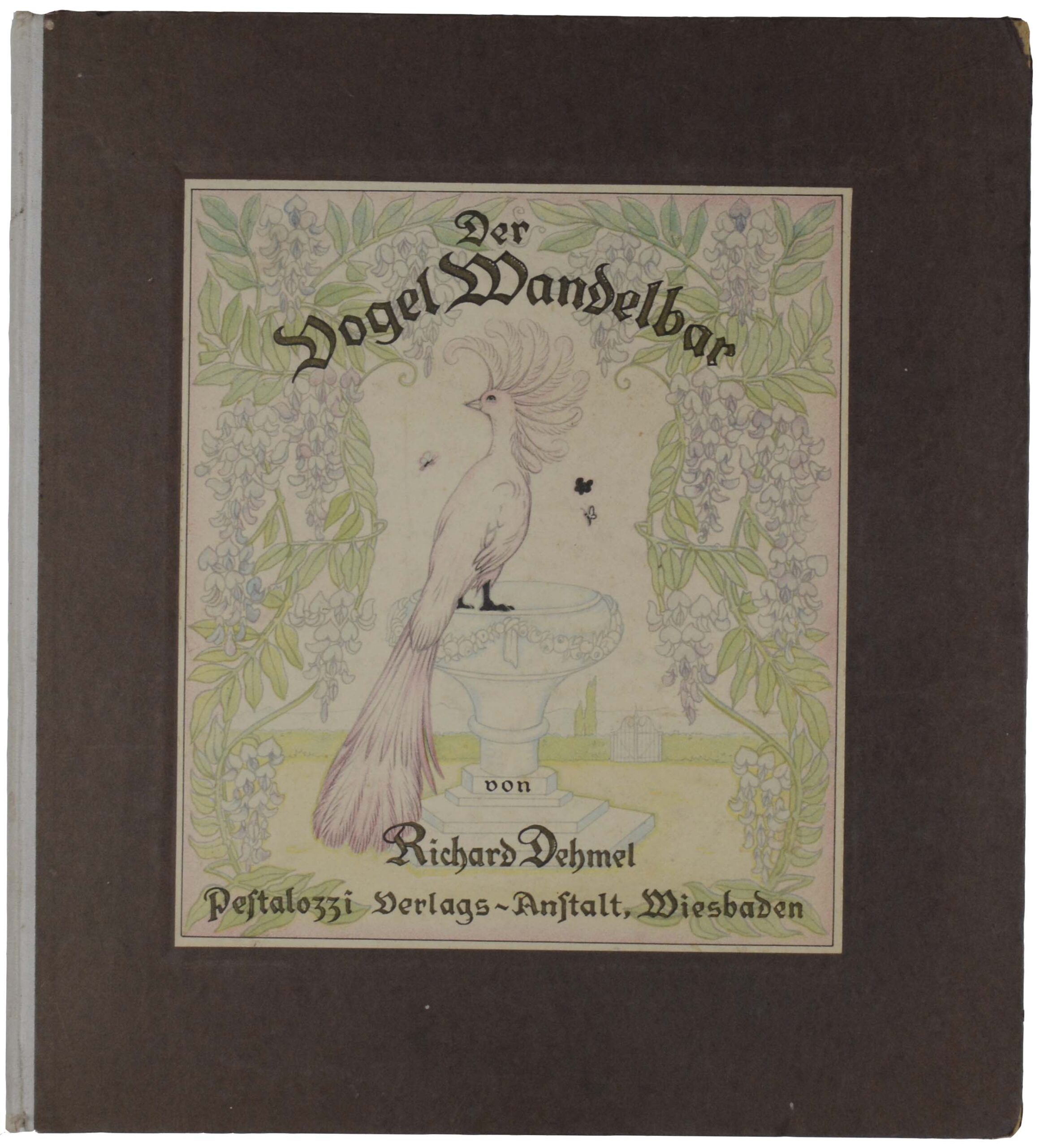 DEHMEL, Richard. Der Vogel Wandelbar. Ein Märchen. Wiesbaden, Pestalozzi Verlags-Anstalt, o.J. (1923). 4°. 9 nn. Bl., mit 7 farbigen Bildern und Umrahmungen von J.Gleitsmann. Illustriertes Originalhalbleinen, (etwas beschabt und bestoßen, Kapitale leicht fransig).
