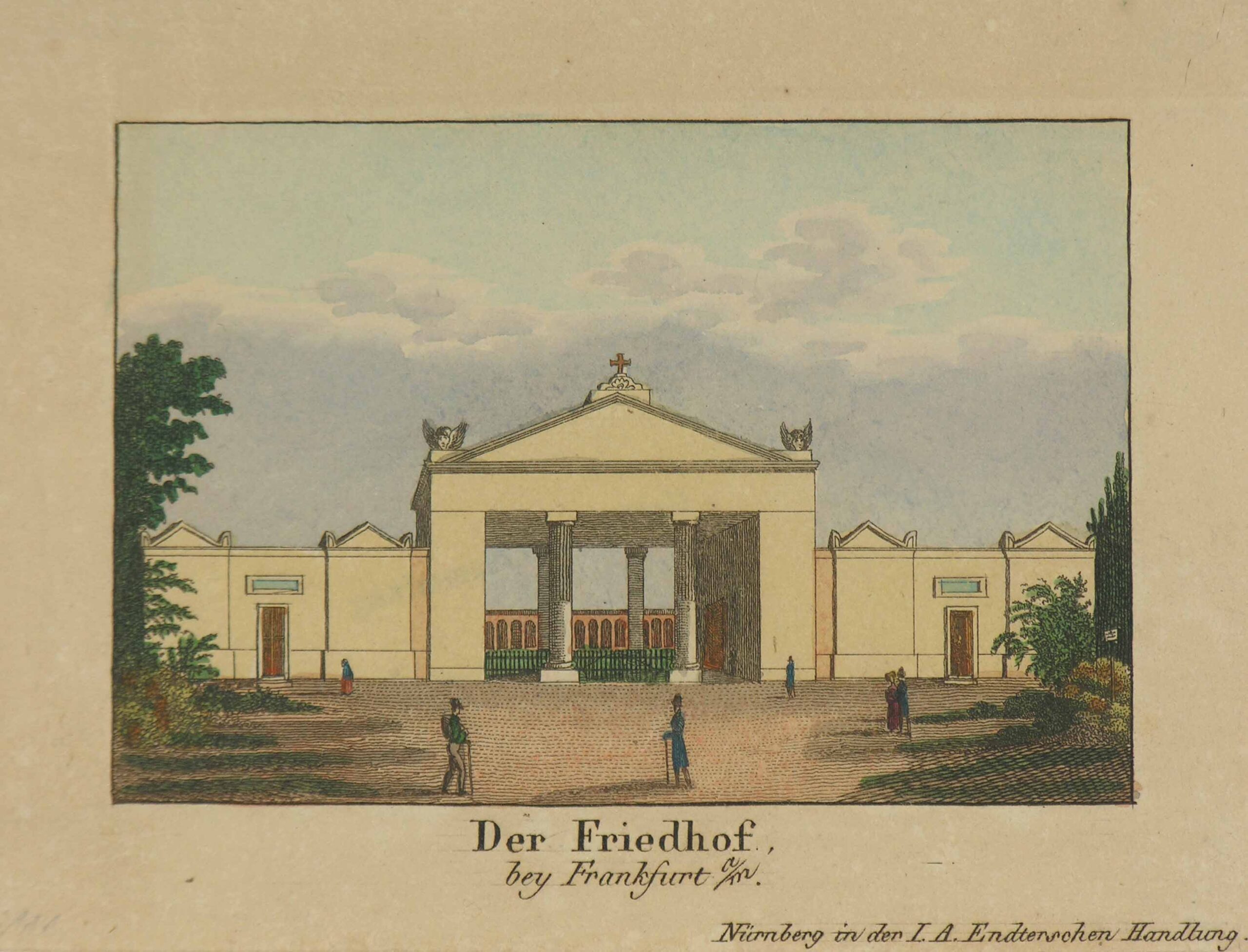 FRIEDHOF –  Der Friedhof bey Frankfurt a/m. Ansicht der Eingangshalle. Nürnberg, Endter, um 1820. Altkolorierter Kupferstich. 7,1 x 10,6. Aus der Sammlung Heinrich Stiebel (Sammlerstempel verso).