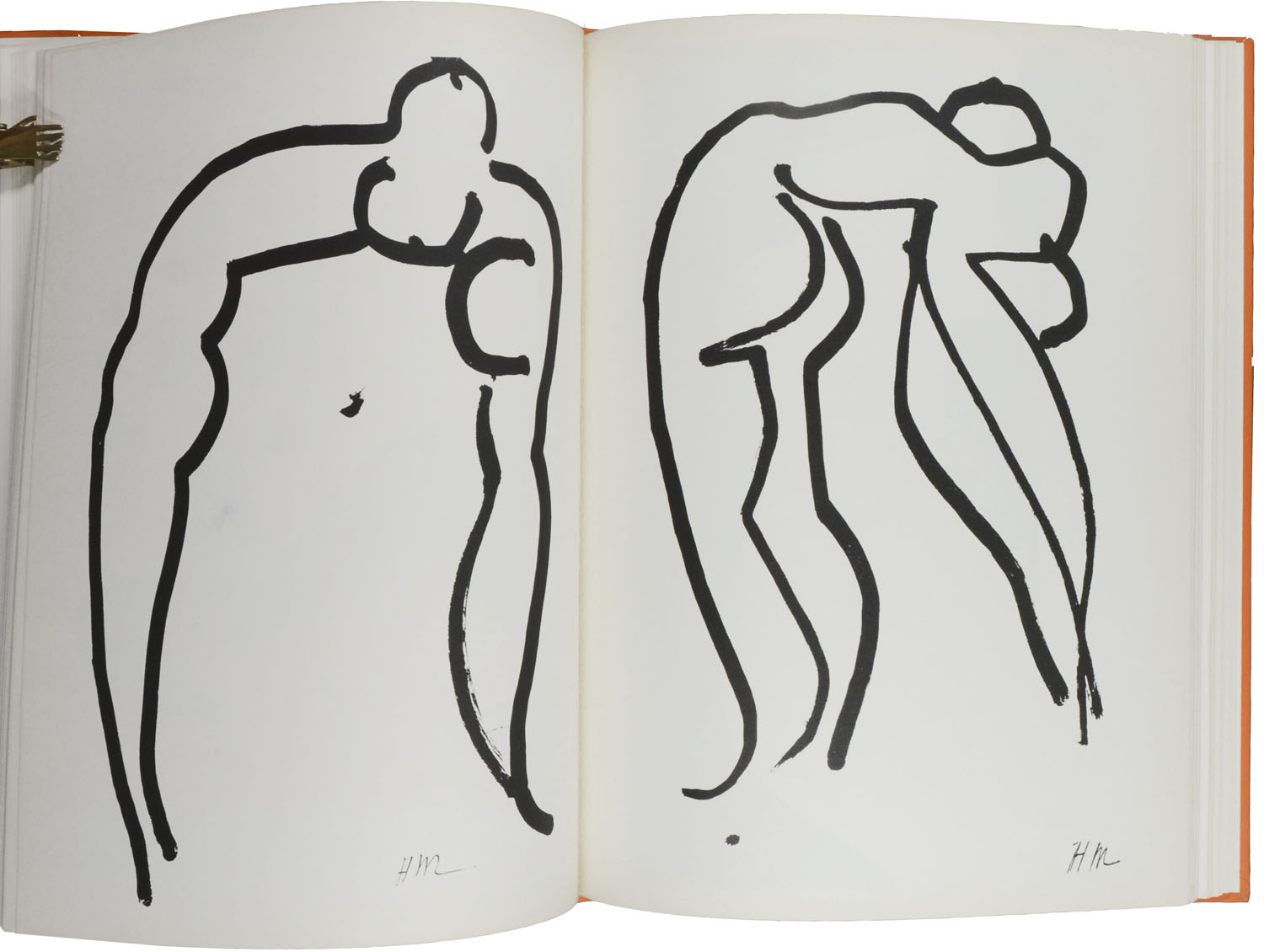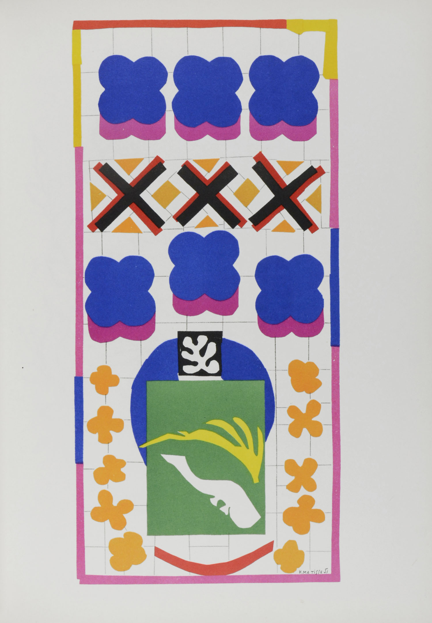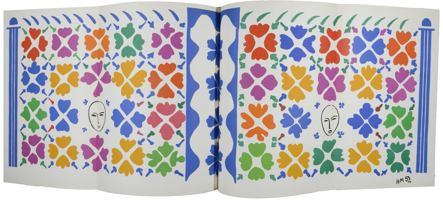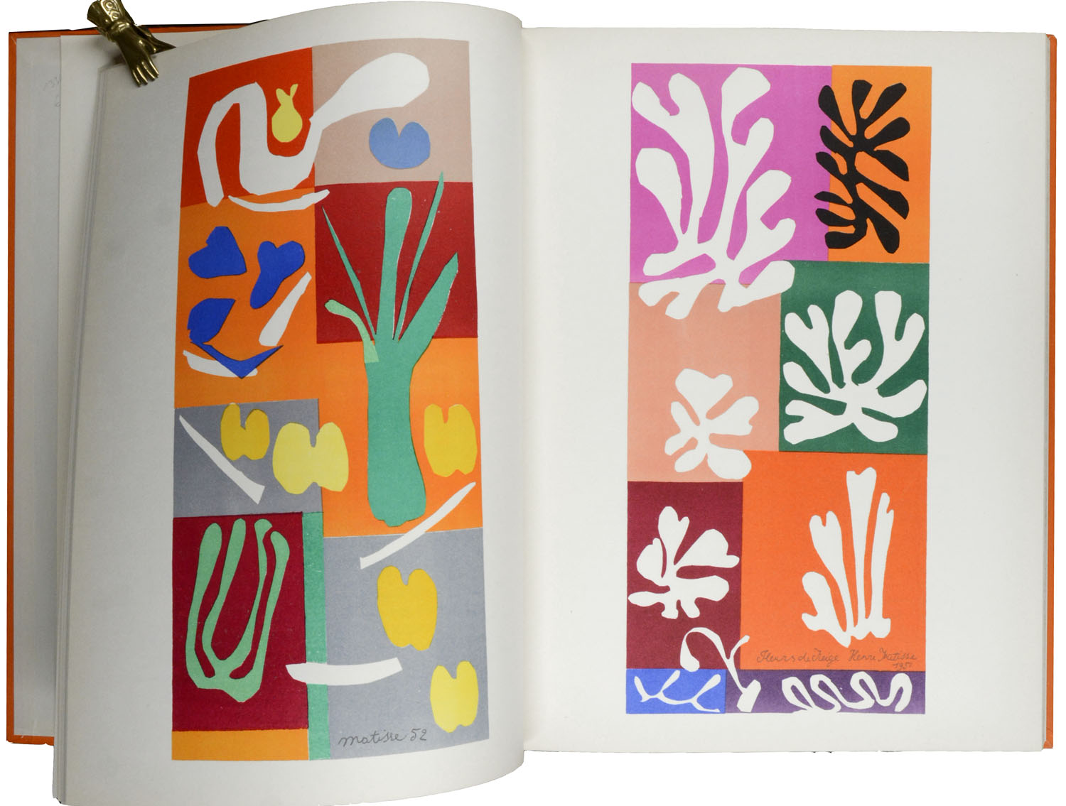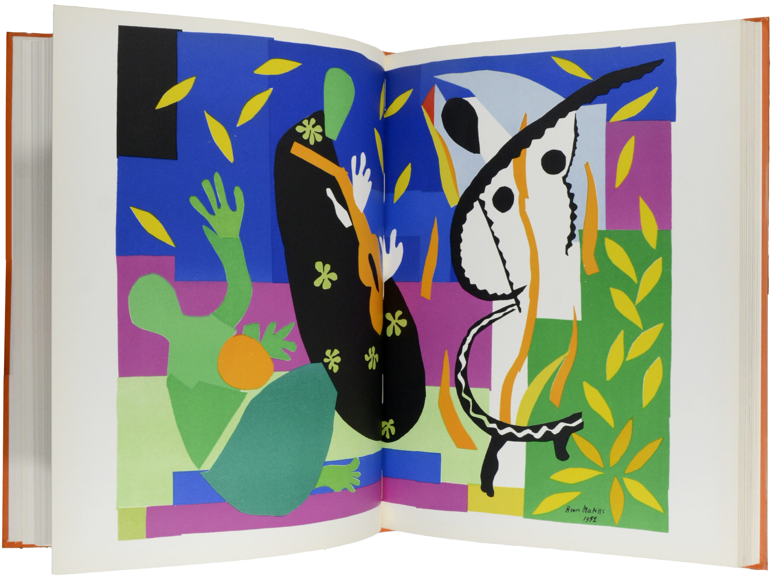 Erste Ausgabe. – Doppelnummer der berühmten Kunstzeitschrift „Verve“, die sich dem Spätwerk von Henri Matisse widmet. In den letzten Jahren seines Schaffens begann Henri Matisse Figuren aus farbigem Papier auszuschneiden und auf Papier anzuordnen. Es entstanden wunderbar leichte, farbenfrohe und tänzerische Bilder. – Er selbst sagte dazu: „Das geschnittene Papier ermöglicht es mir, in der Farbe zu zeichnen. Es handelt sich für mich um eine Vereinfachung. Anstatt den Umriss zu zeichnen und die Farbe darauf zu platzieren – wobei das eine das andere verändert – zeichne ich direkt in der Farbe, die umso maßvoller ist, da sie nicht umgesetzt wird. Diese Vereinfachung garantiert eine Präzision bei der Zusammenführung der beiden Mittel, die nur noch eins sind.“. – Der Umschlag wurde von Matisse speziell für die Ausgabe entworfen. – Der Druck der Lithographien erfolgte bei Mourlot. – Minimal unfrisch, modernes Ex-Libris auf Innendeckel.