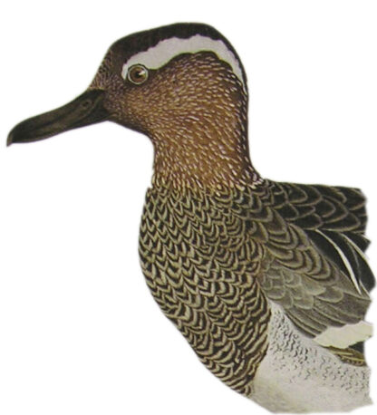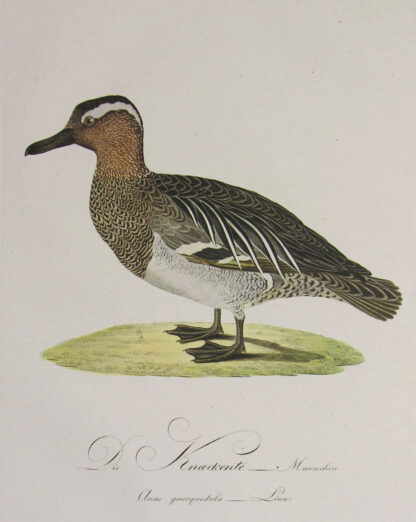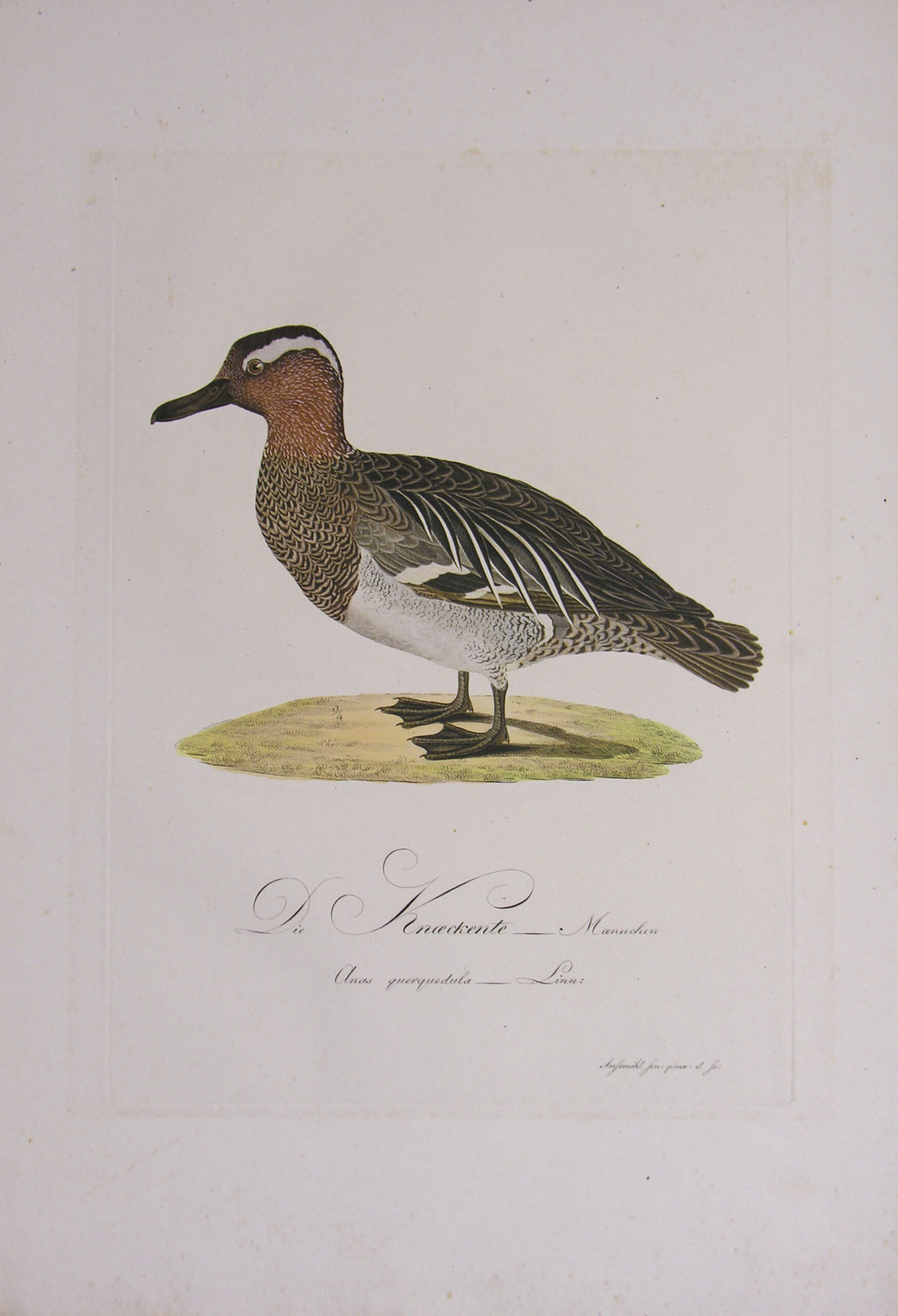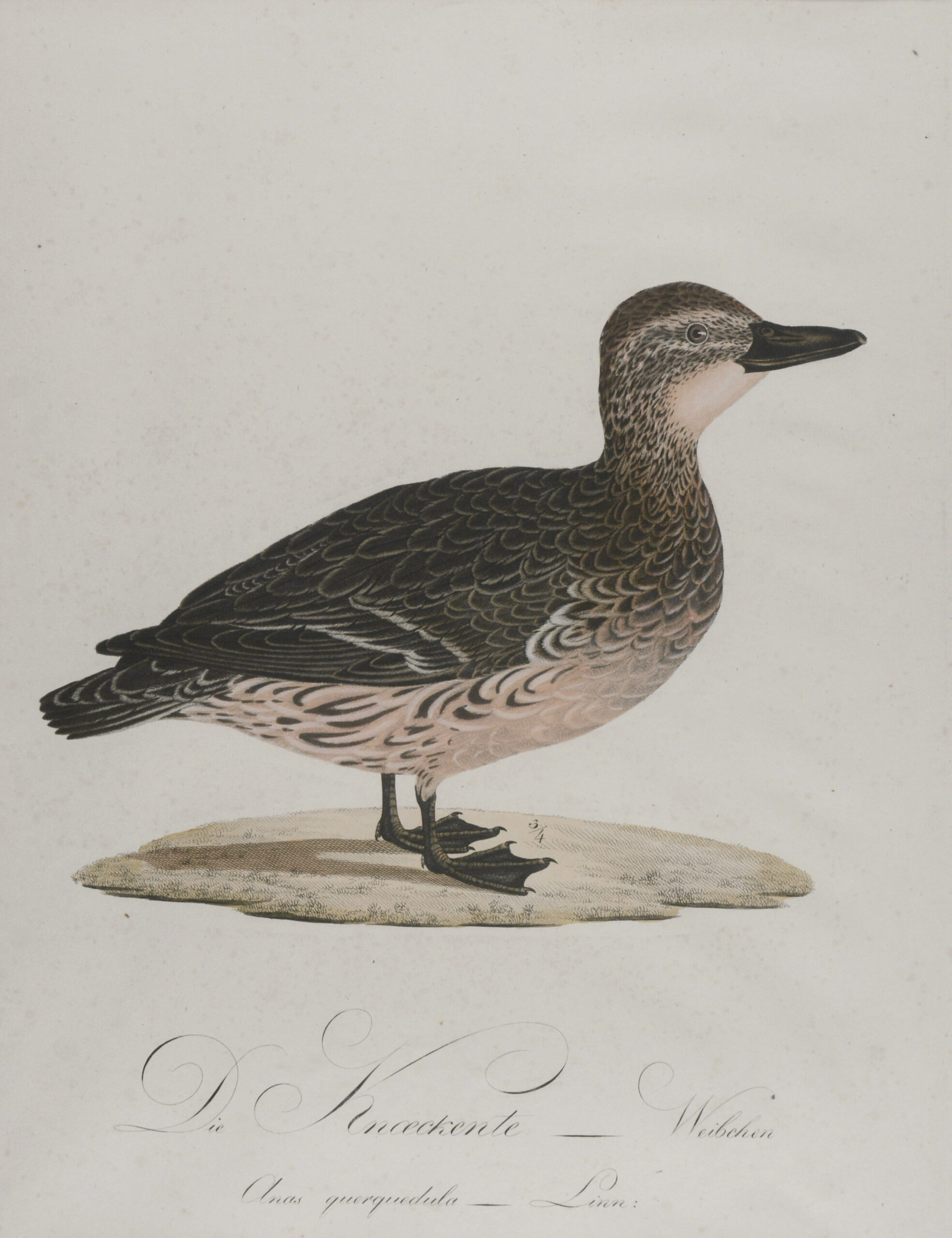 ORNITHOLOGIE – Die Knaeckente. (2 Blatt) Darmstadt, um 1810. Altkolorierte Kupferstiche von Susemihl aus Teutsche Ornithologie. Blattgröße 35 x 50 cm. Nissen IVB 907.
