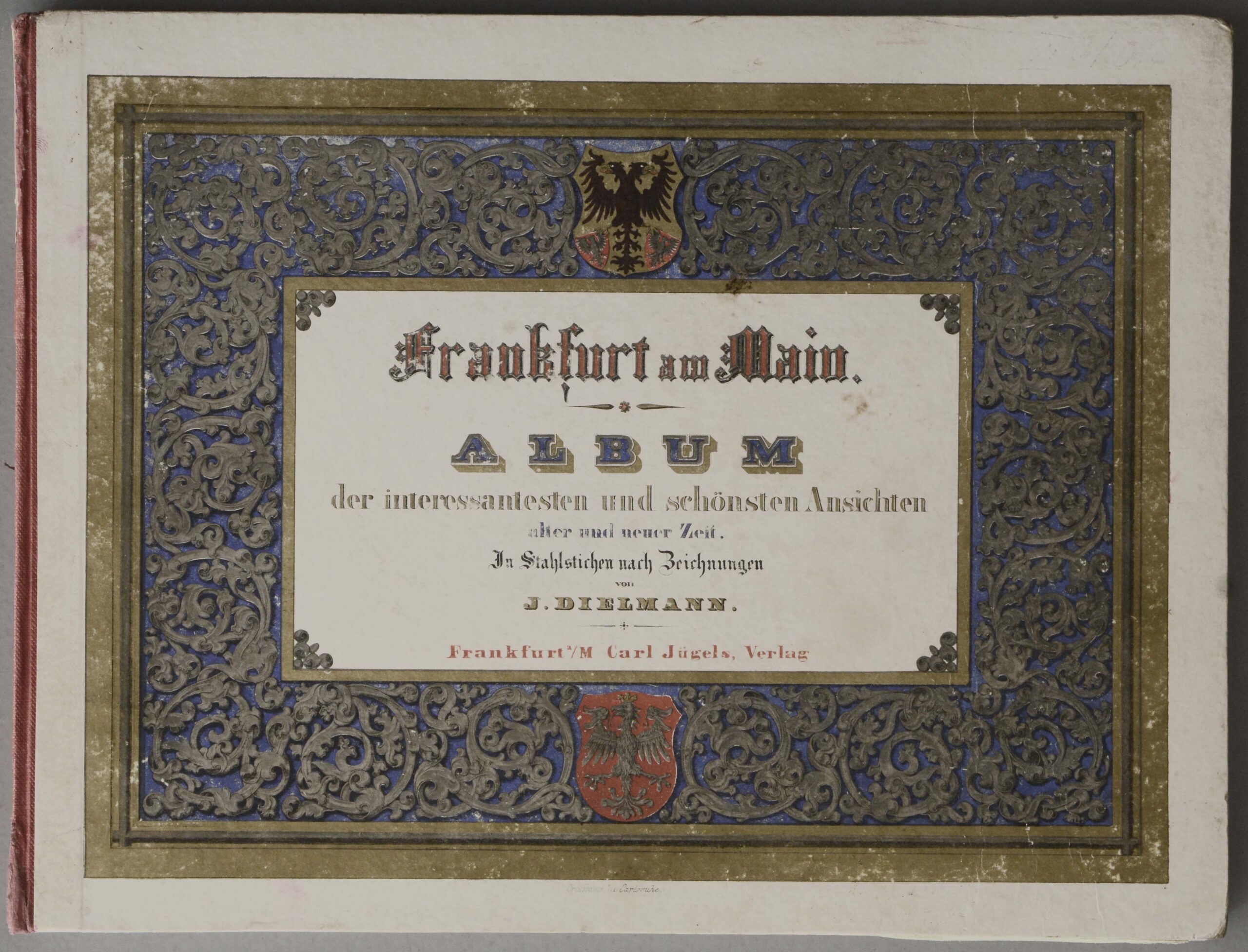 DIELMANN, J. Frankfurt am Main. Album der interessantesten u.schönsten Ansichten alter und neuer Zeit. Frankfurt/M., Jügel, 1845. Quer-4°. Lithographischer Titel, 1 Bl., mit 32 Stahlstichtafeln nach J. Dielmann. Farbig lithographiertes Originalhalbleinen, (gering beschabt, Ecken leicht bestoßen).