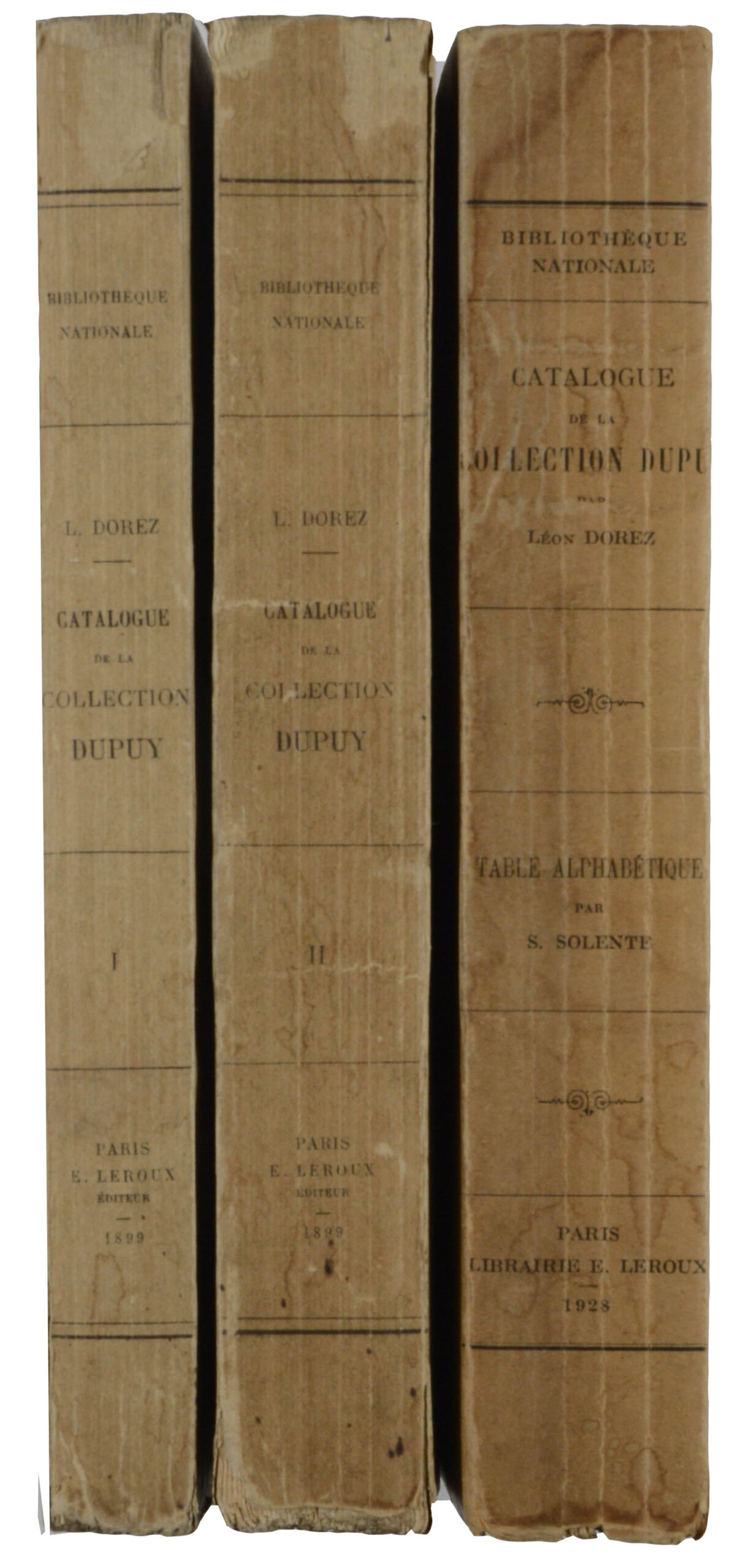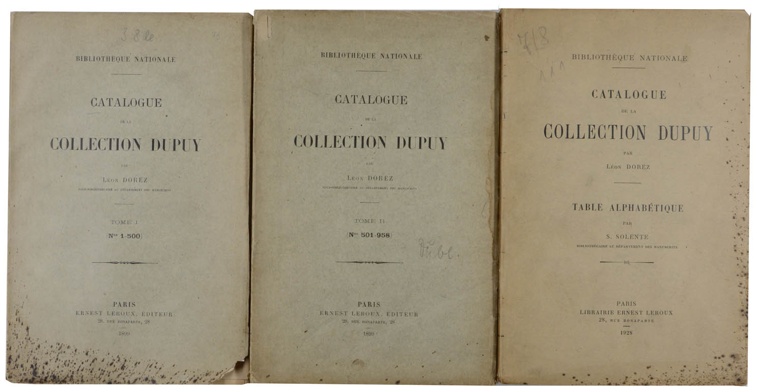 BIBLIOGRAPHIE – DOREZ, Léon (und) S. SOLENTE. Catalogue de al Collection Dupuy. Paris, Ernest Leroux, 1899-1928. 3 Bände. Gross-8°. Mit einer Tafel. Originalbroschur mit Rücken- und Deckeltitel, (Umschläge etwas fleckig und angestaubt).