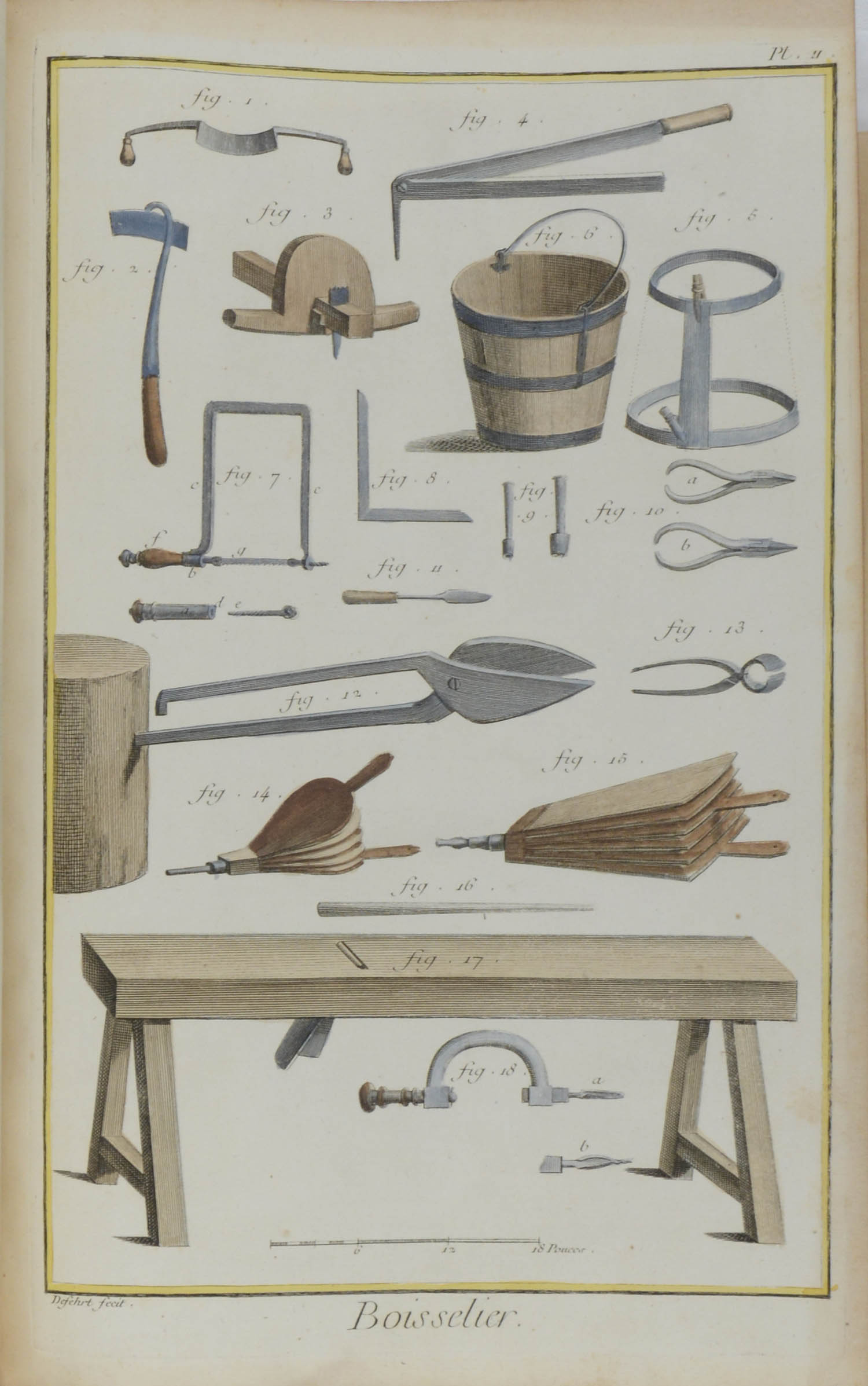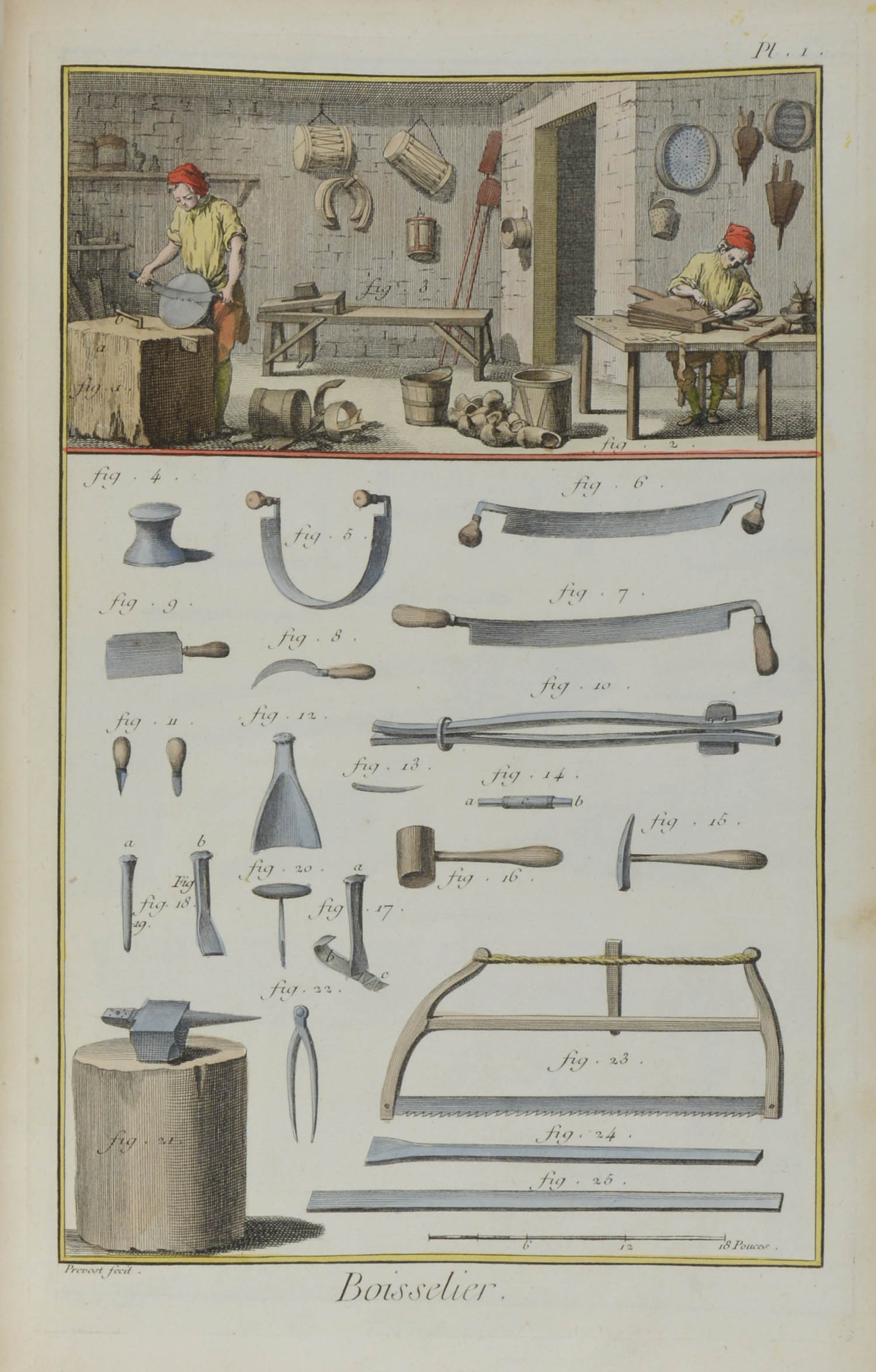 DRECHSLER – SCHEFFELMACHER (Boissellier). 1762-1777. 2 kolorierte Kupferstiche und 1 Textblatt aus Diderot und d’Alembert: Encyclopedie, ou Dictionnaire Raisonne des Sciences, des Arts, et des Metiers. Je ca. 32 x 21. Geheftet, gering stockfleckig.
