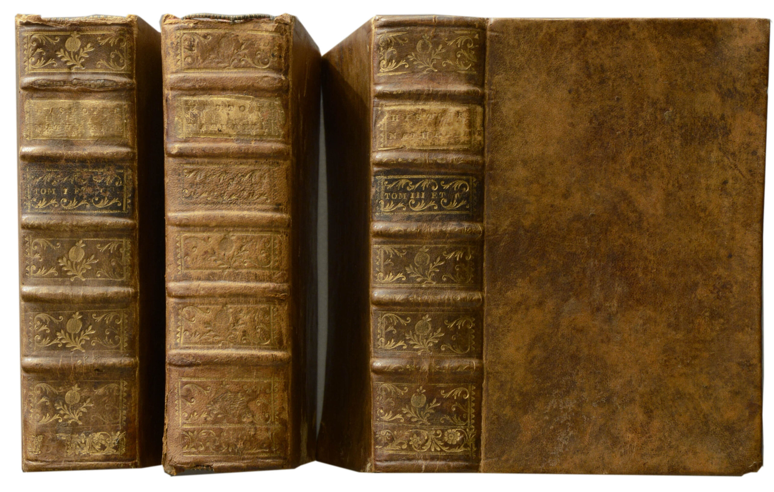 Mit Kapiteln zu allen Bereichen der Naturwissenschaften. – Die Kupfertafeln zeigen Vögel, Fische, ein Schaf, Insekten, Pflanzen, den Vesuv, Siamesische Zwillinge, usw. – 1 Tafel mit kleinem Randeinriss und 1 Tafel etwas knittrig, Stempel auf Titel, Ex-Libris auf Innendeckel. // 6 tomes en 3 volumes. Avec 12 gravures sur cuivre, dont quelques tableaux sont dépliants. Reliures en cuir avec dos à décor doré, légèrement usé, coiffes amorties. Un tableau avec une petite déchirure dans la marge et un tableau est un peu froissé. Estampille sur la page du titre, ex-libris sur le contre-plat. Les gravures montrent des oiseaux, des insectes, un poisson, des plant, des jumeaux conjoints etc. // 6 volumes in 3 volumes. 8vo. With 12 partly folded engraved plates. Contemporary calf with back gilding and back label, (slightly rubbed, buttom of spine bumped). With chapters on all areas of the natural sciences. – The engravings are showing birds, fish, a sheep, insects, plants, Vesuvius, Siamese twins, etc. – 1 plate with small tear and 1 plate slightly creased, stamp on title, ex-libris on inside cover.