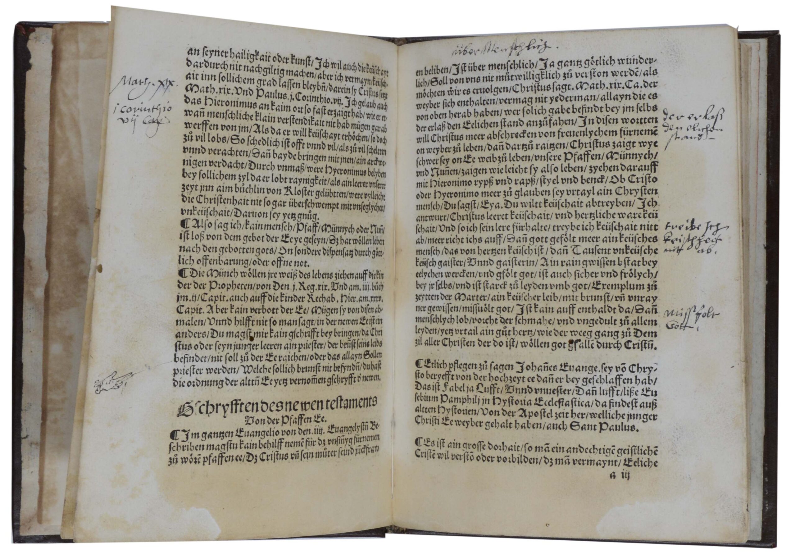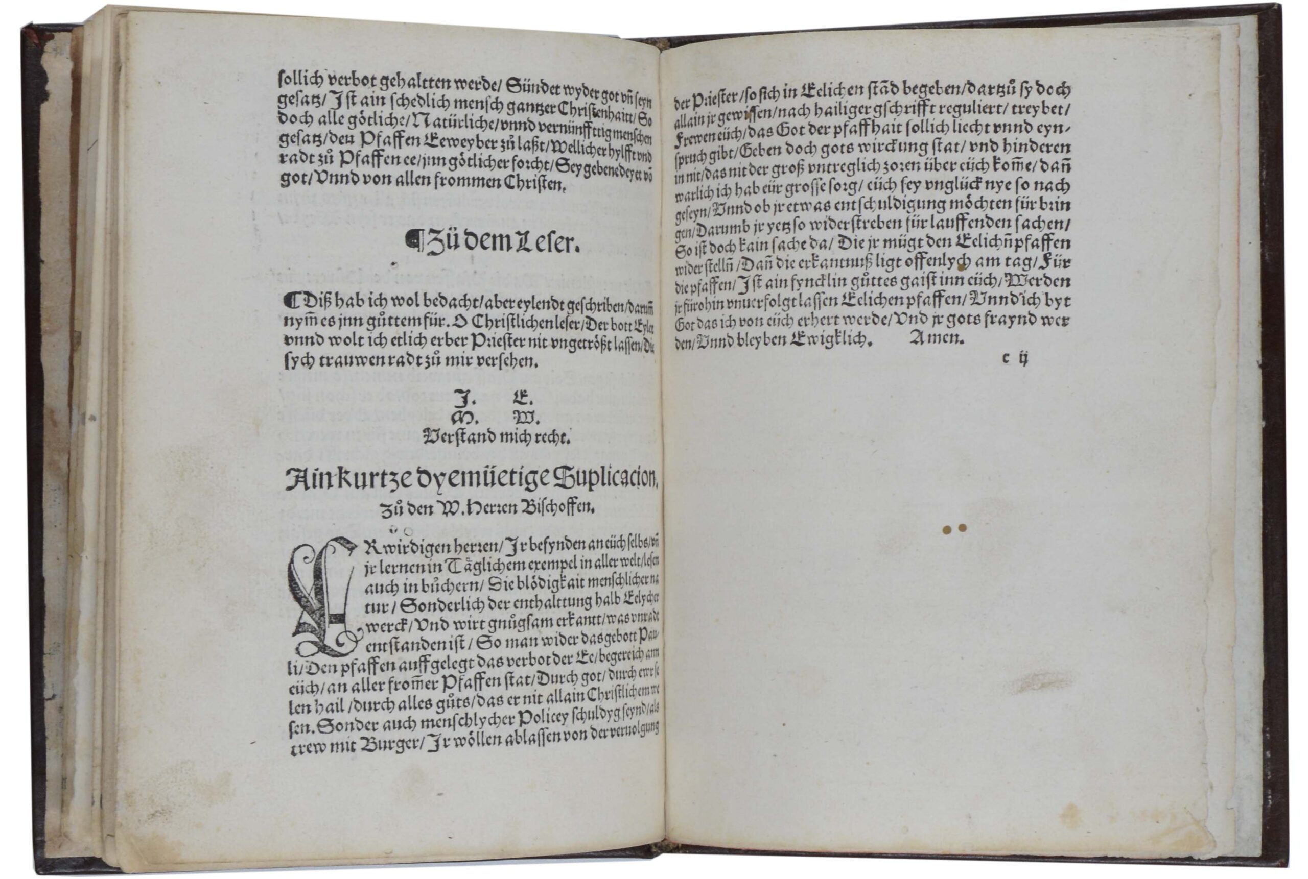 Erste Ausgabe, sehr selten. – VD16 E 156; Hohenemser 2910; Muller, Vogtherr 94. – Johann Eberlin aus Günzburg (um 1470-1533) zählt, neben Luther, zu den wortgewaltigsten Schriftstellern und Verfassern der beginnenden Reformation. – Diese Flugschrift zählt zu den ersten reformatorischen Schriften, die sich kritisch mit dem Zölibat auseinandersetzten. Eberlin appelliert an die Bischöfe, ihren Widerstand gegen die Priesterehe aufzugeben und prangert die öffentliche Schädlichkeit des Zölibats an. – Der reizvolle Titelholzschnitt (abgebildet in mehreren Werken über die Reformation) von Heinrich Vogtherr zeigt drei Geistliche die heiraten. Im Vordergrund werden ein Bischof und eine vornehme Dame getraut, im Hintergrund ein Priester und eine Nonne, sowie ein Mönch und eine Dame. – Mit zeitgenössischen Anmerkungen am Rand. Braun- und fingerfleckig, durchgehendes Wurmloch mit minimalem Bild- bzw. Buchstabenverlust.