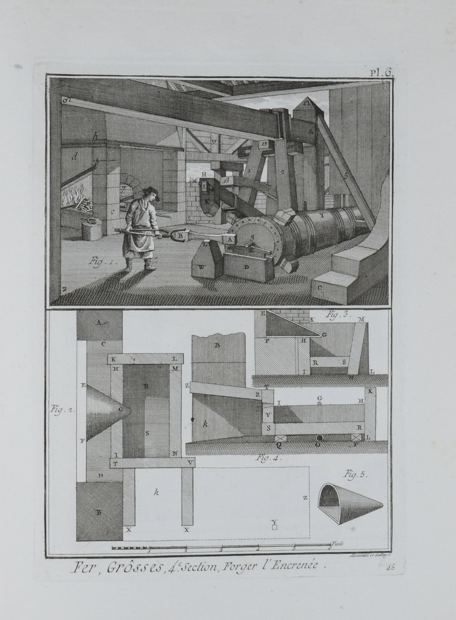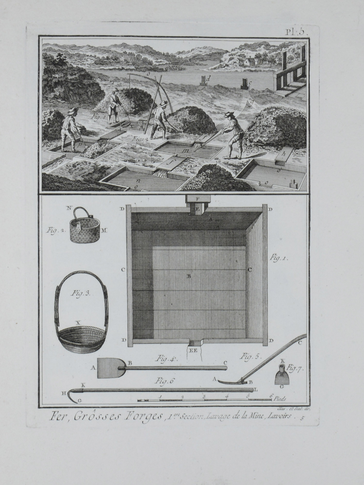 EISENERZABBAU und ERZVERHÜTTUNG (Forges ou art du fer; 1ere – 6e section). Um 1785. 52 (davon 13 doppelblattgroße) Kupferstiche aus Diderot und d’Alembert: Encyclopedie, ou Dictionnaire Raisonne des Sciences, des Arts, et des Metiers. Je ca. 22 x 16 und 22 x 34. Teils lose, erstes Blatt leicht gebräunt, gering stockfleckig.