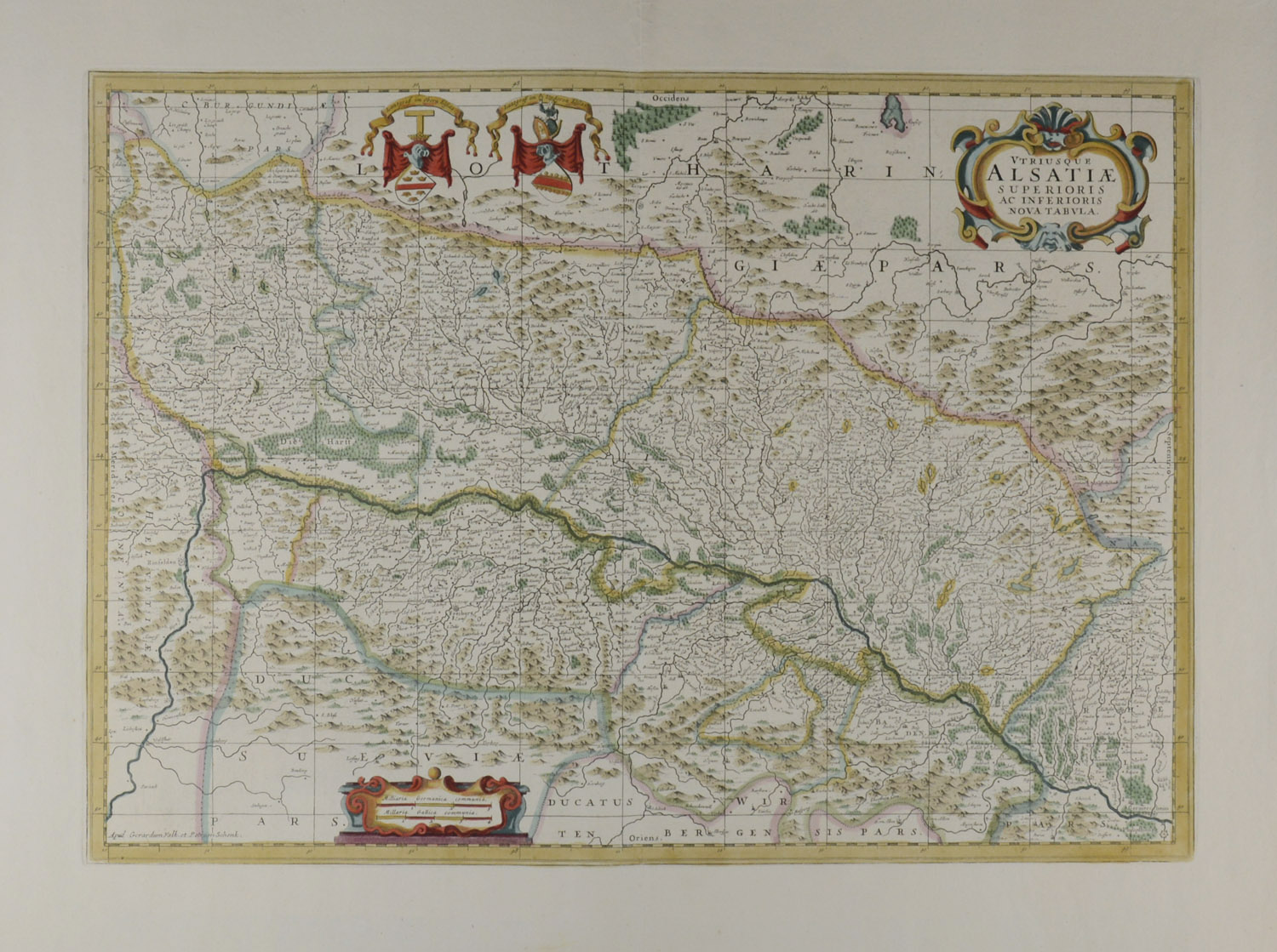 ELSASS – „Utriusque Alsatiae superioris ac inferioris nova tabula“. Amsterdam, Gerardium Valk und Petrum Schenk, um 1700. Altkolorierte Kupferstich-Karte von 54×38,5. Bugfalte. Breitrandiges Blatt.