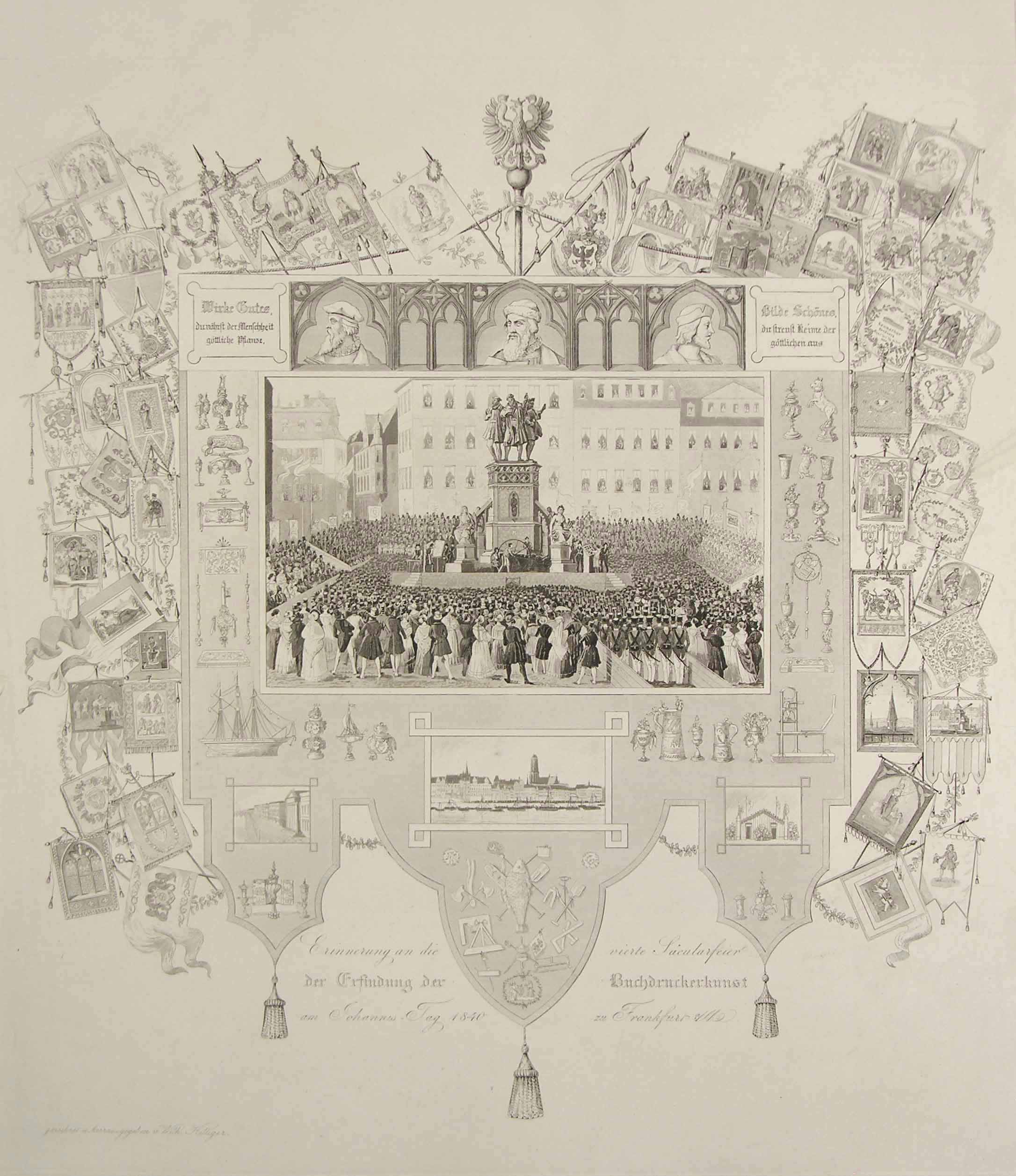 GEDENKBLATT – Erinnerung an die vierte Säcularfeier der Erfindung der Buchdruckerkunst am Johannes-Tag 1840 zu Frankfurt a.M. Mittig das Gutenberg-Denkmal in Frankfurt umgeben von 52 Vereinsfahnen und zahlreichen Gegenständen, darunter eine Gesamtansicht und 2 kleine Detailansichten von Frankfurt. Back, 1840. Stahlstich von Wilh. Hilliger. 42,5 x 39,5. Slg. Cornill 1853.