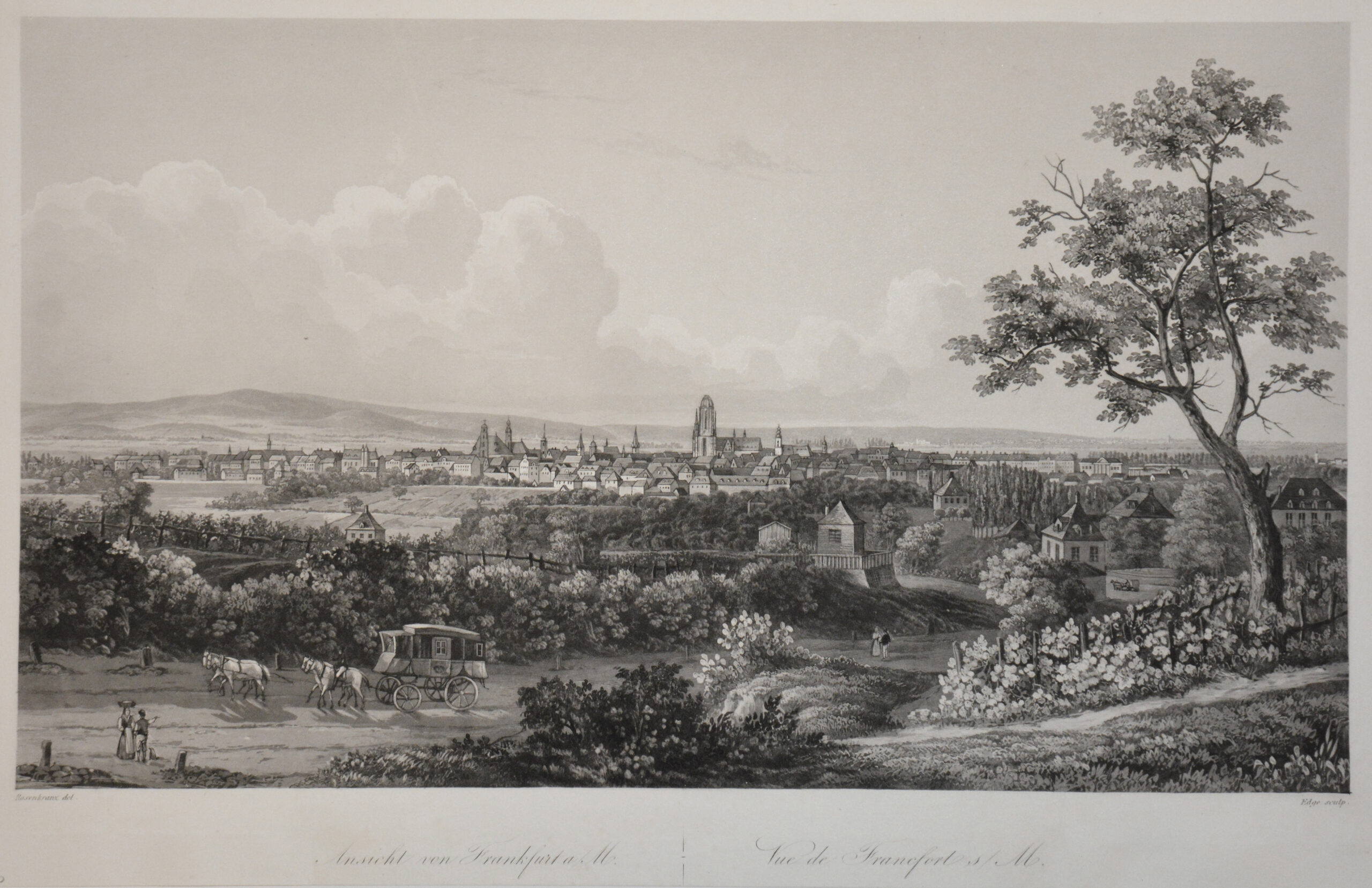 Sauberes und seltenes Blatt. – Reizvolle Ansicht Frankfurts vom Sachsenhäuser Berg aus, nach einer Vorlage des Landschaftsmalers und Schülers von Ernst Radl, Johann Heinrich Rosenkranz (1801-1851).