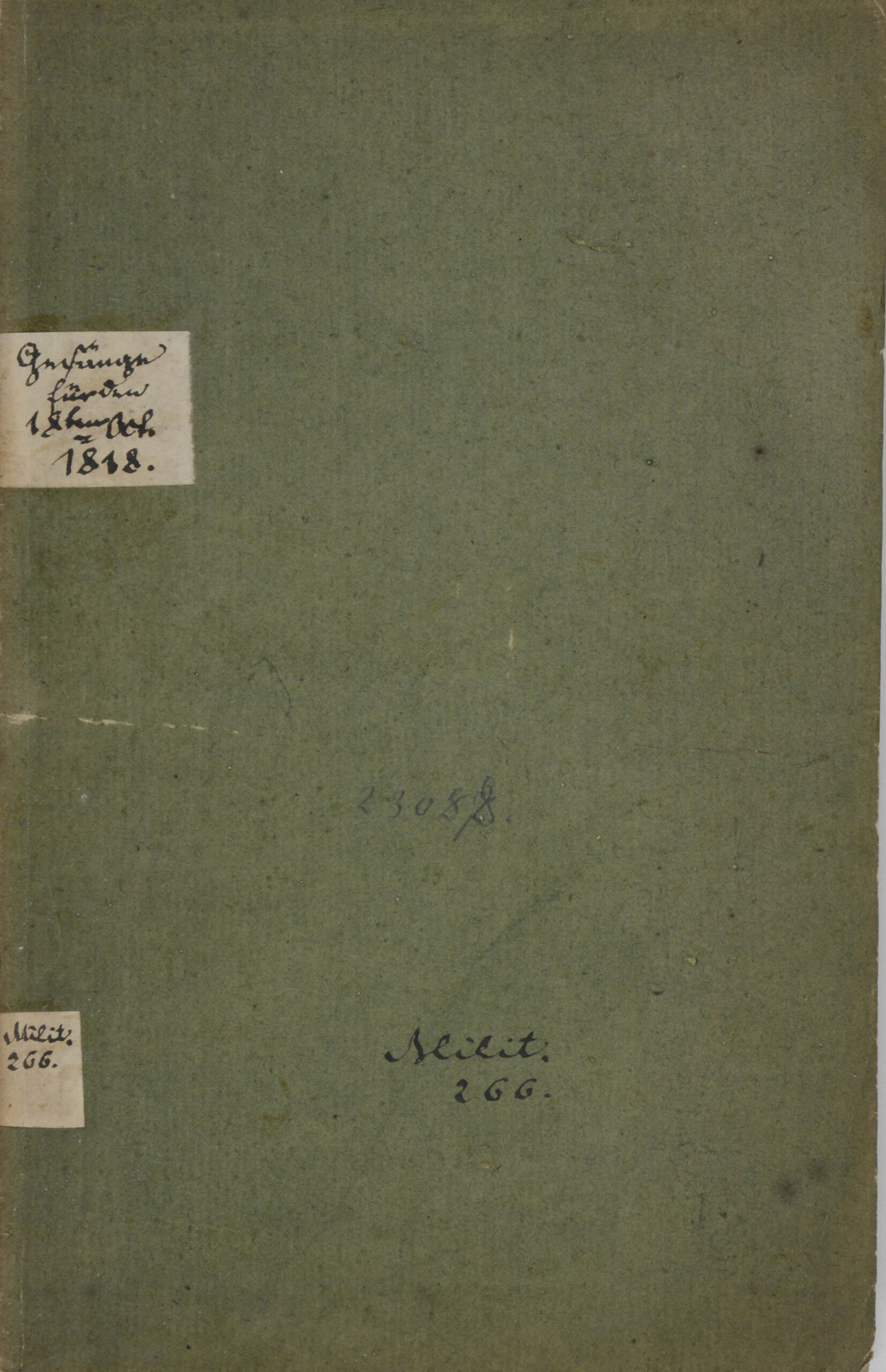 FRANKFURT – Gesänge und ein Gebet für die Landwehr und Besatzung der freien Stadt Frankfurt bei der religiösen Feier des fünften Jahrestages der Leipziger Rettungsschlacht auf freiem Felde: Frankfurt, Sauerländer, 1818. 8°. 14 S. Interimsbroschur der Zeit, (alte Signaturschildchen auf Umschlag).