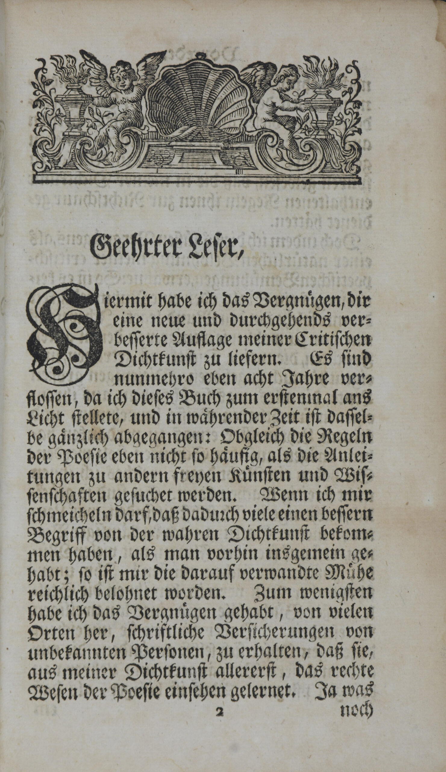 Goedeke III, 361, 38; VD 18: 11404547; Faber du Faur 1764. – Zweite überarbeitete Ausgabe von Gottscheds maßgeblichem Werk, in dem er neuartige Regeln für das Verfassen lyrischer und epischer Texte, sowie des Dramas festlegt. Zunächst als Kompendium für seine Lehre an der Universität Leipzig gedacht, entwickelt er die letzte große deutsche Regelpoetik und bildet eine Grundlage der Ästhetik. – Ohne das gestochene Frontispiz. – Gering gebräunt, sonst gutes Exemplar.