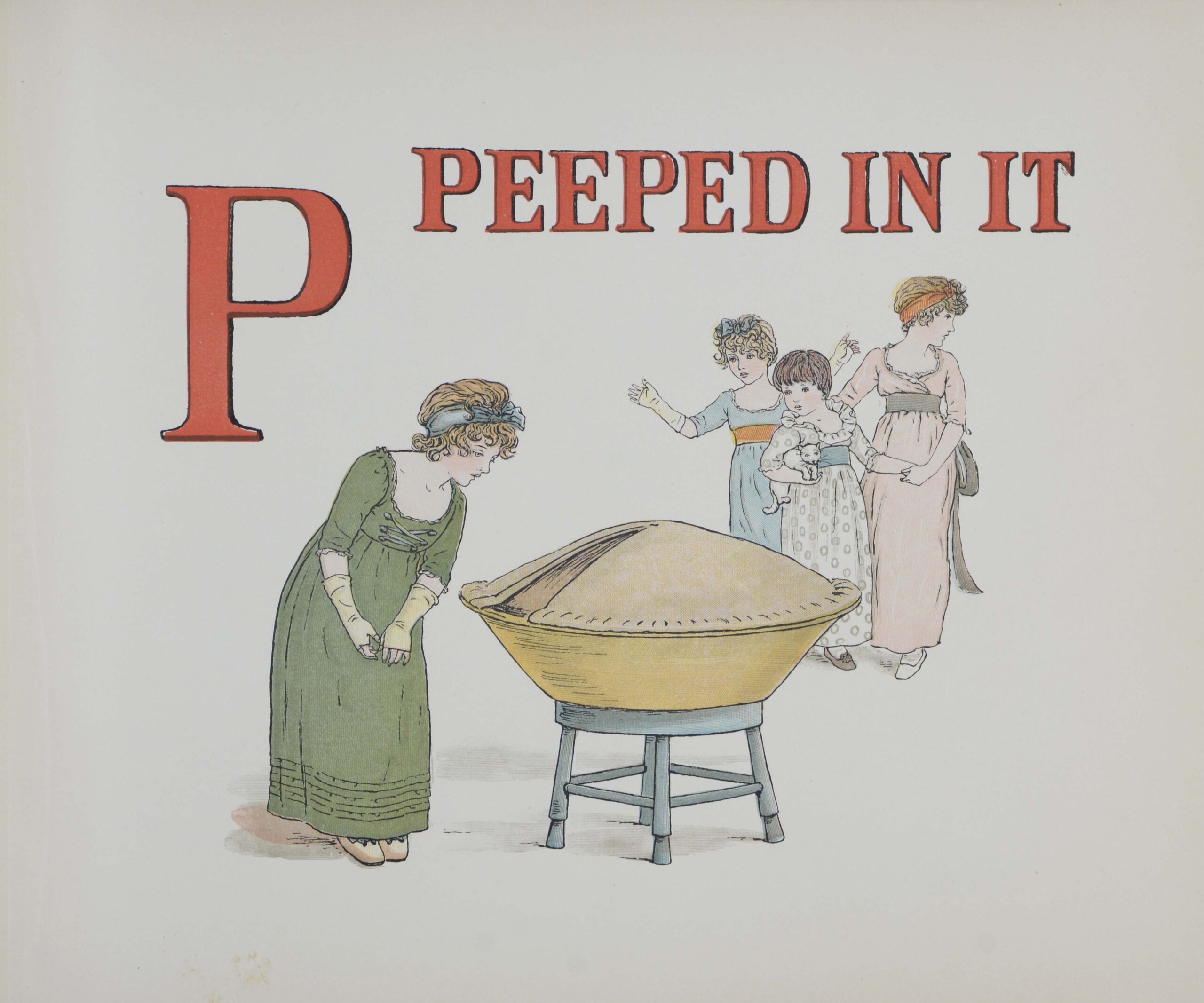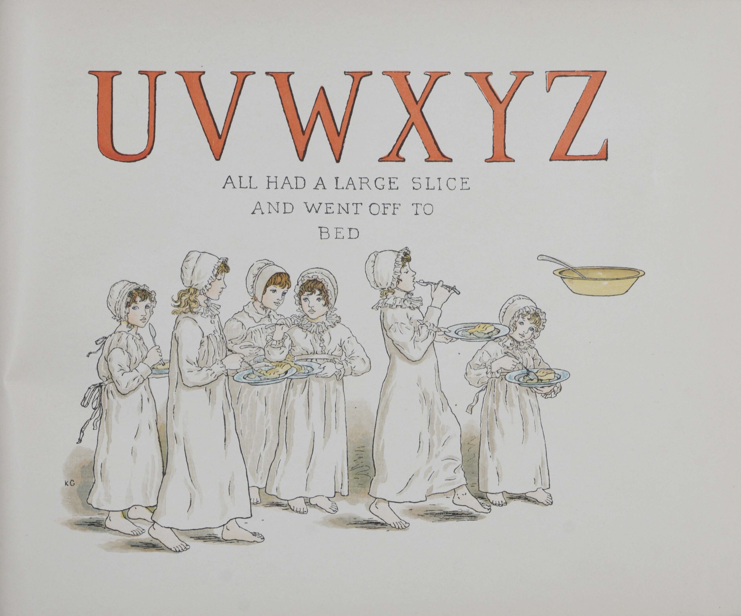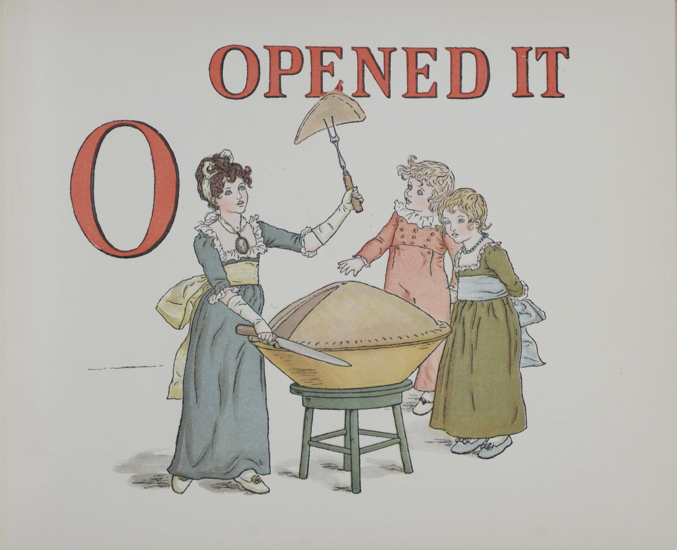 Erste Ausgabe. – Spielman/Layard S. 58, 155; Osborne I, 90; Muir 200. – Hübsches ABC-Buch, in dem in 20 Bildergeschichten erzählt wird, was einem Apfelkuchen so alles widerfahren kann. – „G.schafft einen Kindertyp, in dem sich charakteristische Merkmale der viktorianischen Zeit spiegeln. Diese Miniaturen der Erwachsenenwelt, zart koloriert in Rüschenkleidern, halfen den Geschmack der Zeitmode mitzubestimmen… Im Werk der G. vereinigen sich Harmonie zwischen Kind, Tier und Natur.“ (Doderer I, 463). – Die Farblithographien wurden von Edmund Evans gefertigt. – Etwas stockfleckig, Innengelenke geklebt, fliegender Vorsatz mit kleinem Eckabriss.