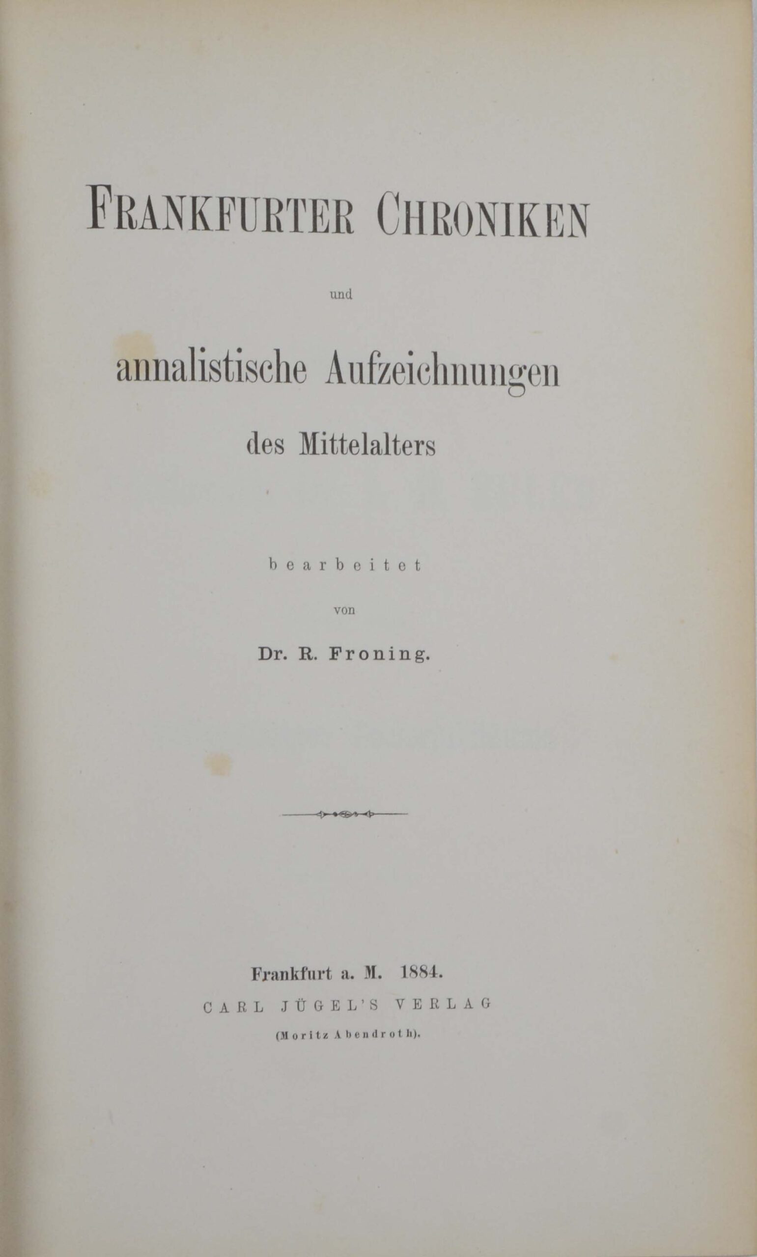 Erste Ausgabe. – 1) Frankfurter Chroniken und annalistische Aufzeichnungen des Mittelalters, bearbeitet von R.Froning; 2) Frankfurter Chroniken und annalistische Aufzeichnungen der Reformationszeit. nebst einer Darstellung der Frankfurter Belagerung von 1552, bearbeitet von R.Jung. – Seltene Originalausgabe des grundlegenden Werkes für die Geschichte des Mittelalters und der Reformation in Frankfurt. – Papierbedingt gering gebräunt, teils mit Anmerkungen in Bleistift und Tinte. Ex-Libris (Erich von Beckerat) auf Innendeckel.