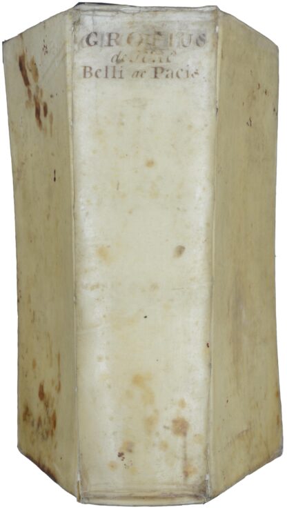 Etwas spätere und von dem Philologen Johann Friedrich Gronovius (1611-1671) neu kommentierte Ausgabe. – Ter Meulen et Diermanse 592 – Wichtigstes Werk des bekannten politischen Philosophen Hugo Grotius (1583-1645), der damit als der „Vater des modernen Völkerrechts“ gilt. – „Sein epochemachendes Werk ist die erste systematische weltliche Darstellung des Völkerrechts, und wenn sie auch von ihm noch „De iure belli ac pacis“ genannt wurde, so war es doch das erstemal, daß dem Recht des Friedens ebensoviel Aufmerksamkeit geschenkt wurde wie dem Recht des Krieges. …wer es mit Hingabe durcharbeitet, wird den großartigen Entwurf, die Schönheit der Sprache und des Aufbaues dieses Kunstwerks bewundern, das, in klassischer wie in christlicher Sphäre sich bewegend, einen Eindruck hinterläßt wie Dantes Göttliche Komödie!“ (Auvermann, Europ. Rechtsgeschichte II, 187). – „Von diesem Buche geht aus eine neue Richtung der Rechtswissenschaft: das Naturrecht verläßt die abstrakten Regionen; es wird juristisch, erzeugt ein Völkerrecht, durchdringt das positive Recht und erobert die Herrschaft über die ganze Rechtsauffassung.“ (Stintzing/L. III, 1, 1) – Namenszug von alter Hand auf Vorsatz, durchgehen an den Rändern wasserfleckig.