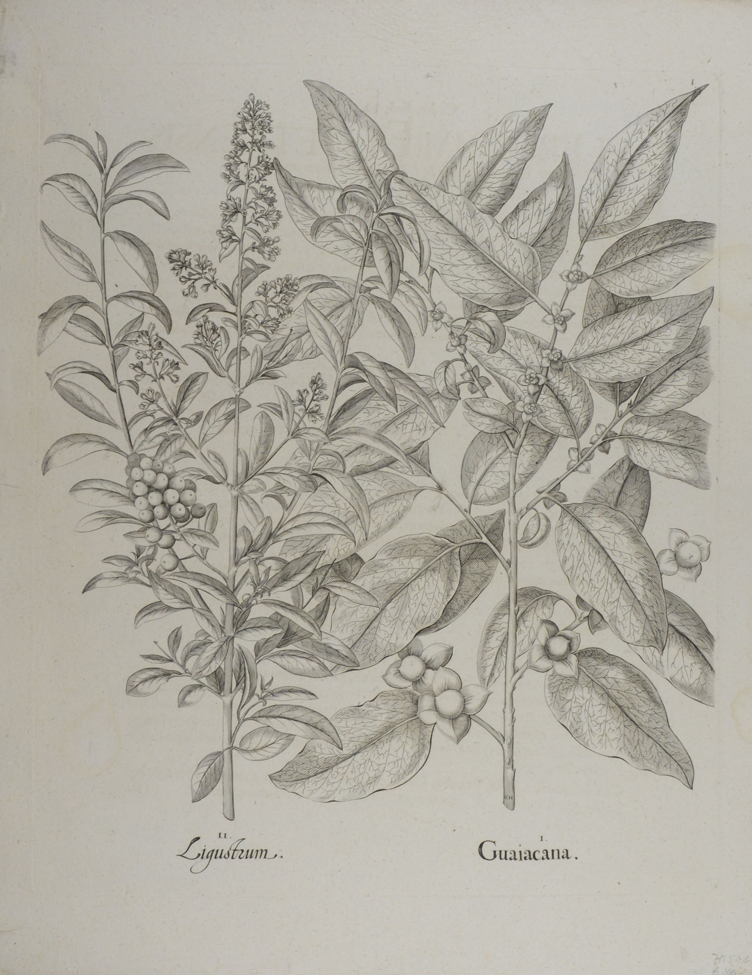 Hortus Eystettensis – Guaiacana (und) Ligustrum. Dattelpflaume und Liguster. 2 Pflanzendarstellungen auf einem Blatt. Nürnberg, nach 1613. Kupferstich aus B. Besler: Hortus Eystettensis. 46 x 39,5. Ränder gering eingerissen, kaum sichtbarer Wasserfleck am rechten Rand.