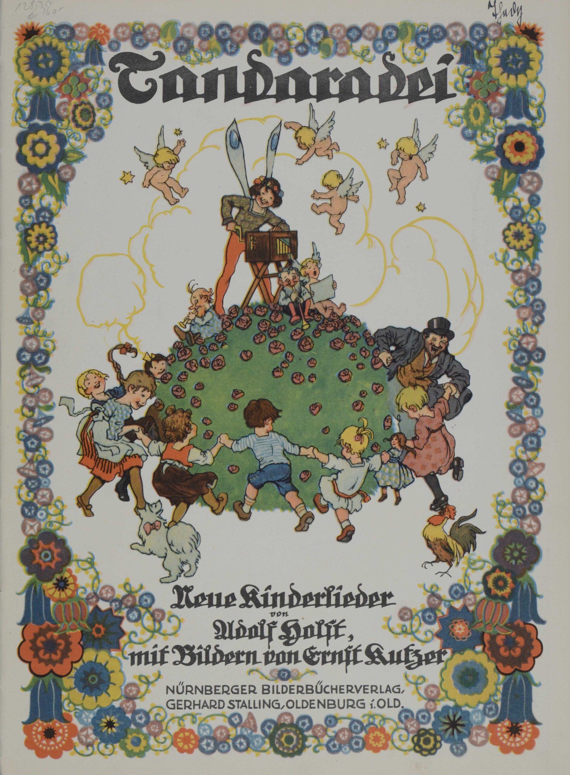 HOLST, Adolf.  Tandaradei. Neue Kinderlieder. Oldenburg, Stalling, 1924. 5. Auflage. 4°. 8 nn. Bl., mit farbigen Illustrationen von Ernst Kutzer. Farbig illustriertes Originalhalbleinen, (gering beschabt).