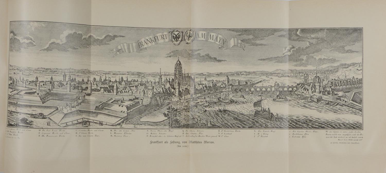 HORNE, Anton. Geschichte von Frankfurt am Main in gedrängter Darstellung. Leipzig u. Frankfurt a.M., Kesselring’sche Hofbuchhandlung., (1902). 4., erweiterte und verbesserte Auflage. Gr.-8°. VIII, 354 S., 1 Bl. Mit 7 gefalteten Tafel und 30 Textabbildungen. Originalleinen mit Rücken – und Deckeltitel, (minimal beschabt).