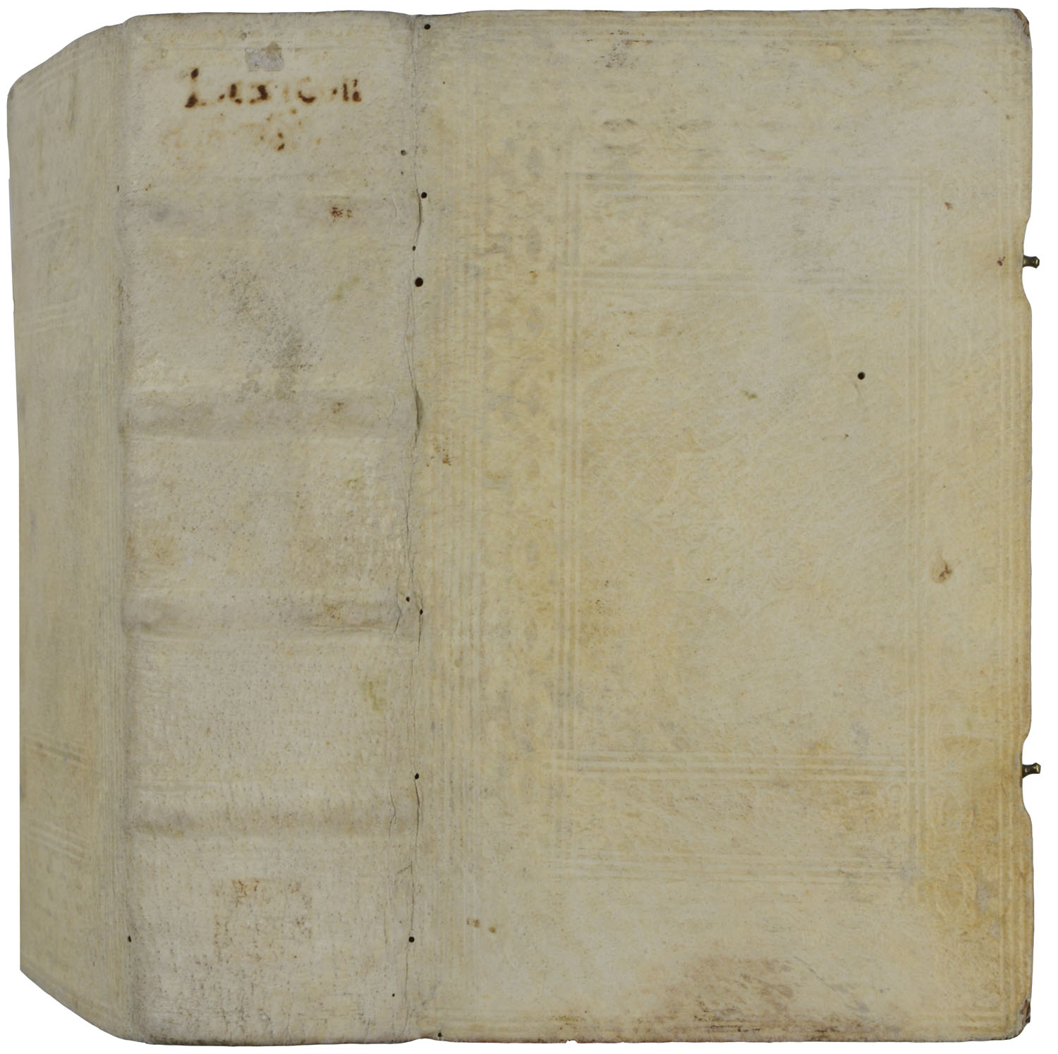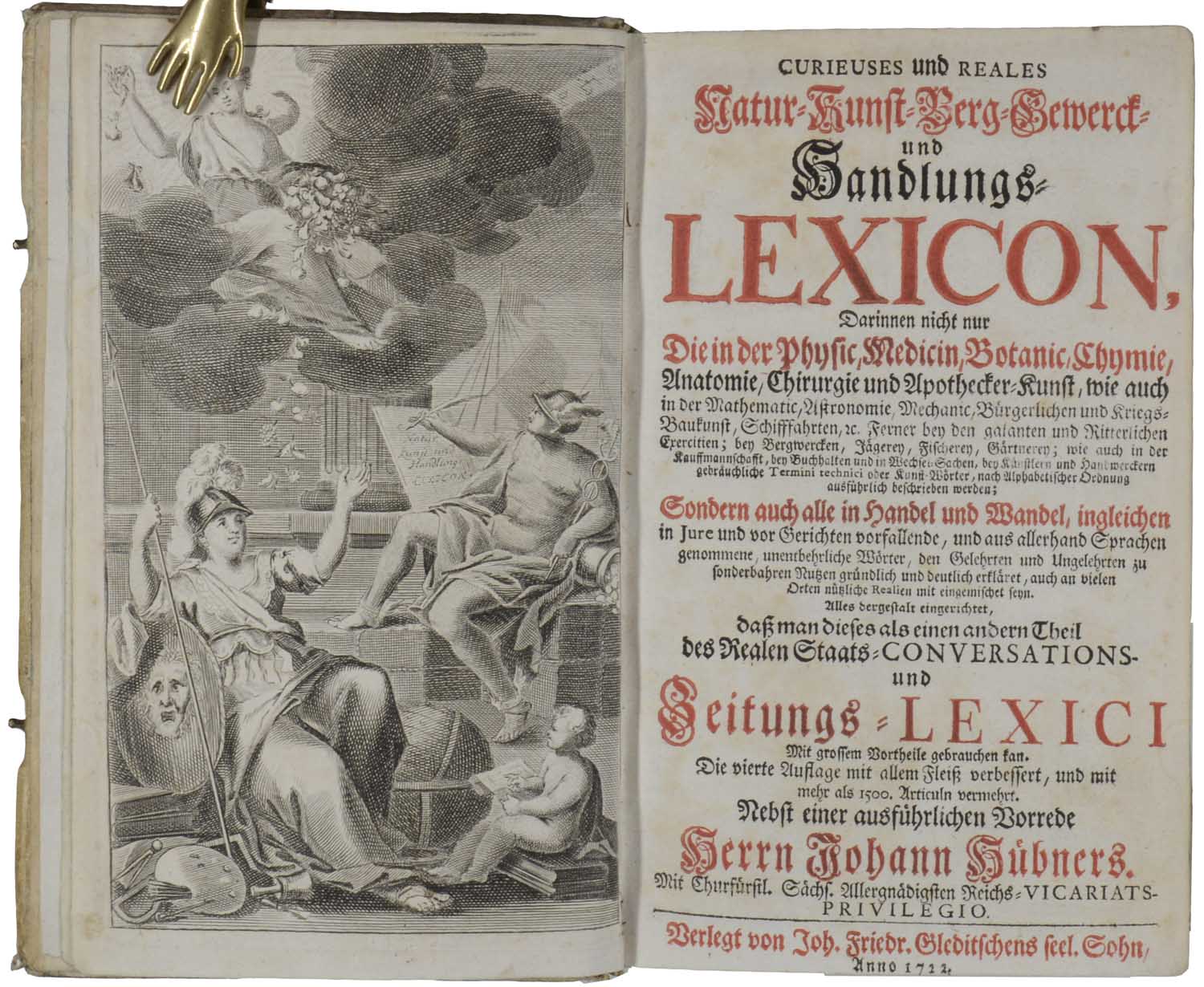 HÜBNER, Johann. Curieuses und reales Natur-Kunst-Berg-Gewerck- und Handlungs-Lexicon, Darinnen nicht nur Die in der Physic, Medicin, Botanic, Chymie, Anatomie, Chirurgie und Apothecker-Kunst, wie auch in der Mathematic, Astronomie, Mechanic, Bürgerlichen und Kriegs-Bau-Kunst, Schiffahrten … Sondern auch alle im Handel und Wandel, ingleichen im Jure und vor Gerichten vorfallende, und aus allerhand Sprachen genommene, unentbehrliche Wörter, den Gelehrten und Ungelehrten zu sonderbarem Nutzen gründlich und deutlich erkläret, auch an vielen Orten nützliche Realien mit eingemischet sind…. daß man dieses als einen andern Theil des Realen Staats-Conversations und Zeitungs-Lexici … gebrauchen kann. Leipzig, Gleditsch, 1722. Vierte Auflage. 8°. Gestochenes Frontispiz, 7 nn. Bl., 2080 Sp. Blindgeprägtes Schweinsleder der Zeit, (ohne die Schließen, gering fleckig).