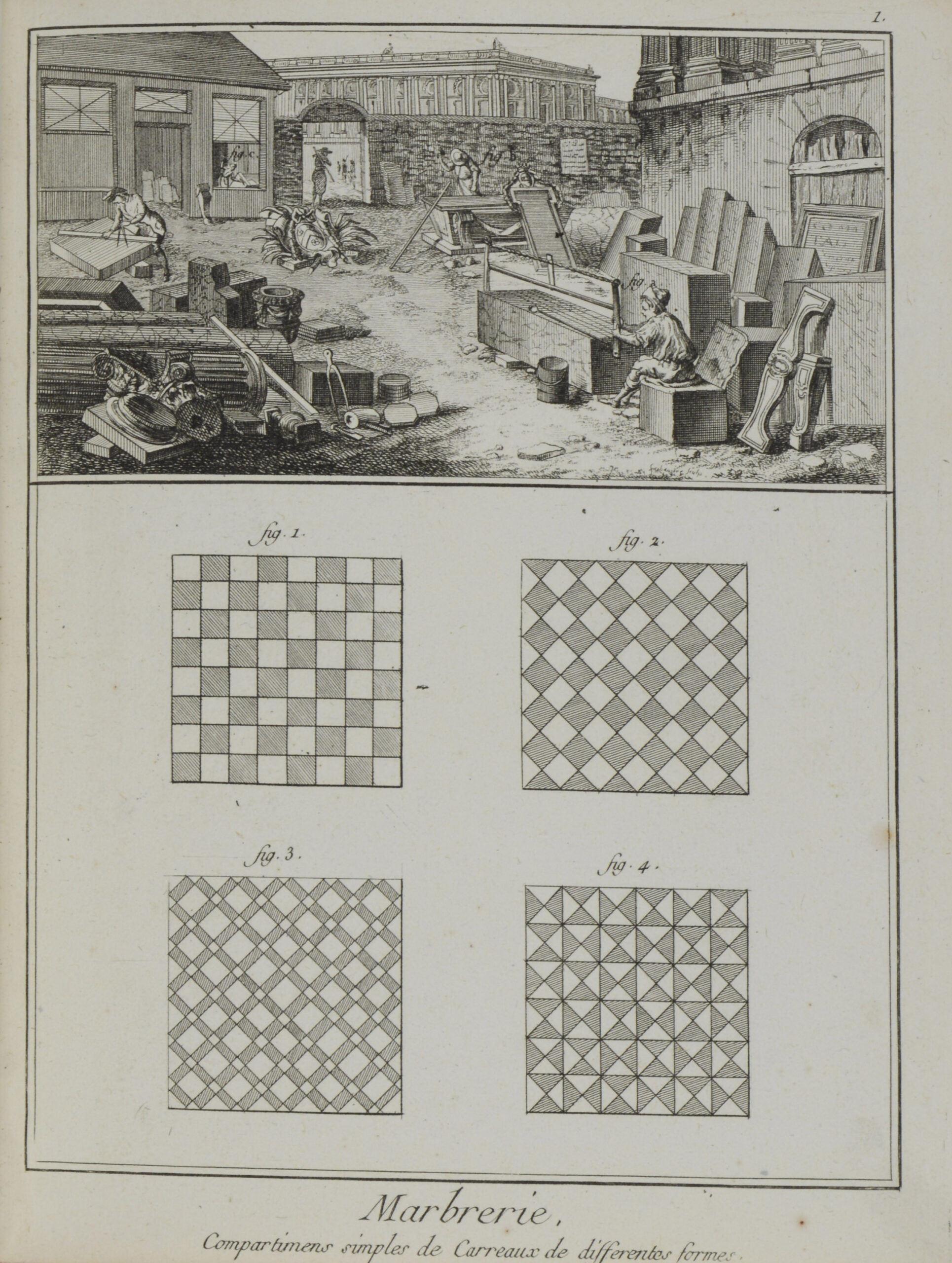 MARMORBEARBEITUNG (Marbrerie). Um 1785. 10 (davon 3 doppelblattgroße) Kupferstiche und 2 Textblättern aus Diderot und d’Alembert: Encyclopedie, ou Dictionnaire Raisonne des Sciences, des Arts, et des Metiers. Je ca. 21 x 16. In schlichtes Halbleinen gebunden.