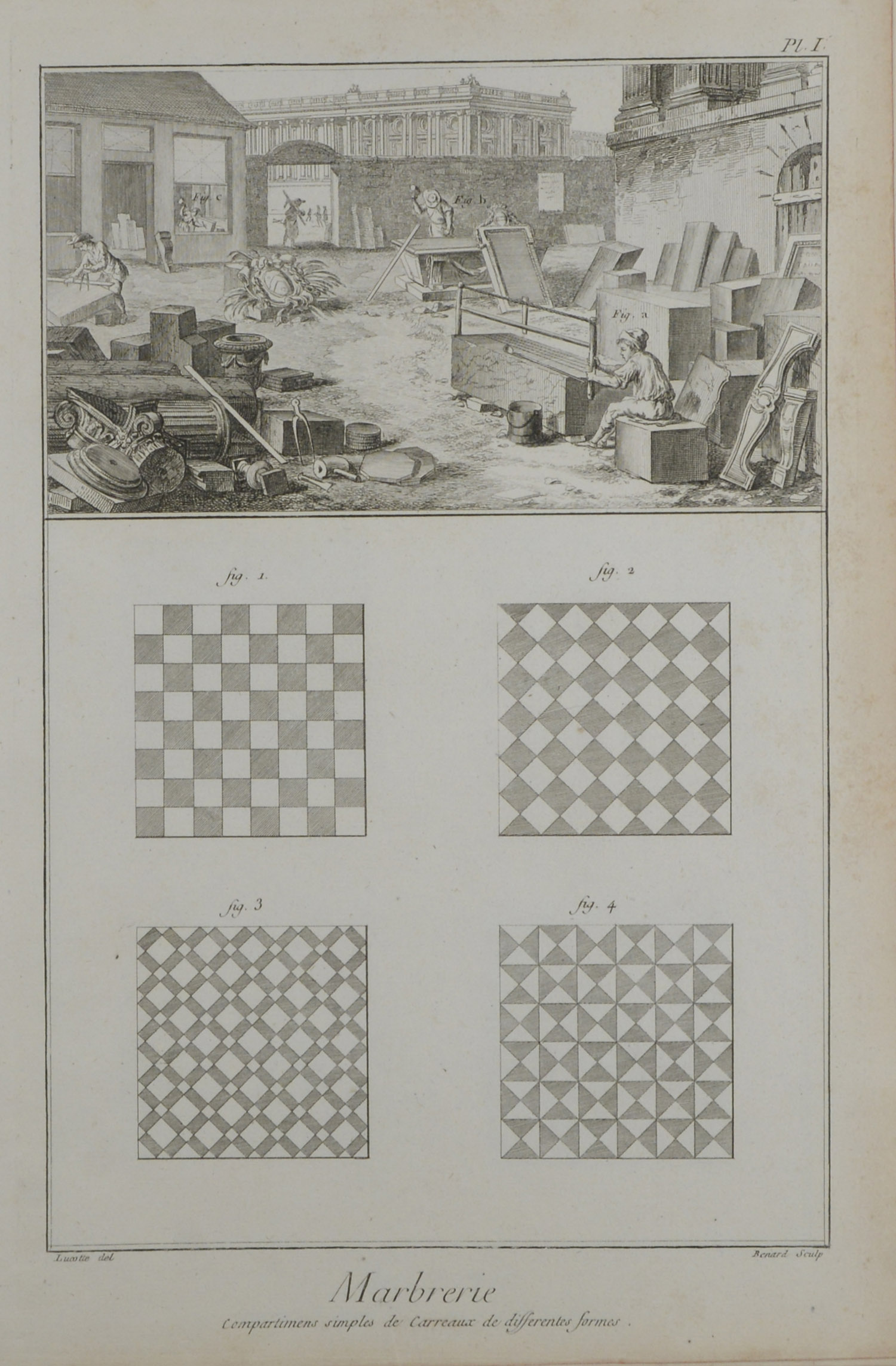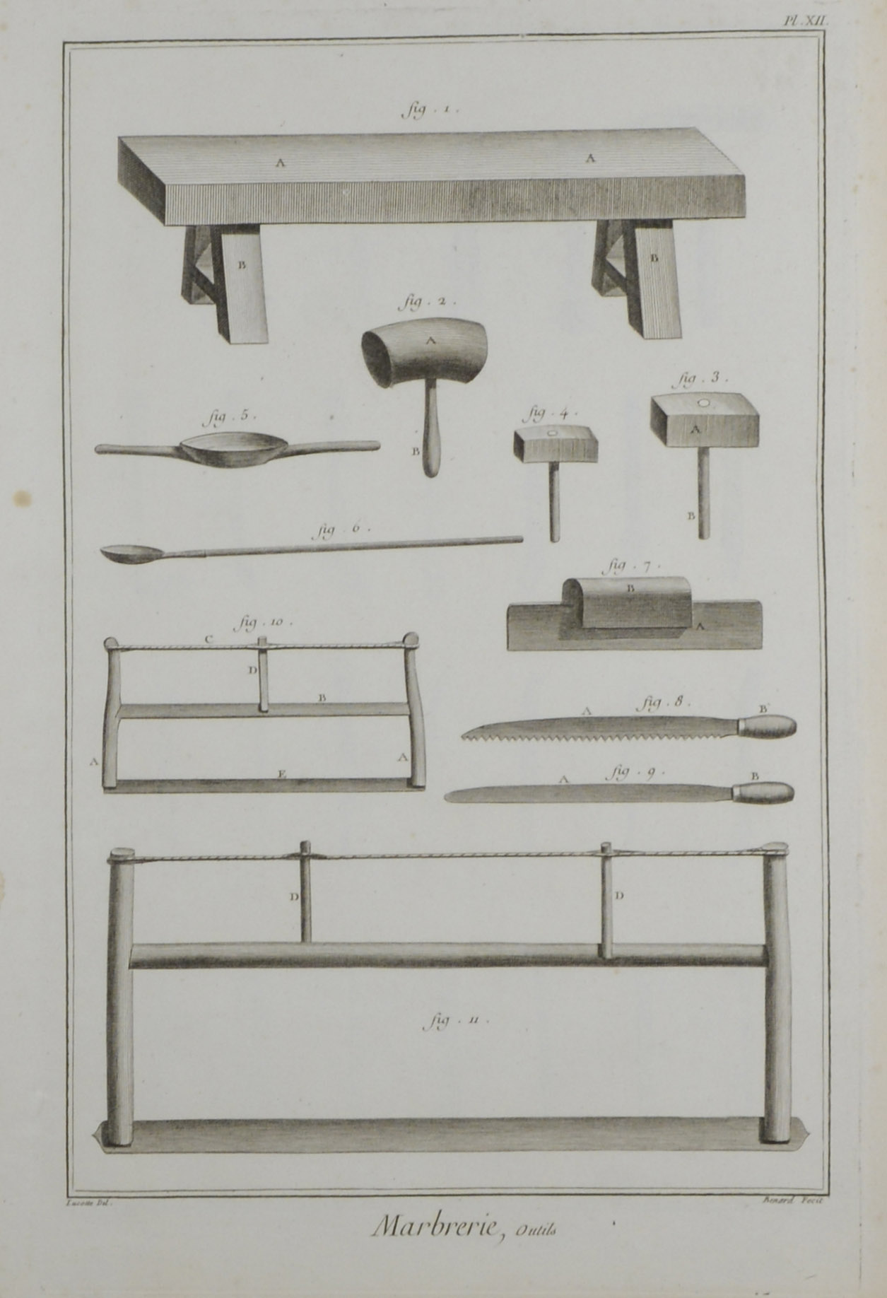 MARMORBEARBEITUNG (Marbrerie). 1762-1777. 14 (davon 3 doppelblattgroße) Kupferstiche und 1 Textblatt aus Diderot und d’Alembert: Encyclopedie, ou Dictionnaire Raisonne des Sciences, des Arts, et des Metiers. Je ca. 32 x 21 bzw. 32 x 42,5. Lose mit alten Heftspuren. Erstes Blatt gering fleckig.