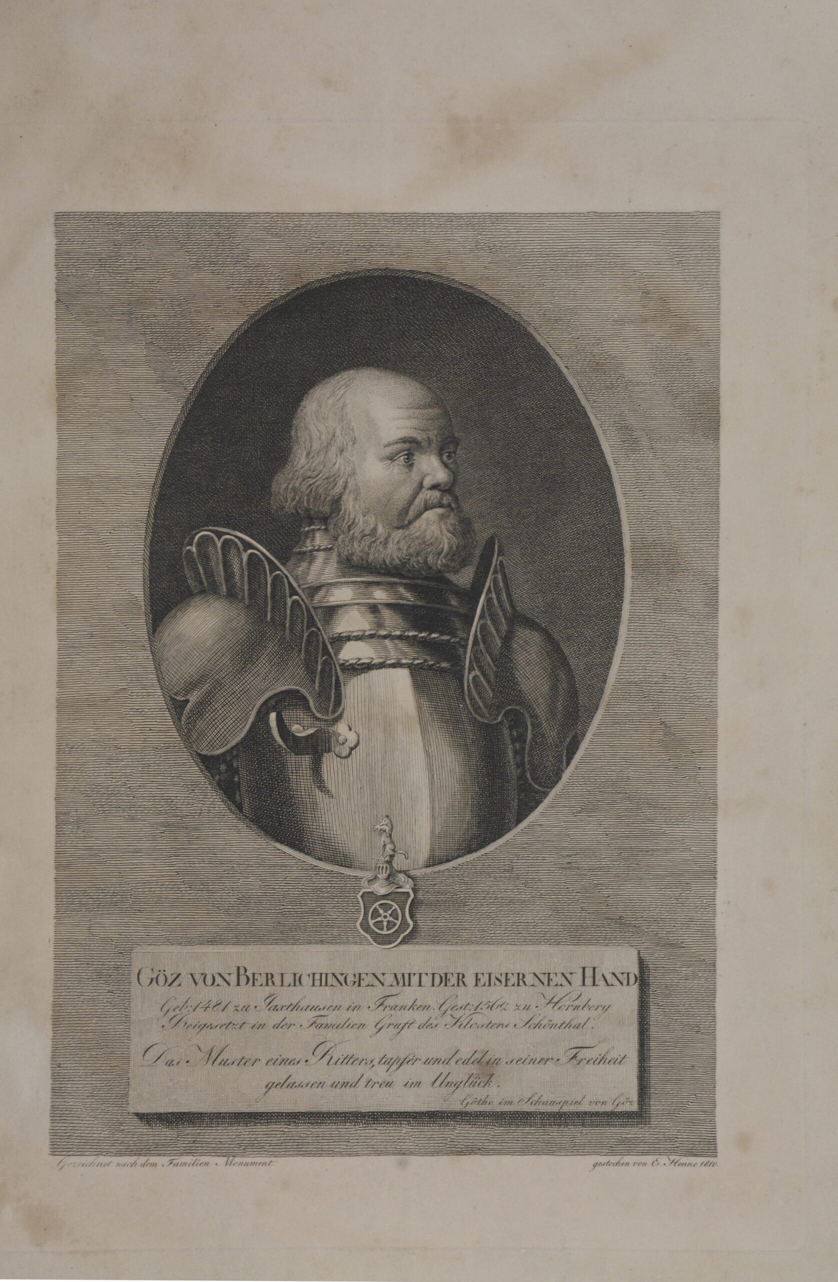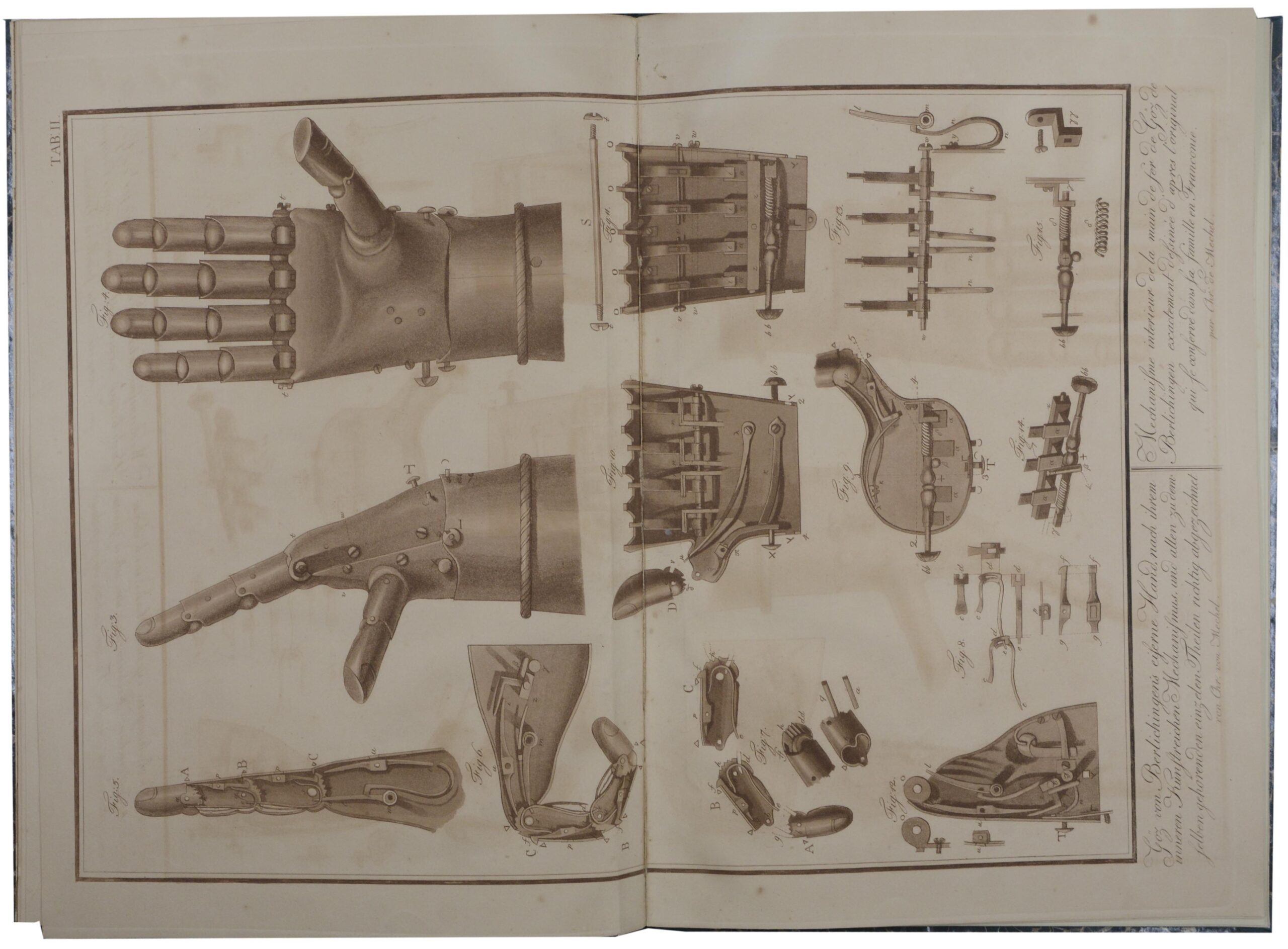 Erste Ausgabe. – Slg. Kippenberg 1636; Lipperheide Ra12. – Der Text beschreibt die Mechanik der berühmten Prothese, die zu ihrer Zeit keineswegs eine neue Erfindung darstellte, jedoch aufgrund der Geschichte ihres Trägers, die berühmteste ihrer Art ist. Es handelt sich hierbei um die zweite komplexere Mechanik. Eine erste, wesentlich grobere Hand war nach den eigenen Entwürfen des Ritters gefertigt worden. Des weiteren eine Lebensgeschichte des Ritters, sowie zwei Seiten mit Zitaten und Versen aus der deutschen Literatur, die sich auf die eiserne Hand beziehen. – Die beiden großen Aquatintatafeln in Sepia, gestochen von Christian Mechel, zeigen die Hand in ihrer natürlichen Größe, sowie detailliert die Technik derselben. – Mit einem gestochenen Porträt, nach dem Familienmonument von E.Henne und einer Ansicht von Burg Jagsthausen von und nach Carl G. Brühl. – Etwas stockfleckig und gebräunt, Im Bug teils angerändert bzw. verstärkt, Ex-Libris (Rudolf Korn) auf Innendeckel.