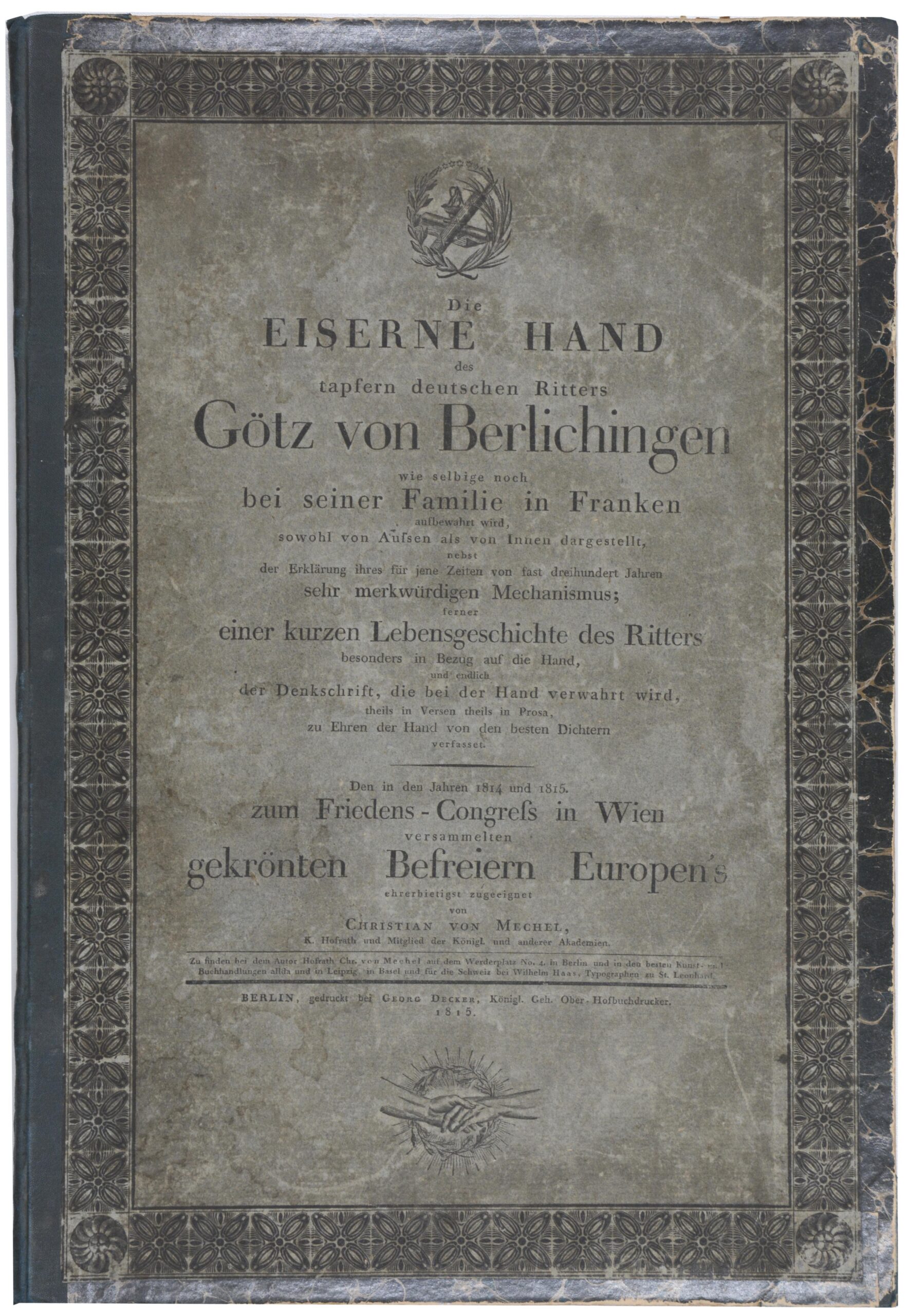 MECHEL, Christian von.  Die Eiserne Hand des tapfern deutschen Ritters Götz von Berlichingen wie selbige noch bei seiner Familie in Franken aufbewahrt wird, sowohl von Aussen als von Innen dargestellt, nebst der Erklärung ihres für jene Zeiten… sehr merkwürdigen Mechanismus… Den in den Jahren 1814 und 1815 zum Friedens-Congress in Wien versammelten gekrönten Befreiern Europen’s ehrerbietigst zugeeignet. Berlin, Georg Decker, 1815. Groß-Folio. Titel, 10 S., mit gestochenem Portät, 2 doppelblattgroßen Aquatintatafeln und 1 Kupferradierung. Halbleinen der Zeit mit montiertem Vorderumschlag der Originalbroschur auf dem Vorderdeckel, (etwas berieben und bestoßen).