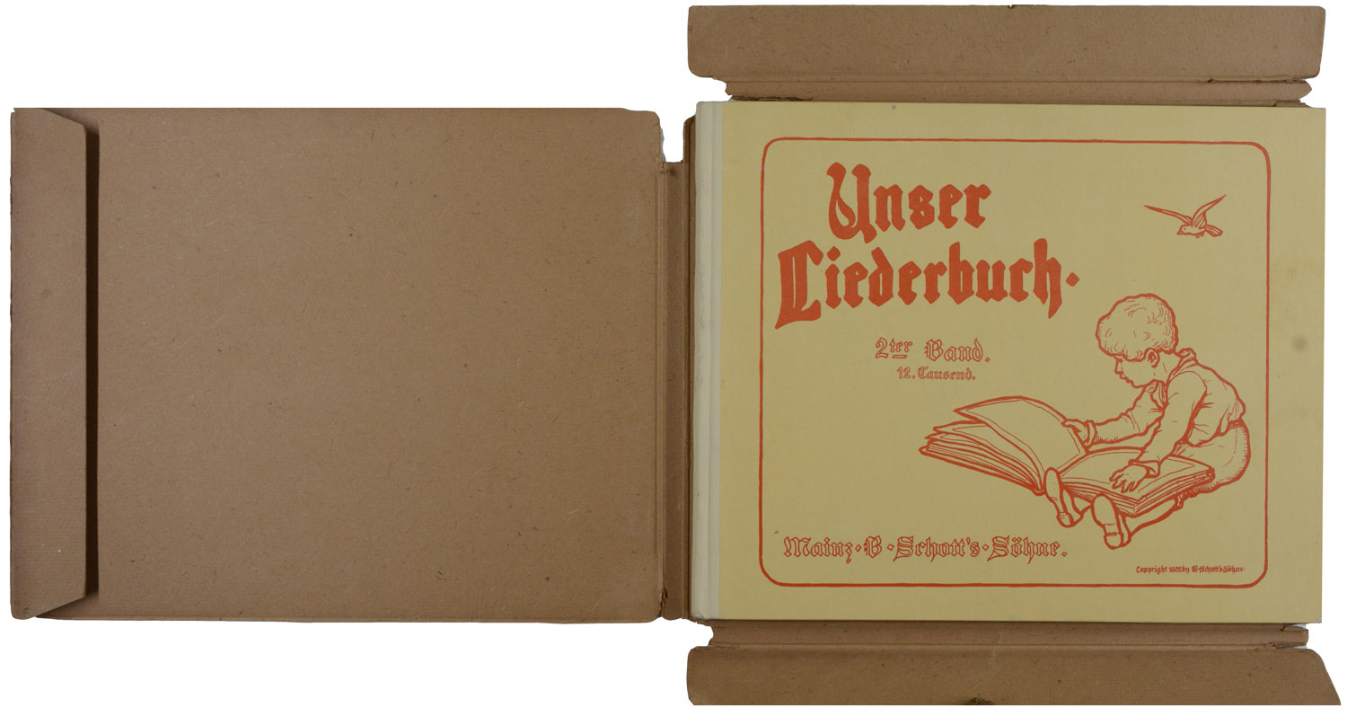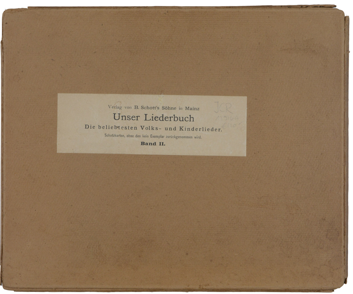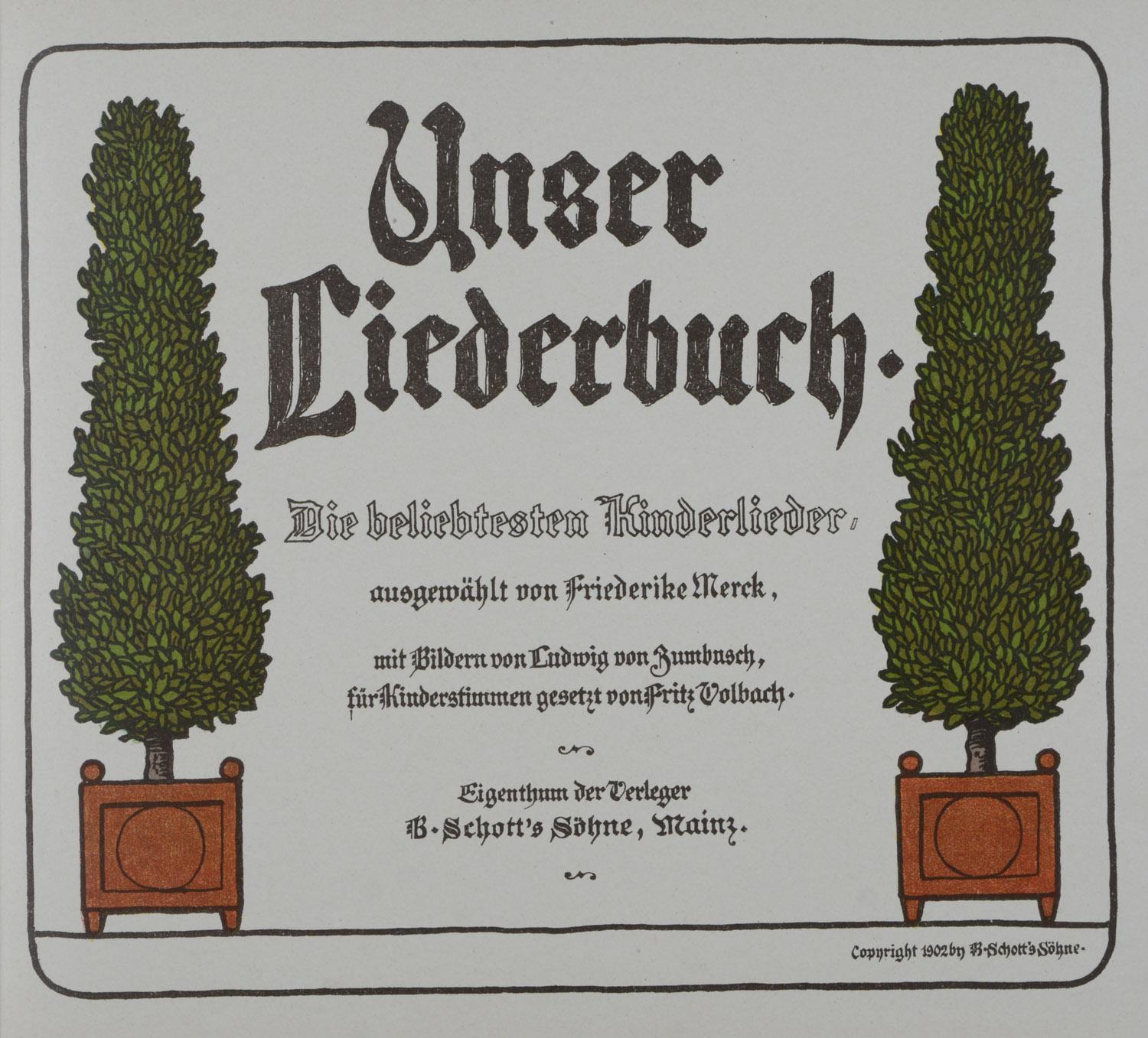 MERCK, Friederike. Unser Liederbuch. 2ter Band. Die beliebtesten Kinderlieder. Für Kinderstimmen gesetzt von Fritz Volbach. Mainz, Schott’s Söhne, (um 1905). 12. Tausend. Quer-4°. 44 S., mit farblithographischen Illustrationen und Buchschmuck von Ludwig von Zumbusch. Originalhalbleinen mit Deckelillustration in Originalkarton, (minimal unfrisch, Karton berieben und mit Einrissen):