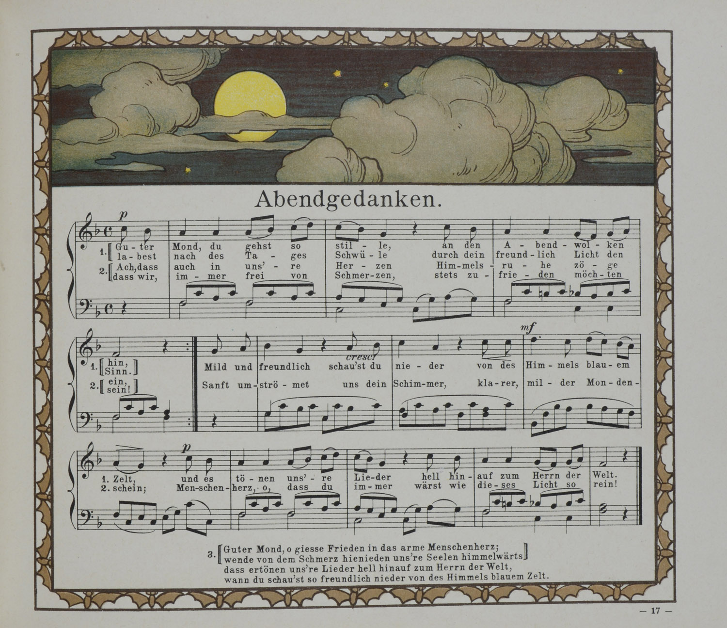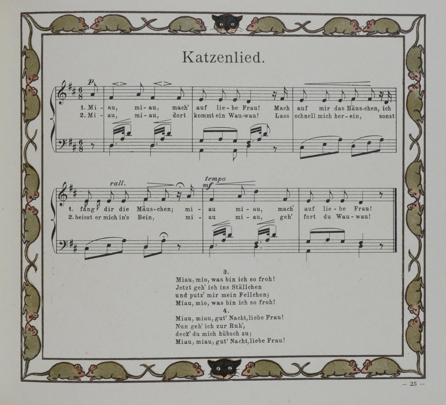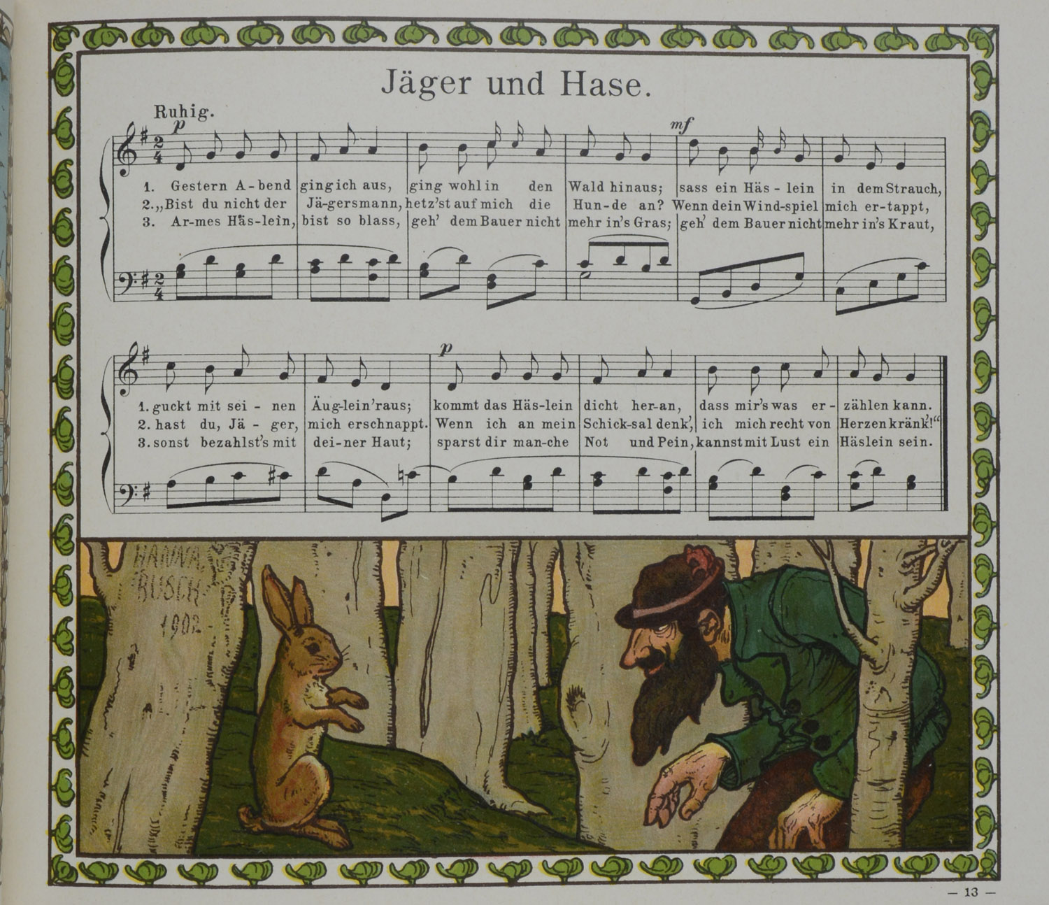 Wohl dritte Auflage. – Vgl. Ries 993, 1; Doderer IV, 557. – Ein bis heute immer wieder aufgelegtes Kinderliederbuch. – Mit den vom Jugendstil beeinflussten Illustrationen des Münchener Malers und Illustrators Ludwig von Zumbusch, der Mitglied der Münchener Sezession war. – Sehr gutes Exemplar.